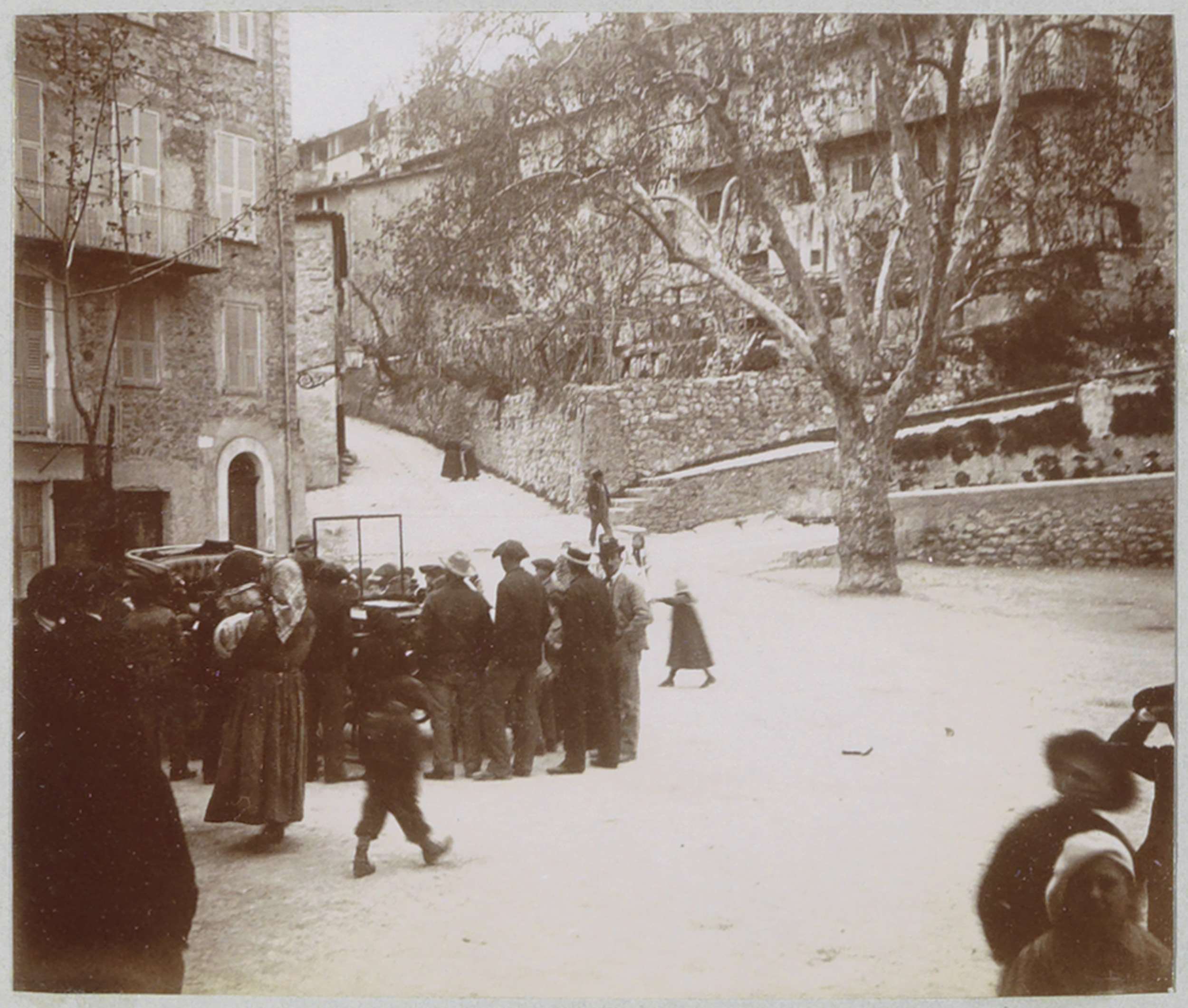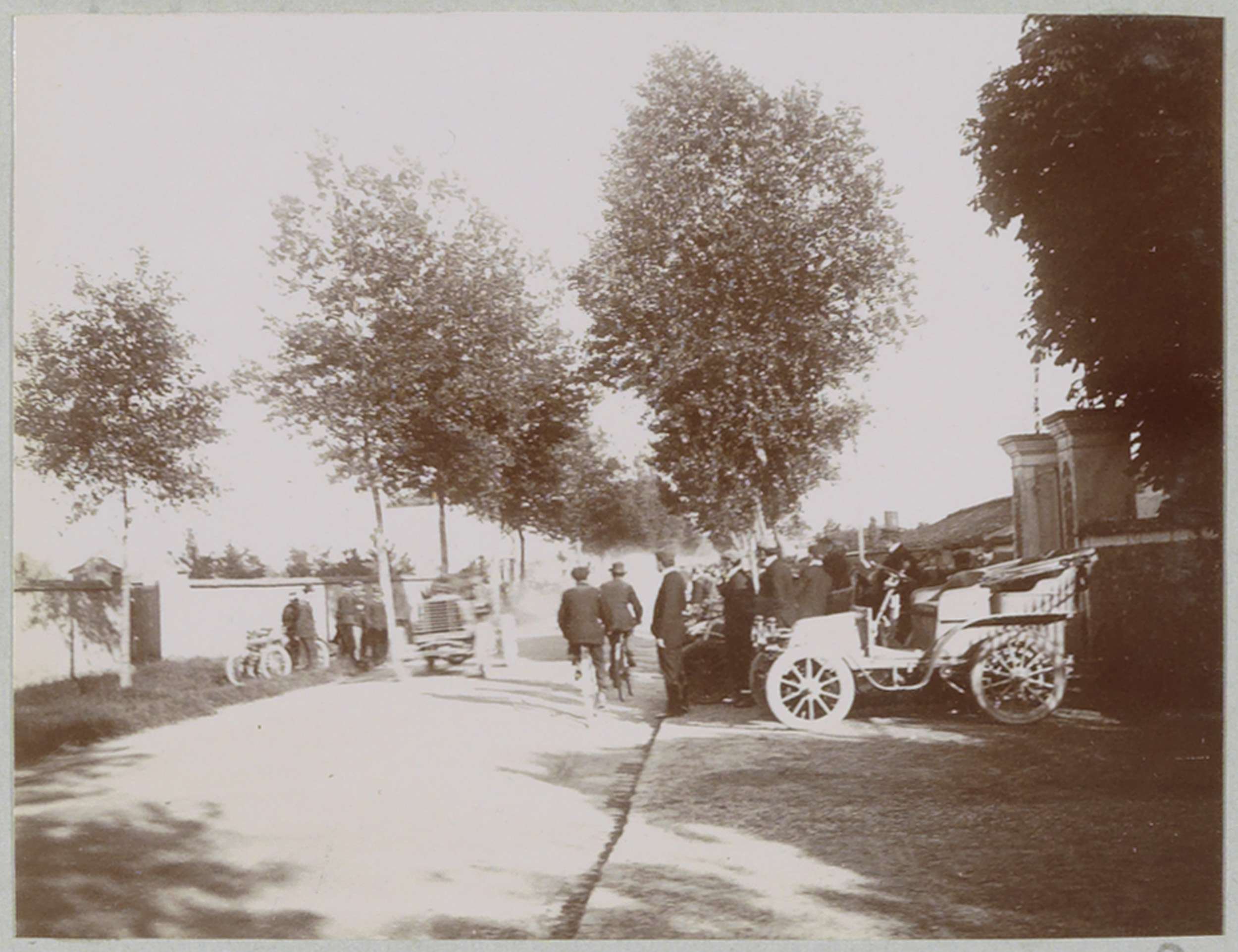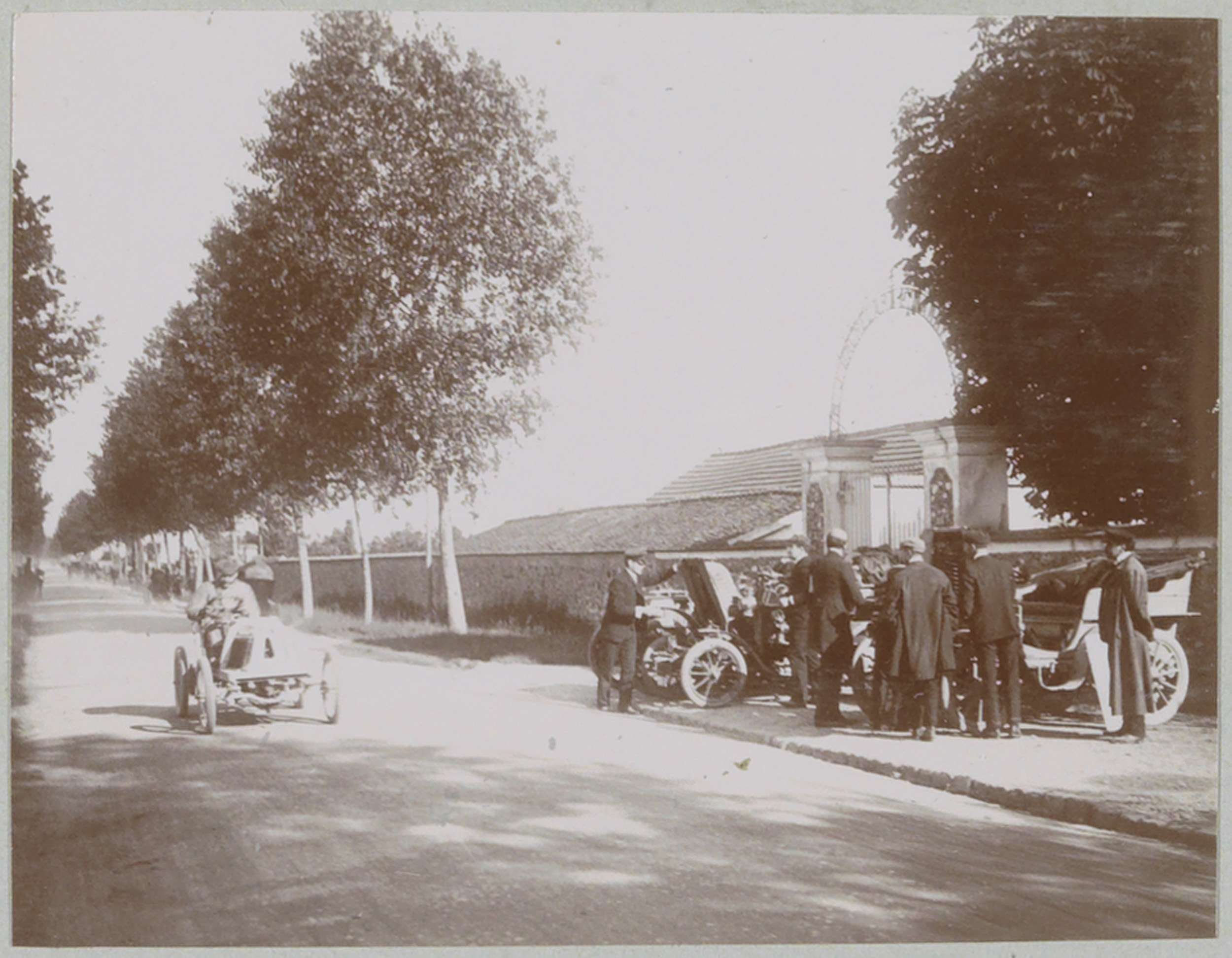Toeschouwers en deelnemer aan de race Parijs-Vienne