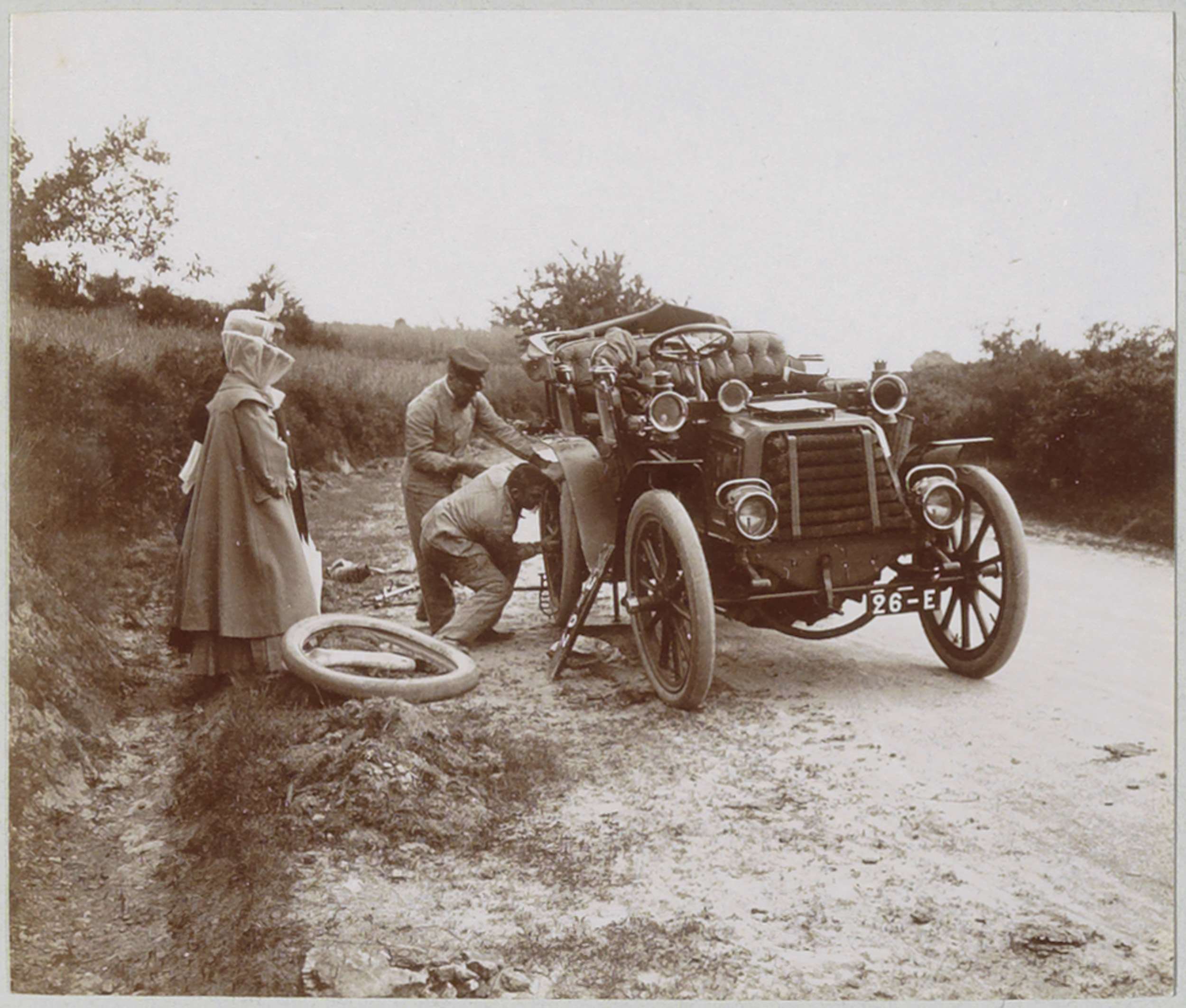 Gezelschap bij een automobiel op een weg, vermoedeli...