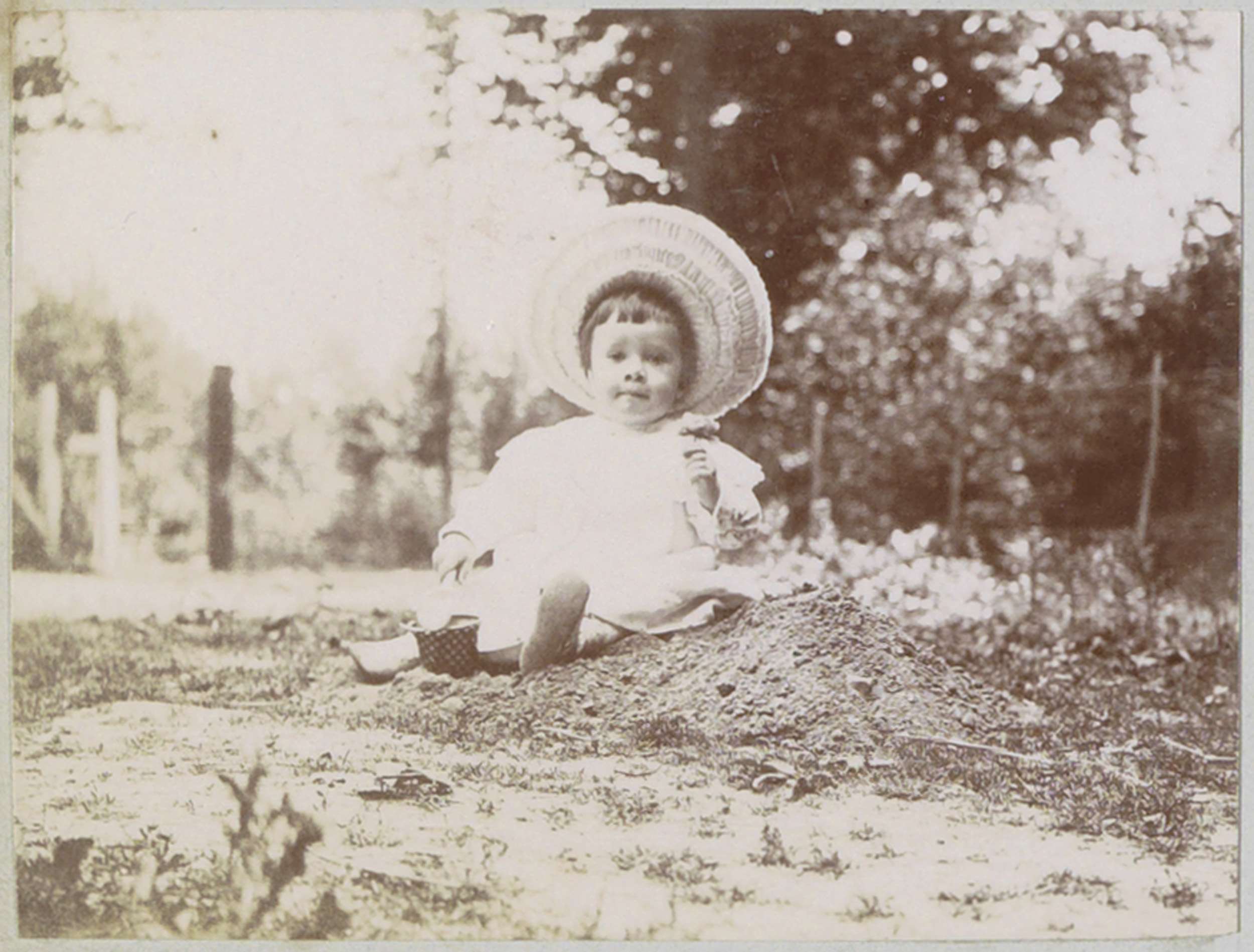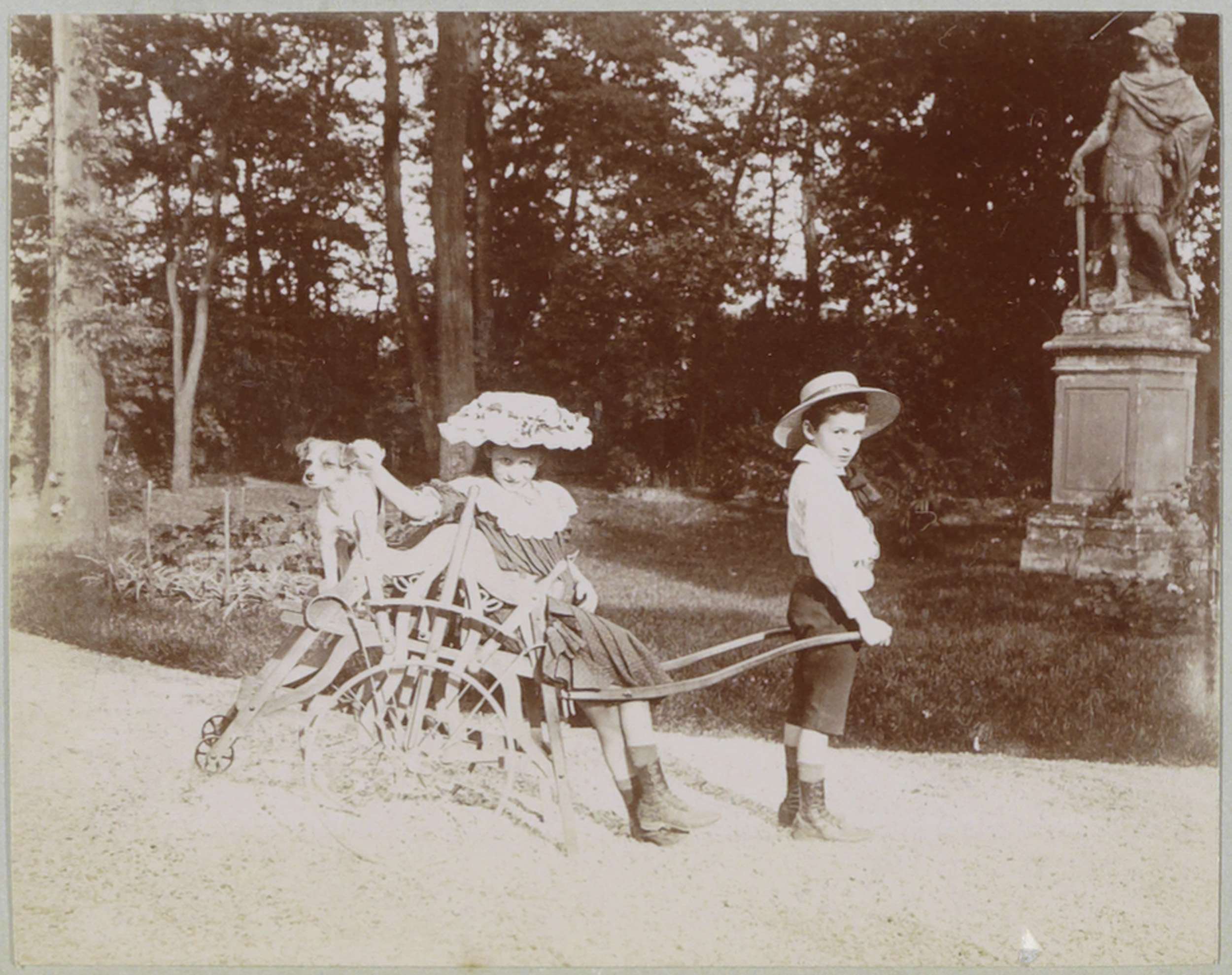 Jongen, meisje, hond en speelgoedkar in een tuin met...