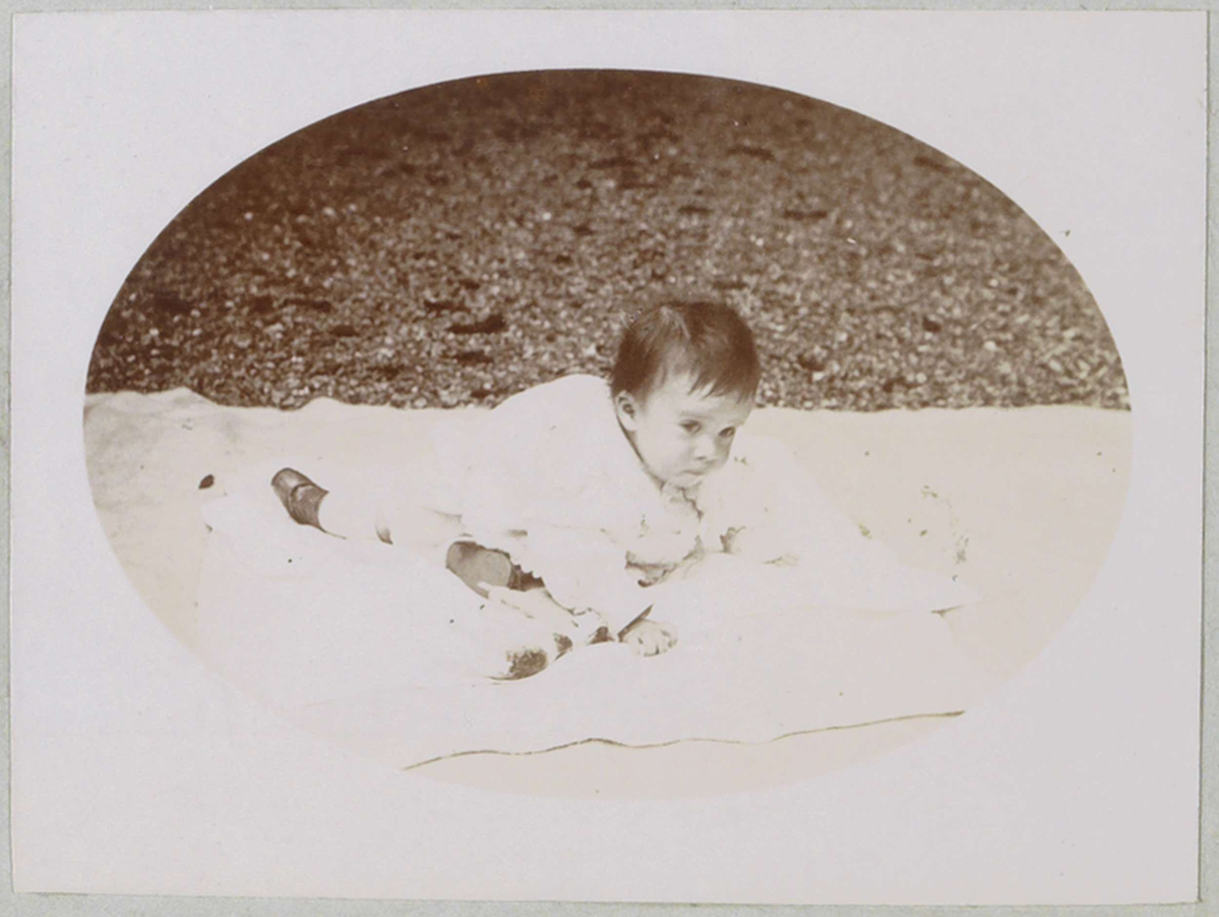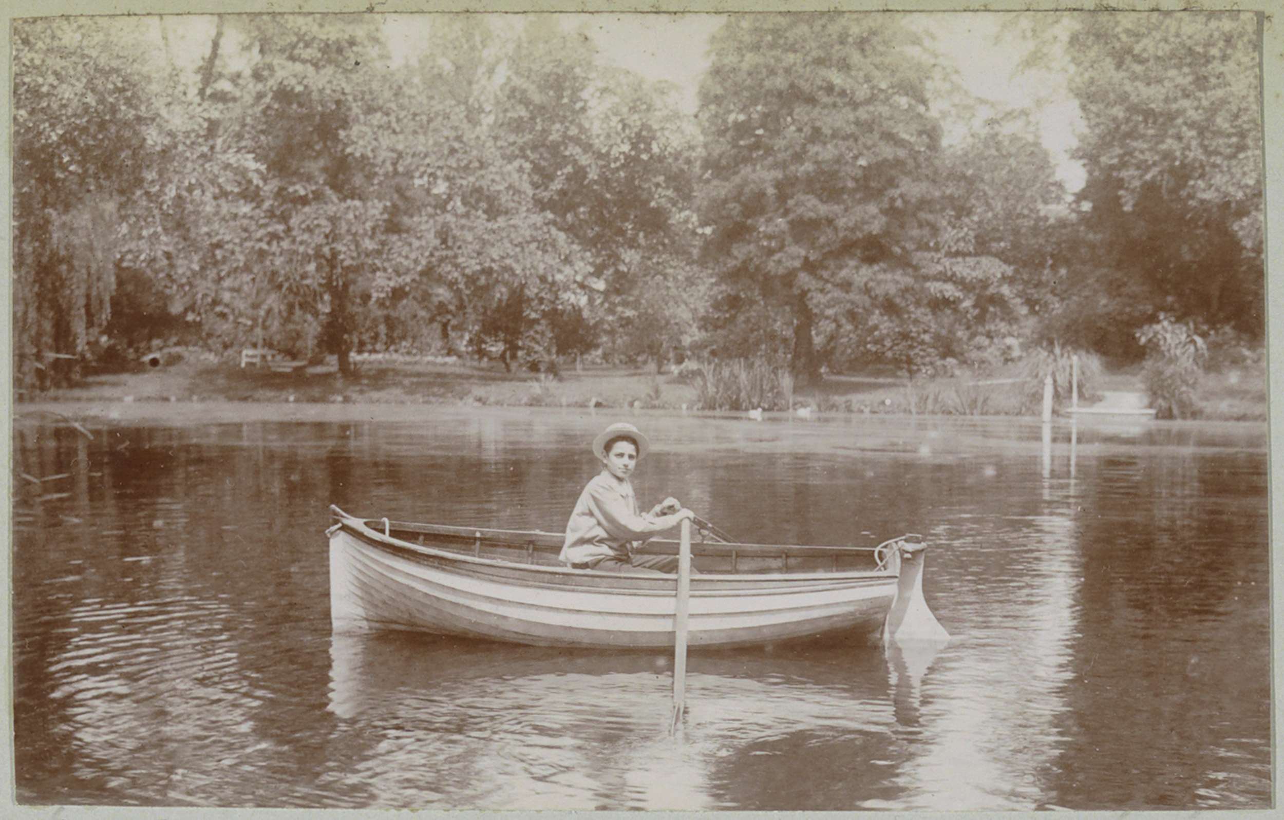 Jongen en meisje hand in hand op een tuinpad, vermoe...
