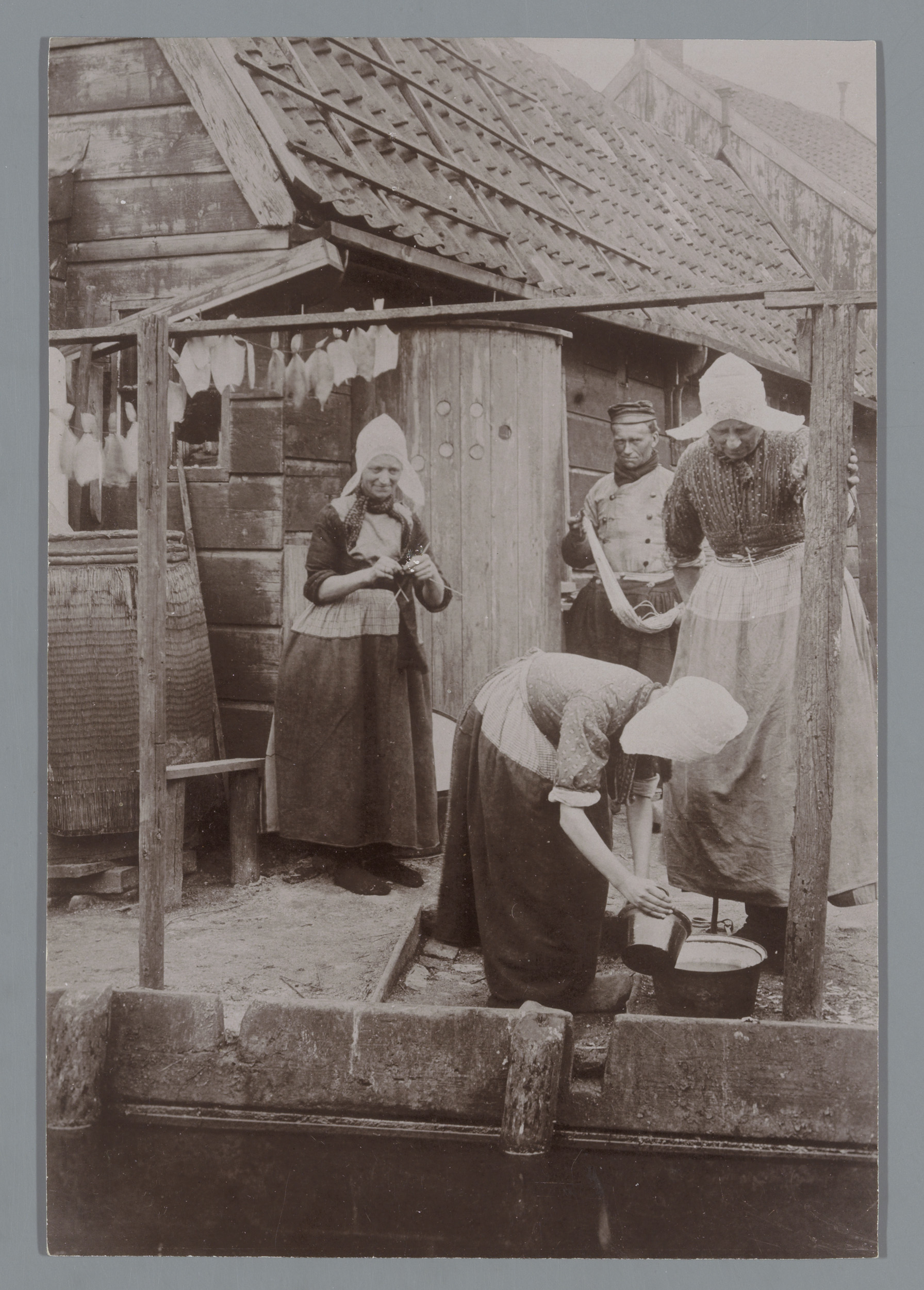 Portret van vrouwen en een man in klederdracht te Mu...