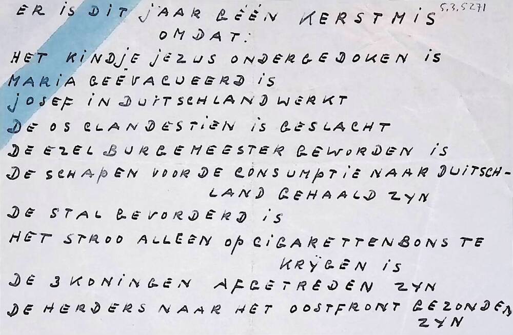 Vel met handgeschreven tekst: "Er is dit jaar geen k...