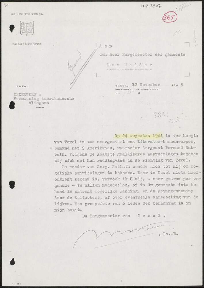 Rapport Burgemeester Den Helder 12 november 1945.