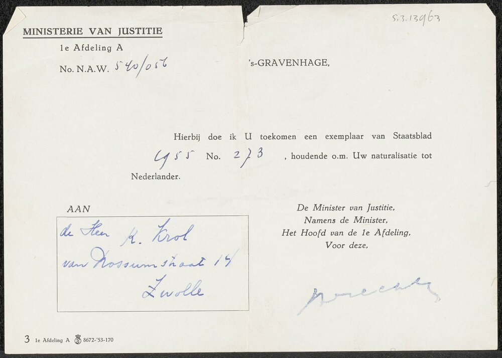 Brief van het Ministerie van Justitie aan Karol Krol...