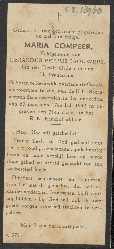 Bidprent Maria Compeer (Gouda 17 juli 1942)