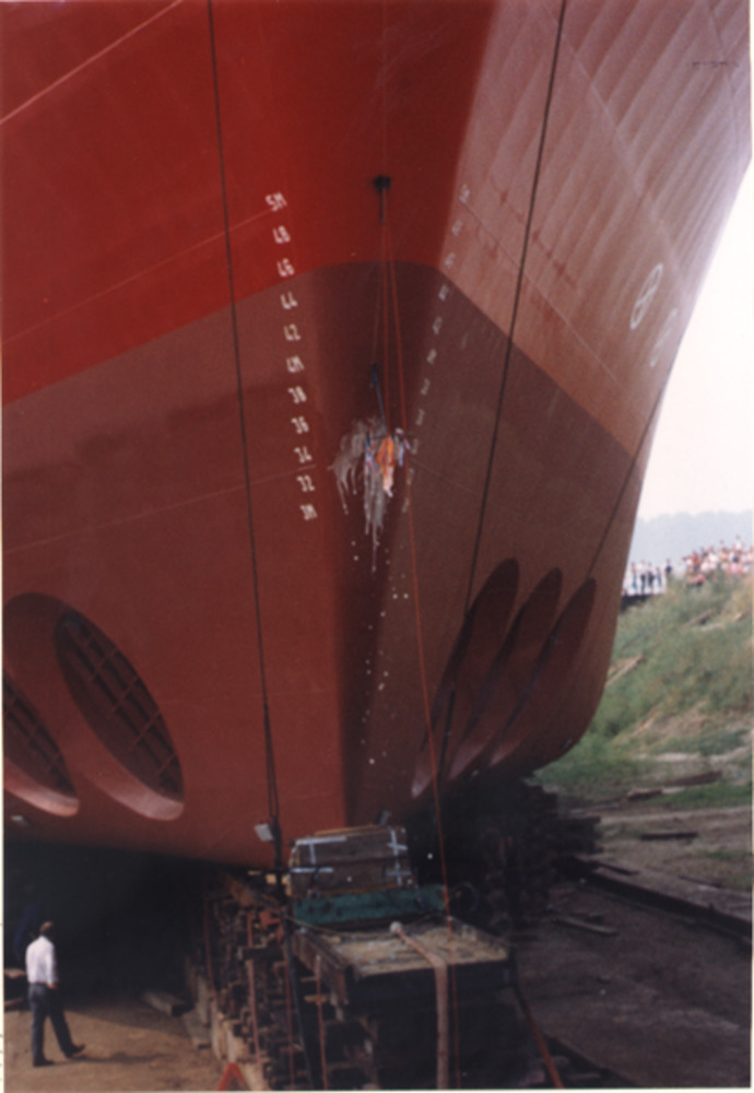 Kleurenfoto van de tewaterlating van de Deep Water 1...