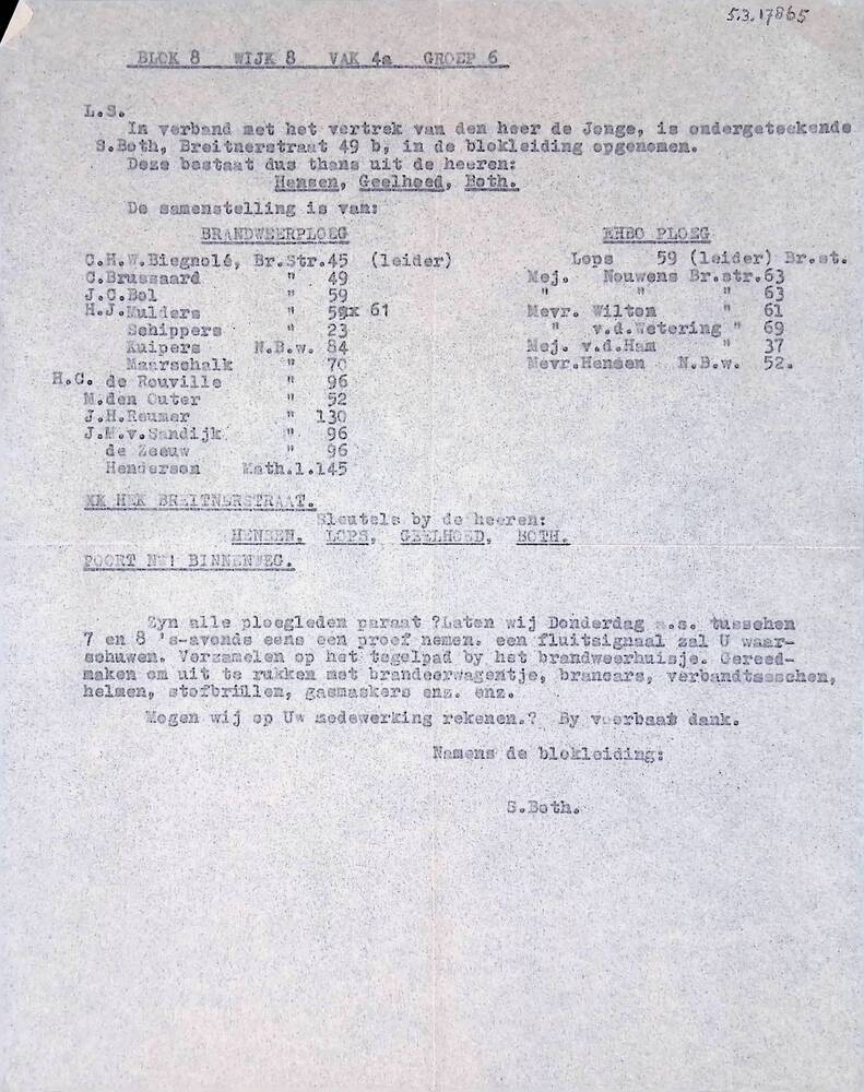 Doorslag van een brief van S. Both aan inwoners Blok...