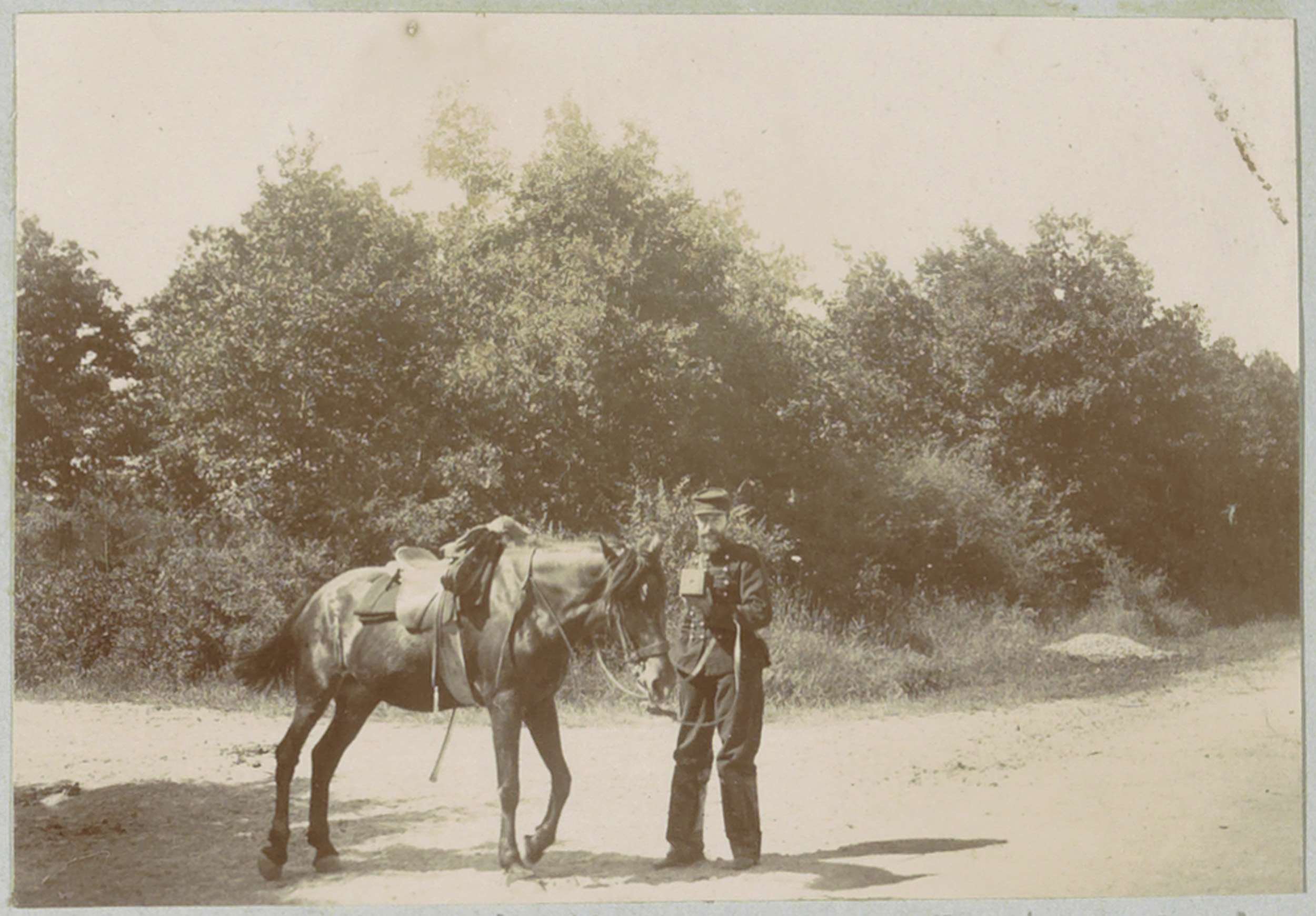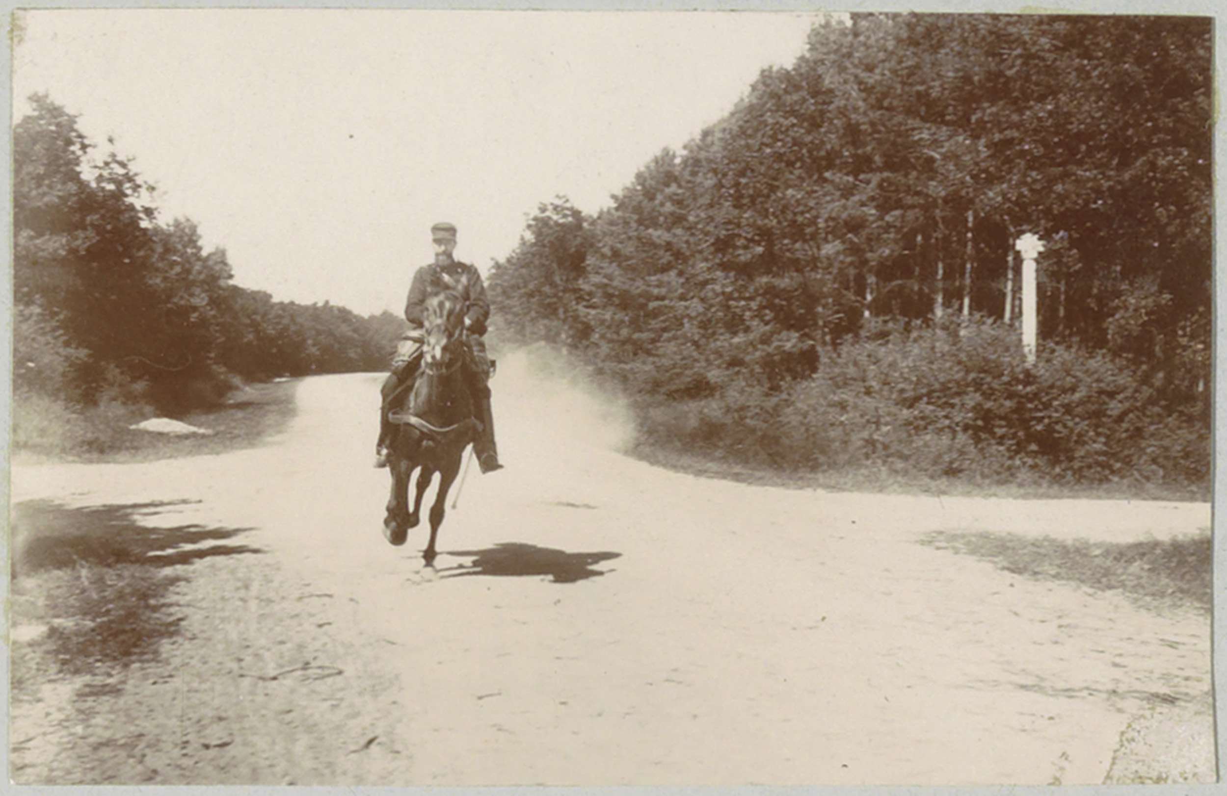 Geüniformeerde man te paard op een bospad, vermoedel...