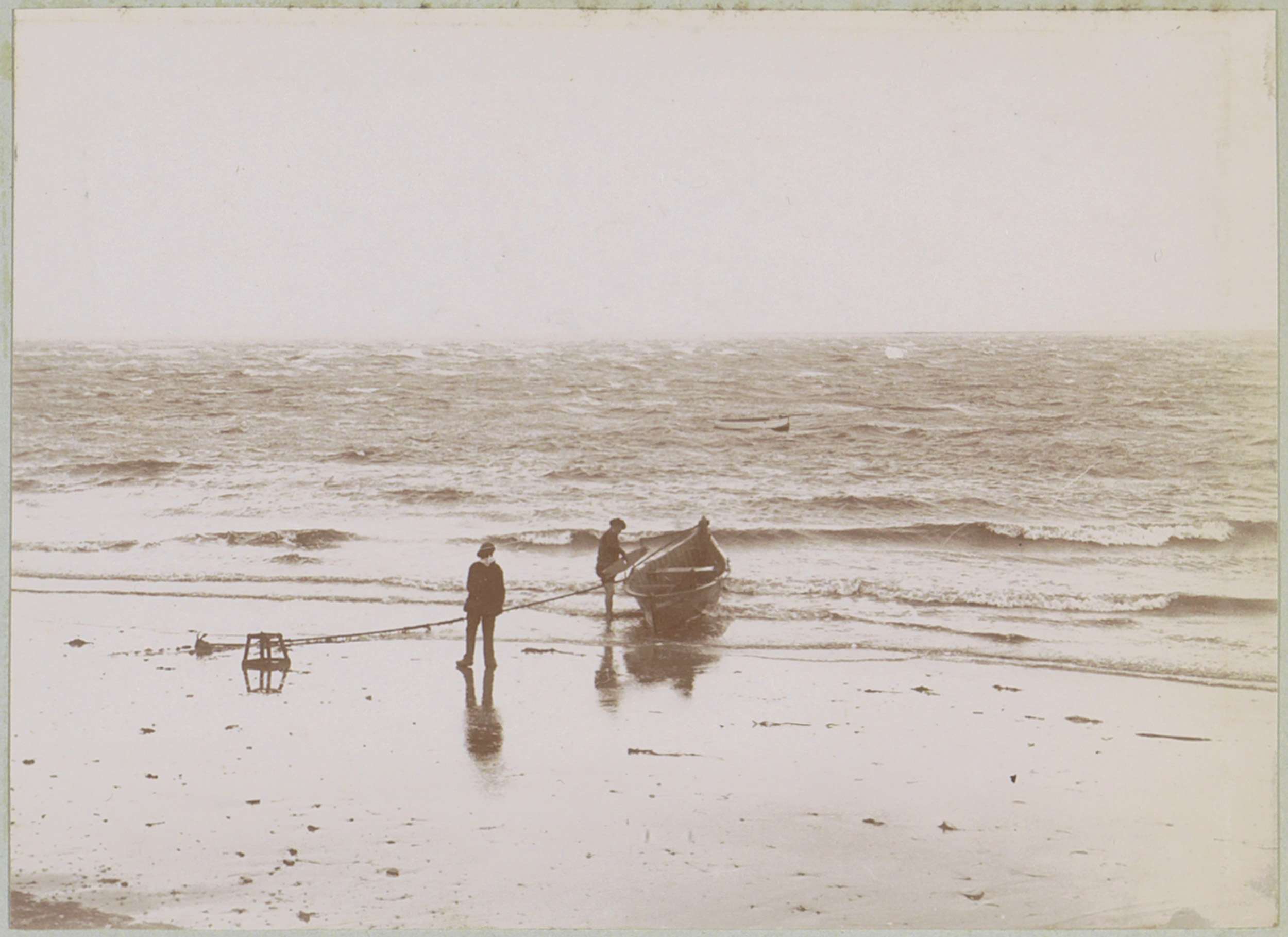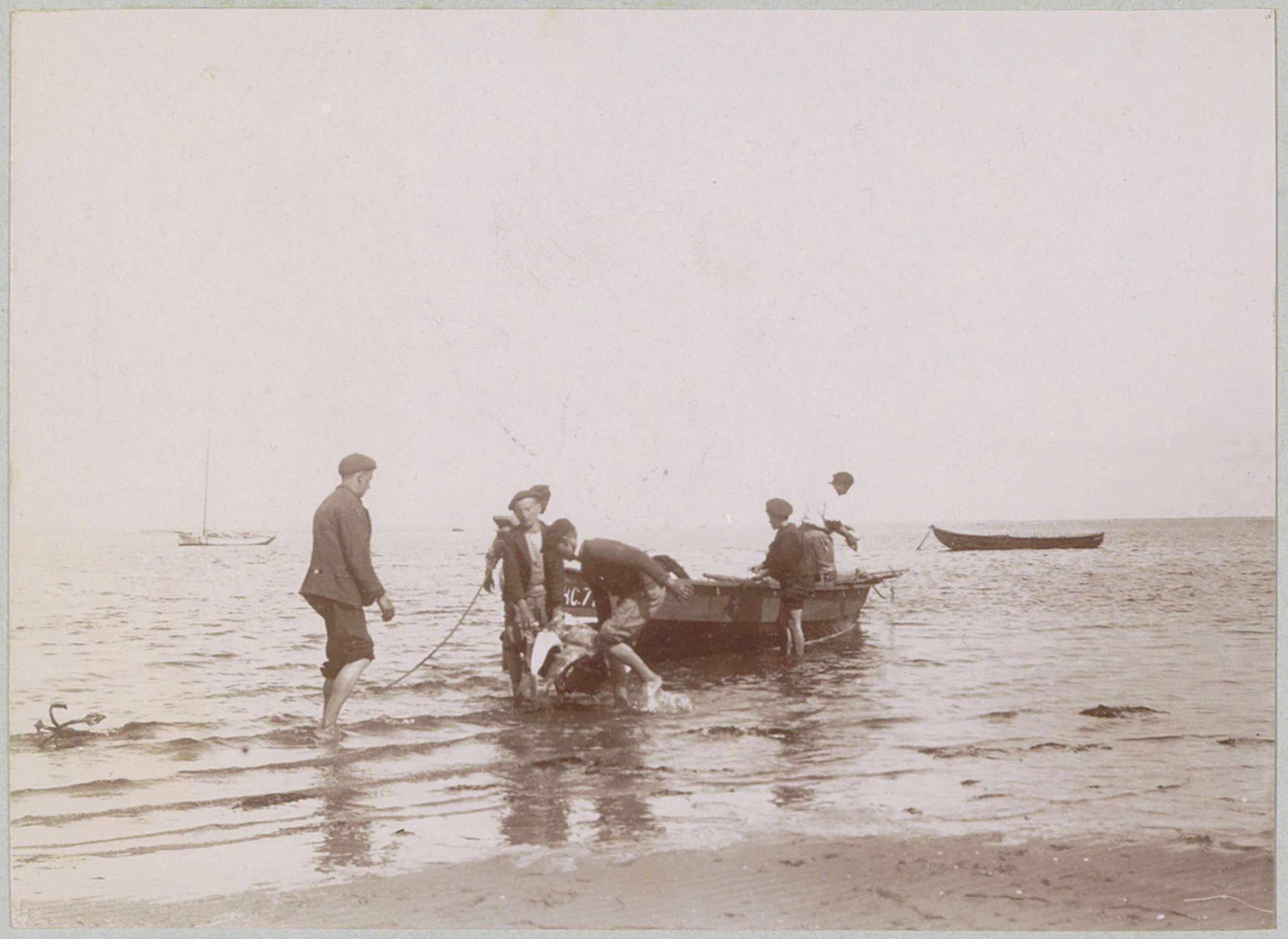 Vissers brengen roeiboot aan land, vermoedelijk bij ...