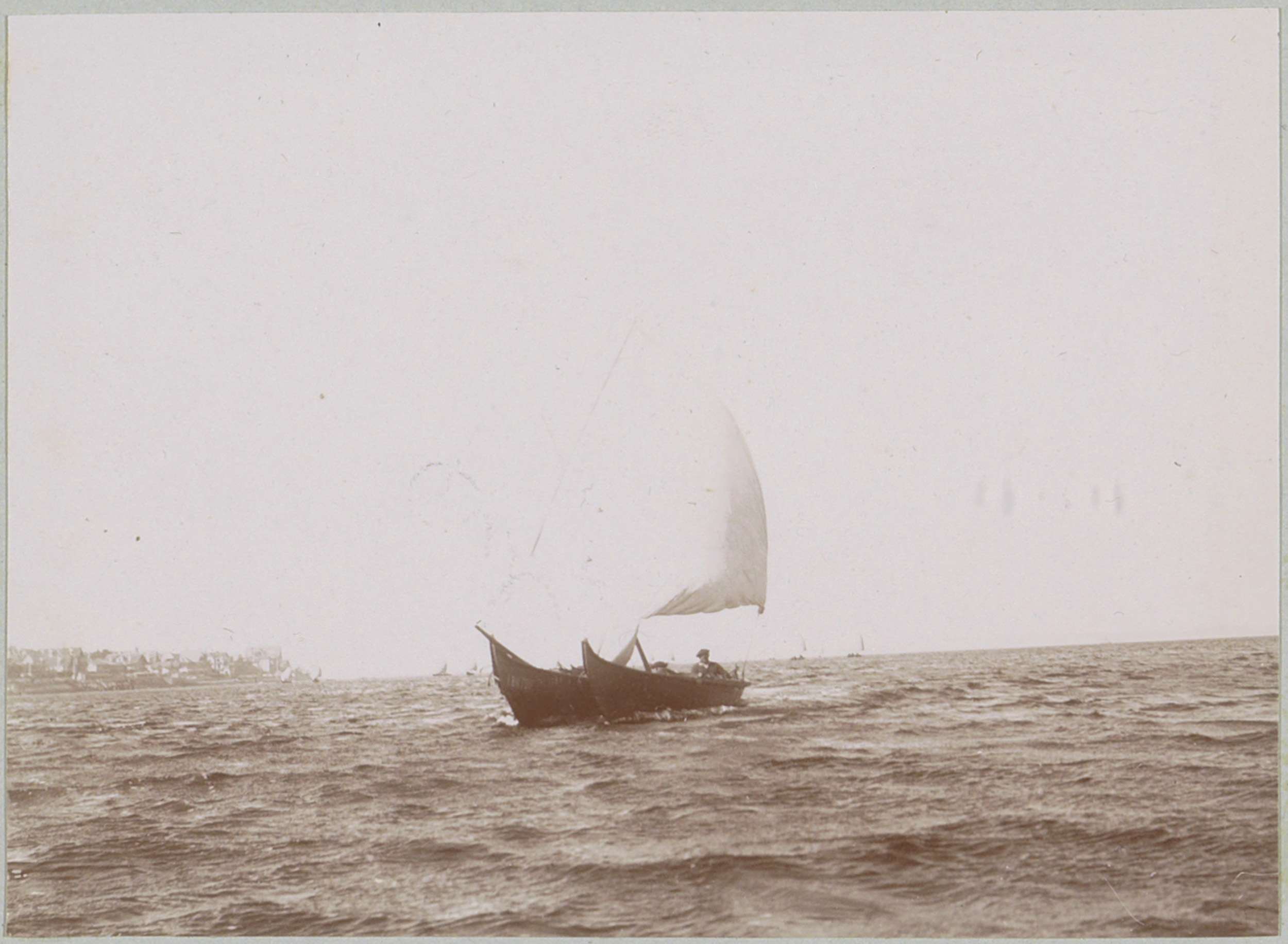 Zeilboten op zee, op de achtergrond vermoedelijk Arc...