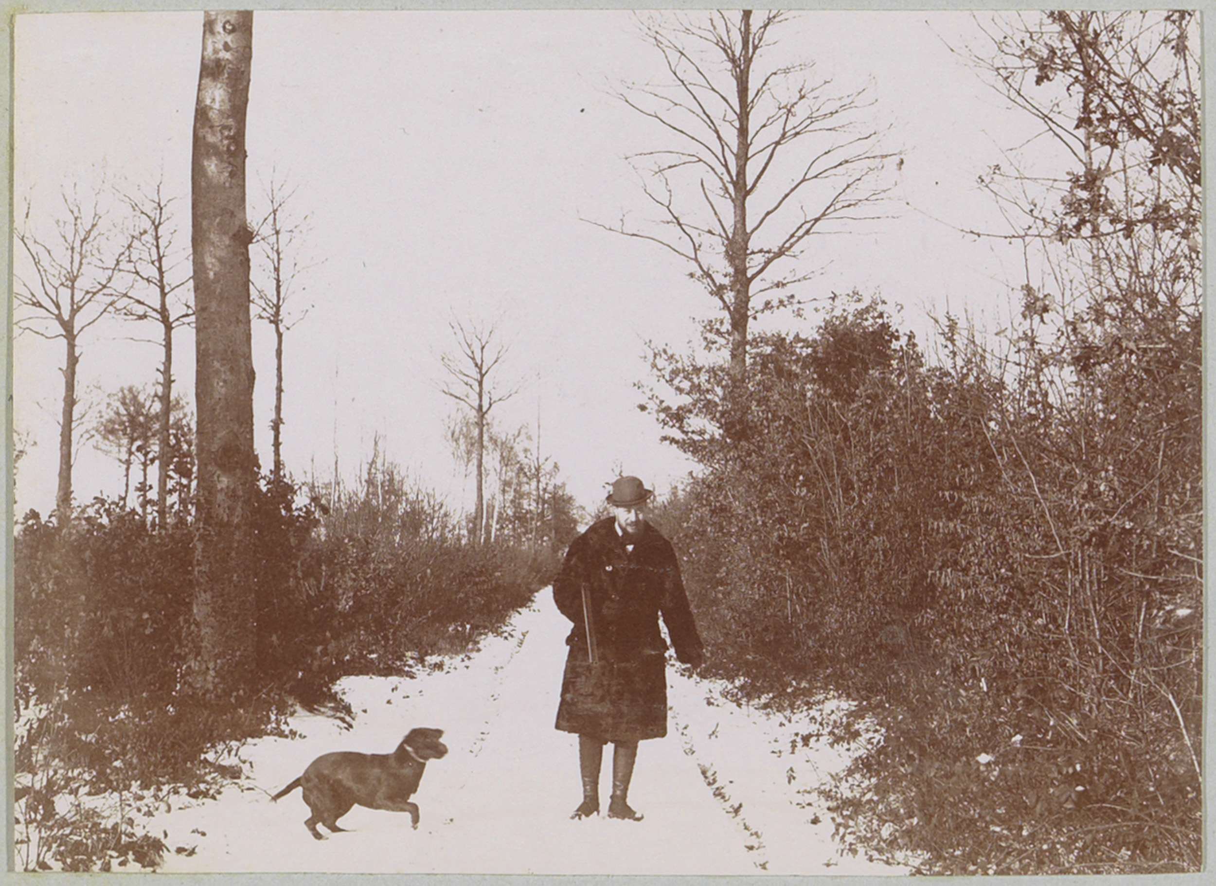 Jager met hond op besneeuwd pad, vermoedelijk bij Ar...