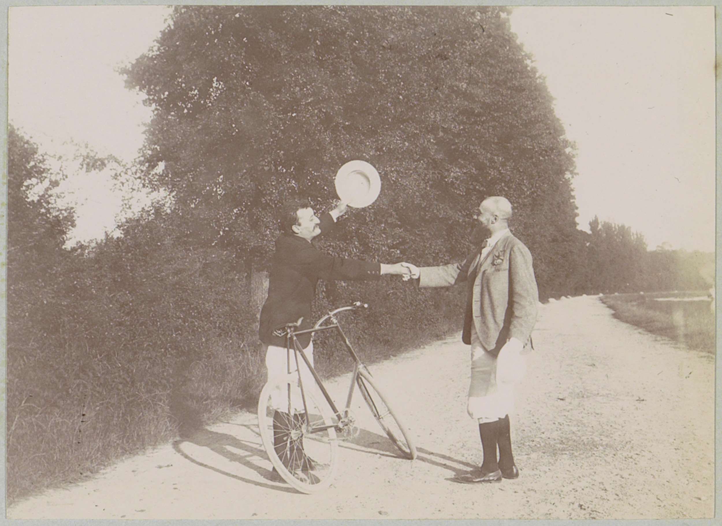 Fietser en wandelaar schudden elkaar de hand op een ...