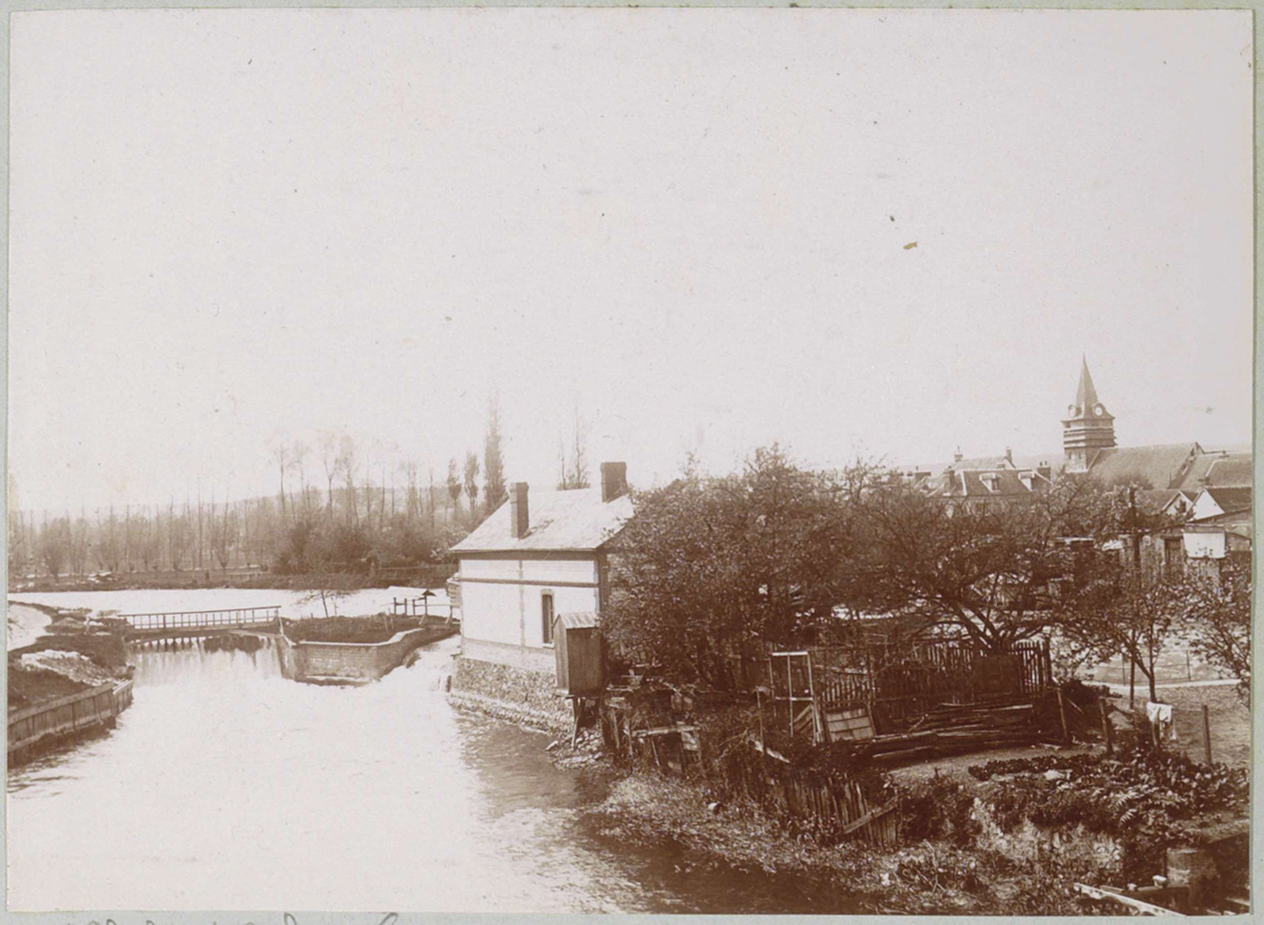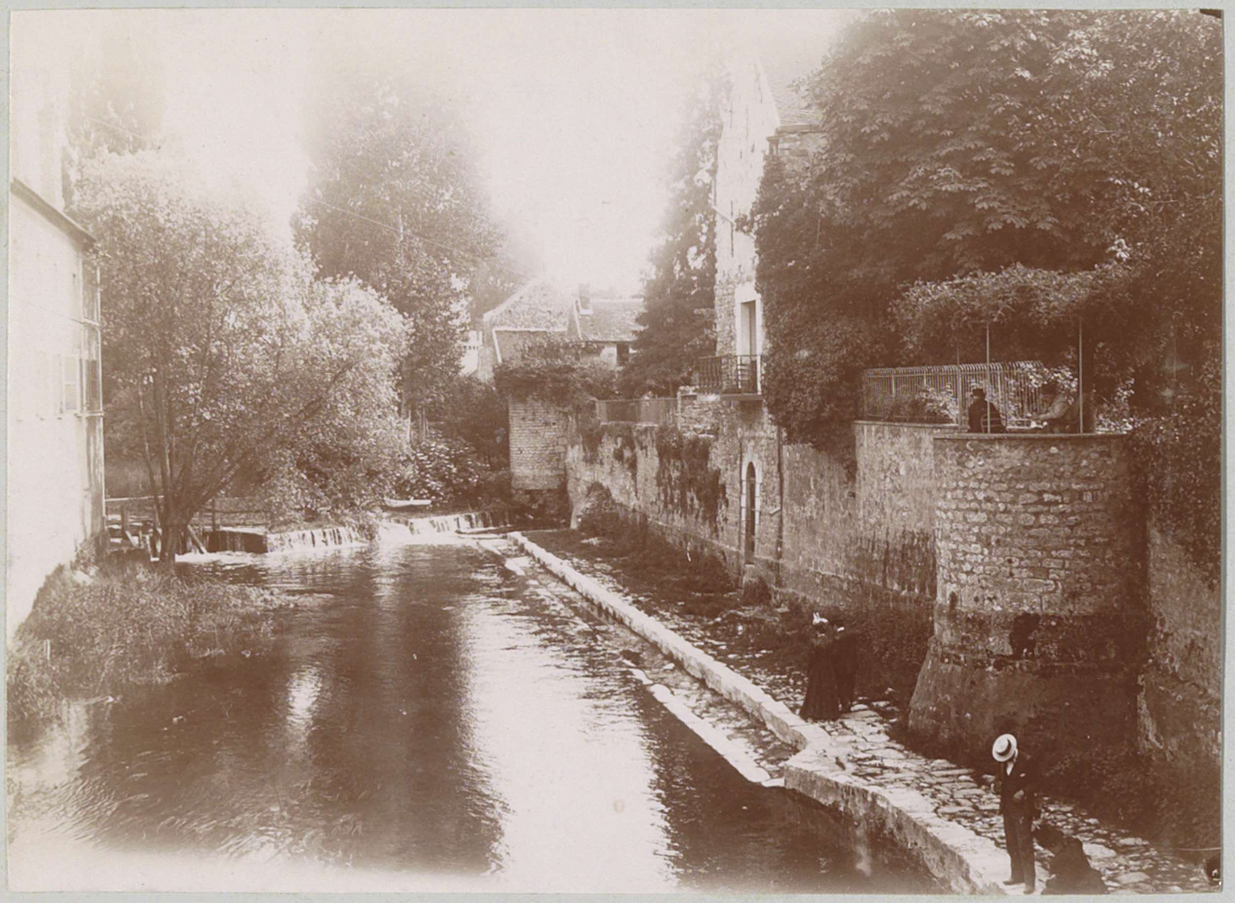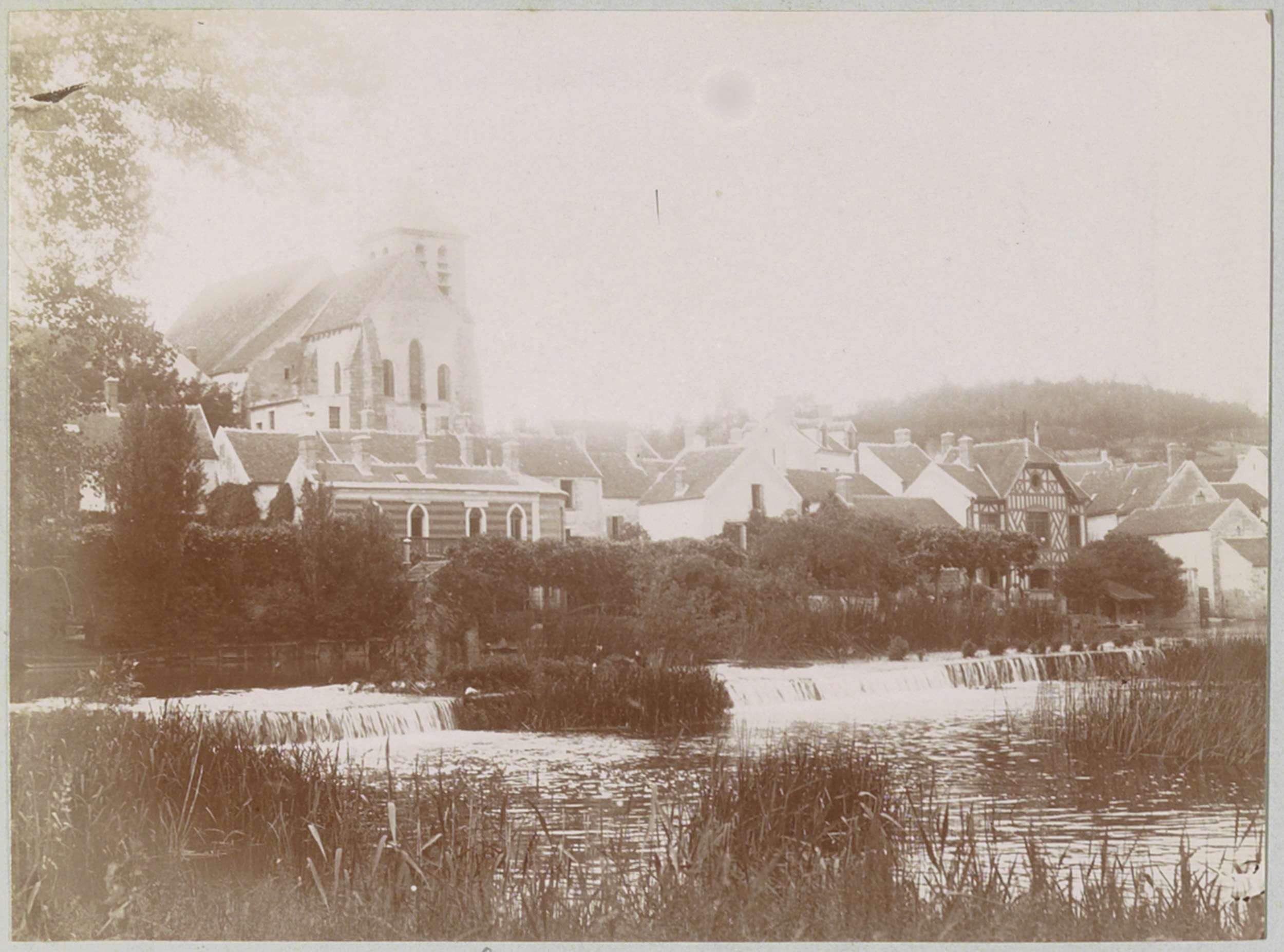 Gezicht op Montigny-sur-Loing met stroomversnelling ...