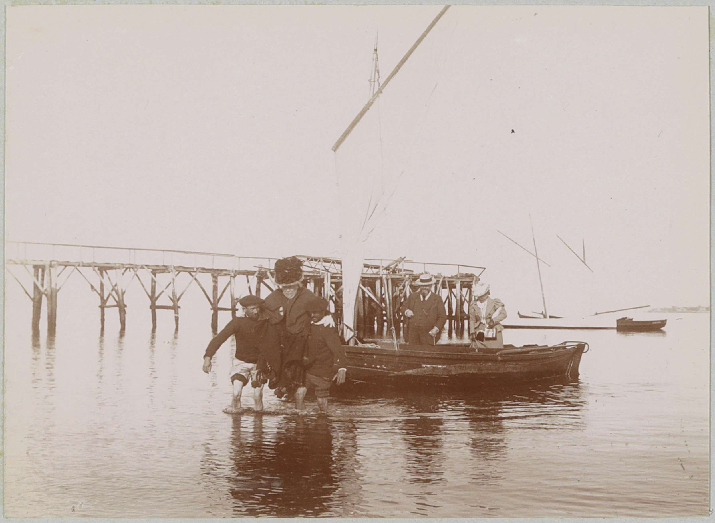 Vrouw wordt uit zeilboot naar de oever gedragen, ver...