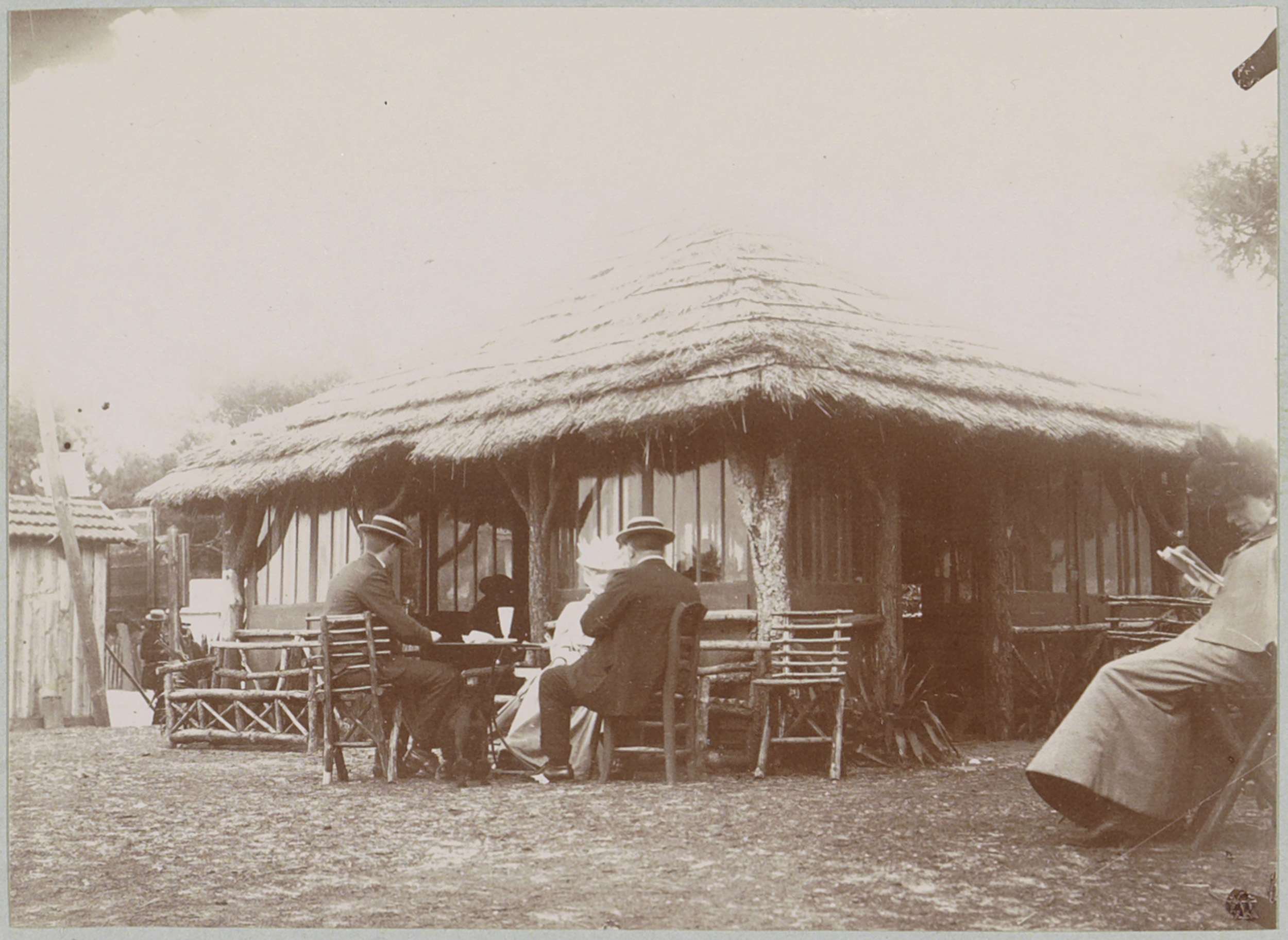 Gezelschap bij een uitspanning met rieten dak in Le ...