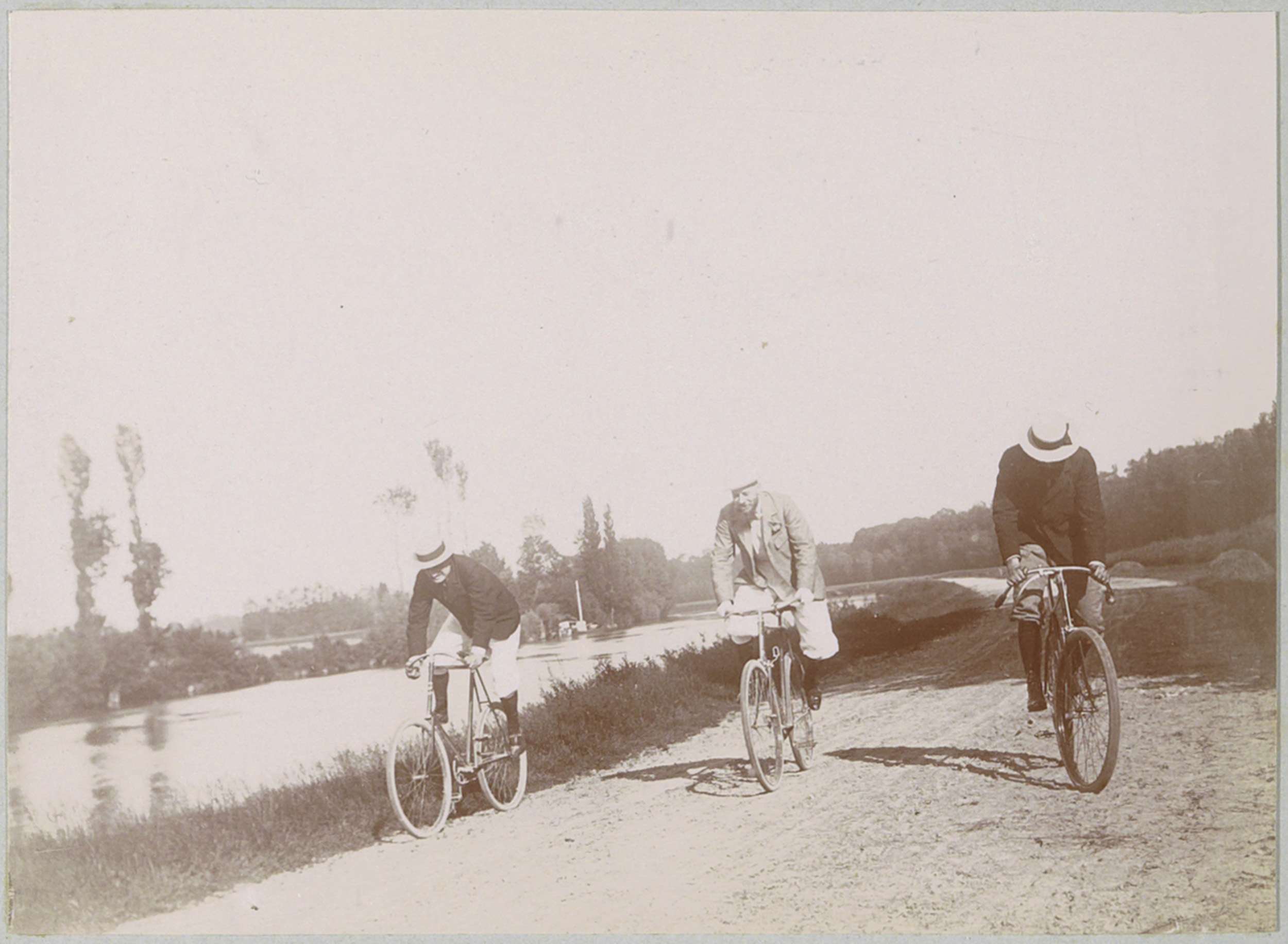 Drie mannen op fietsen langs een rivier bij Pontoise