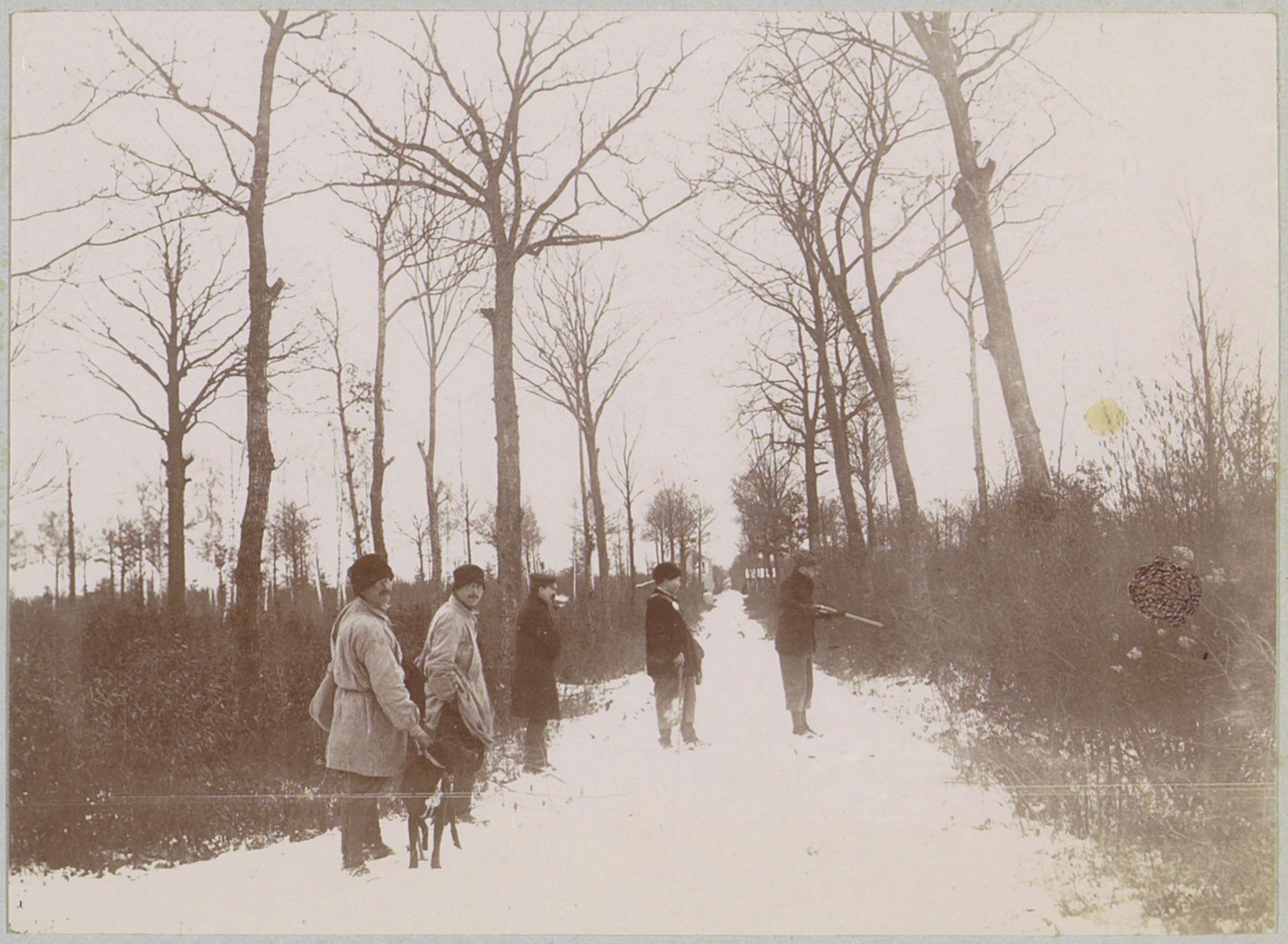 Groep jagers met hond op besneeuwd pad, vermoedelijk...