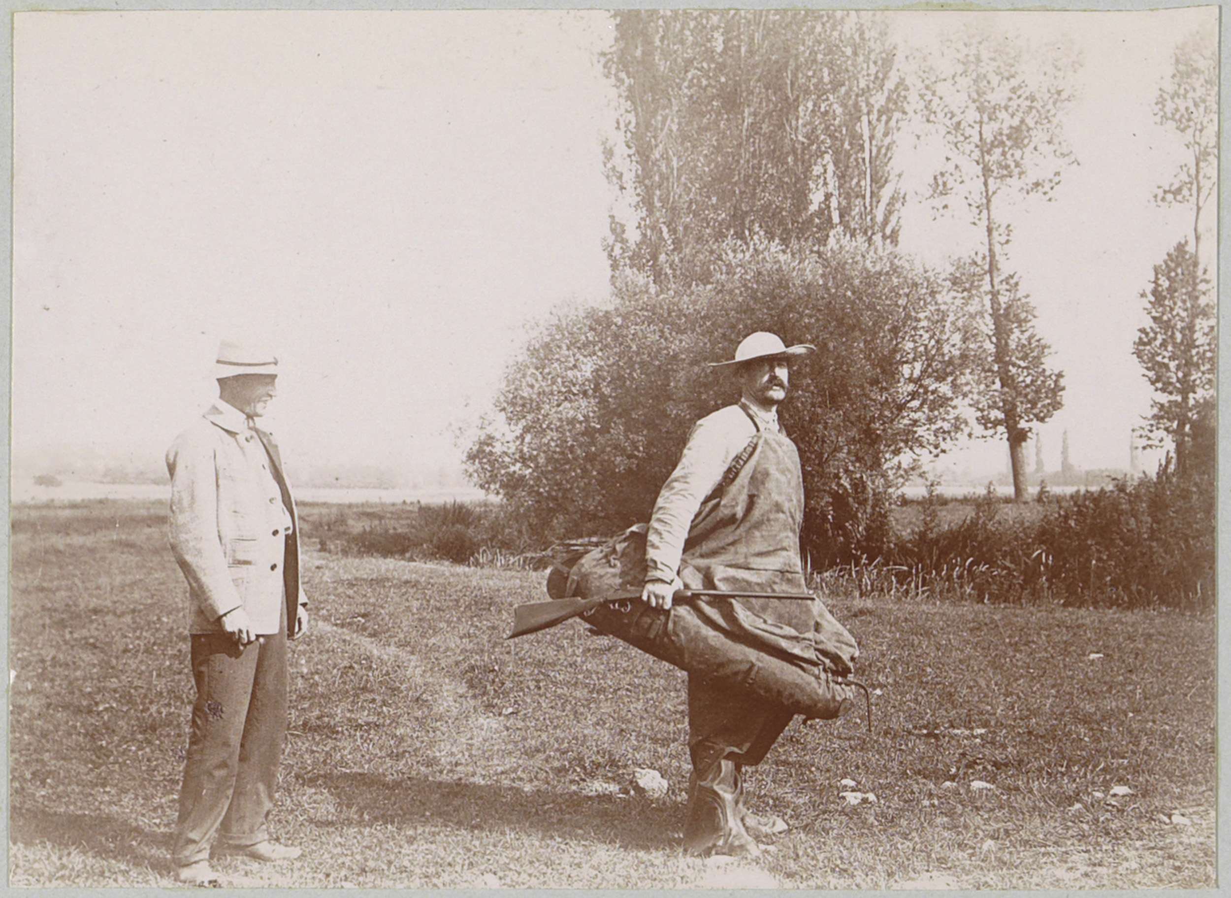 Twee mannen in een roeiboot tijdens een jachtpartij,...