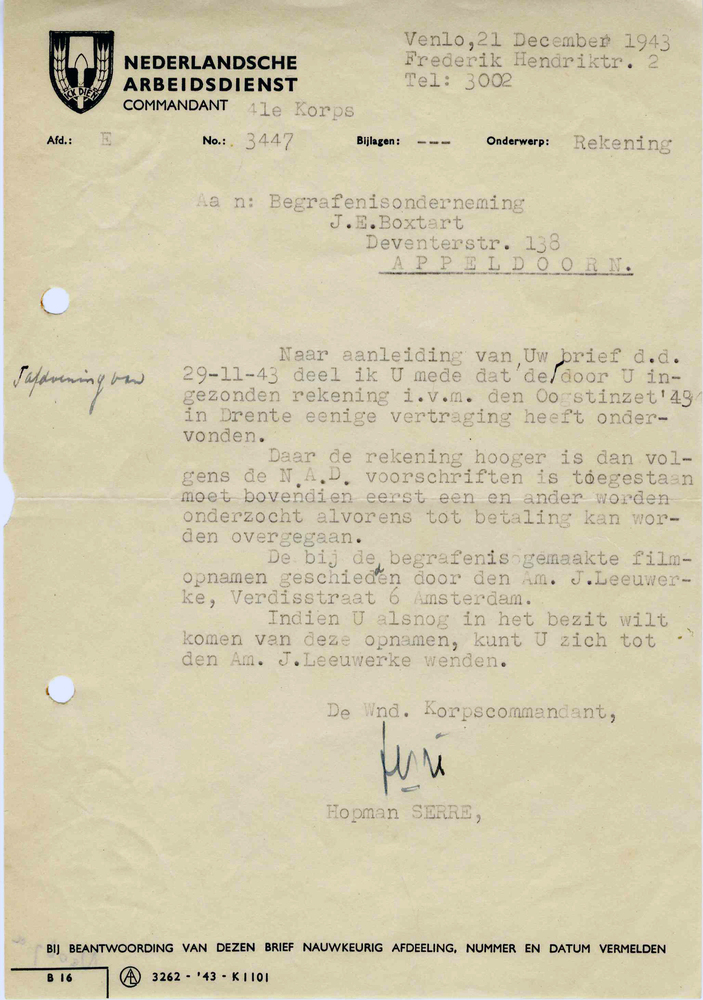 de brief van Nederlandse Arbeidsdienst Commandant aa...