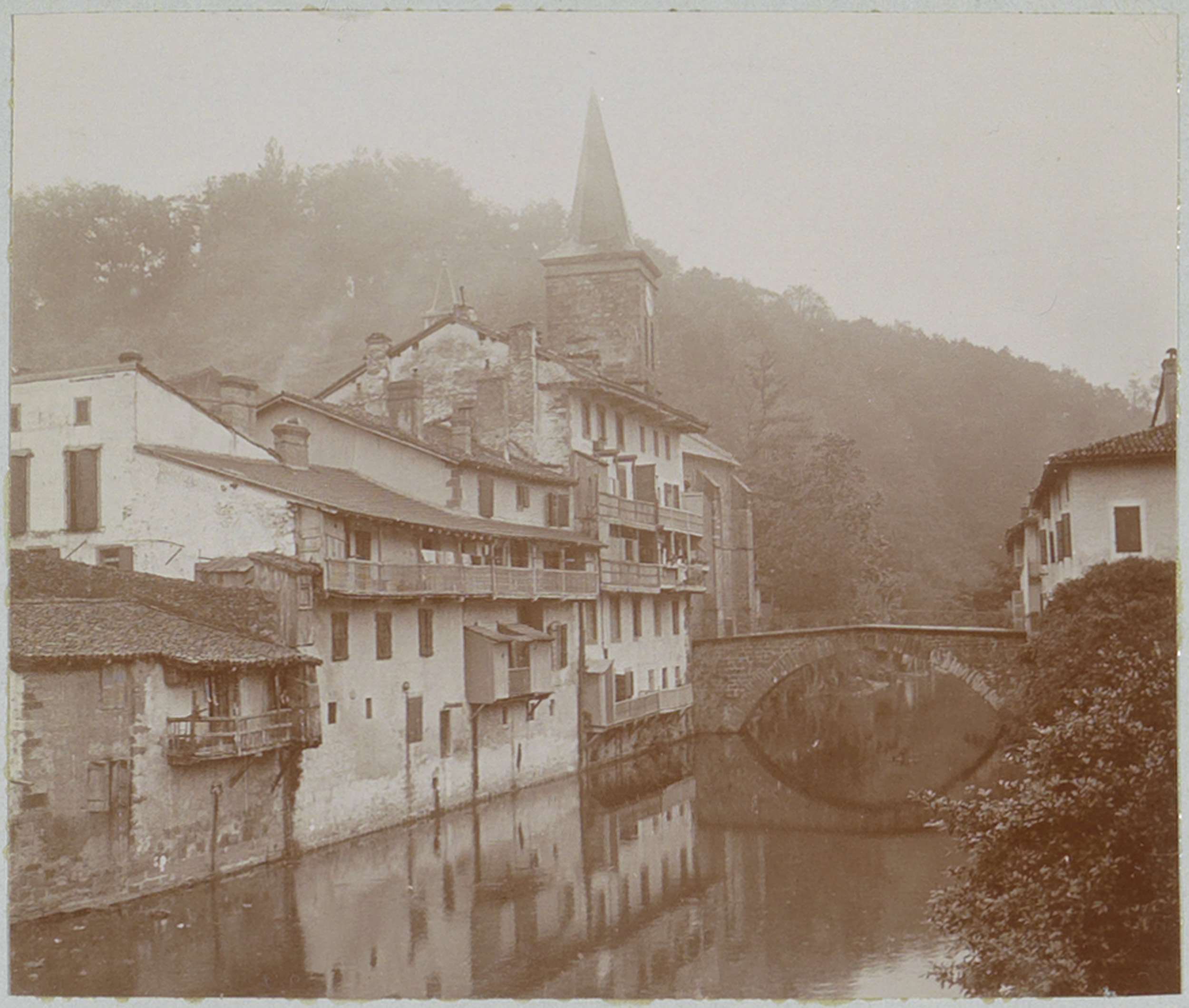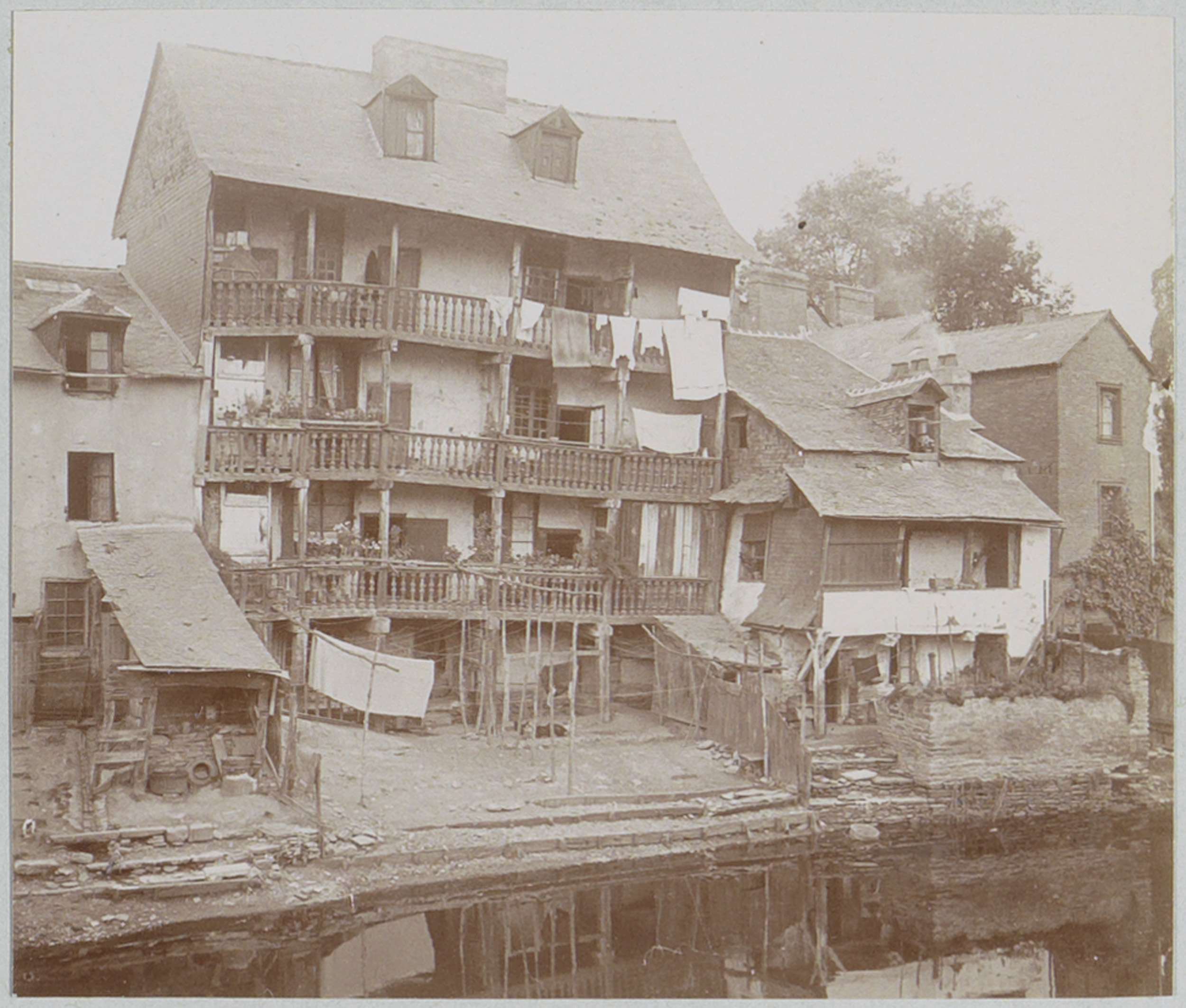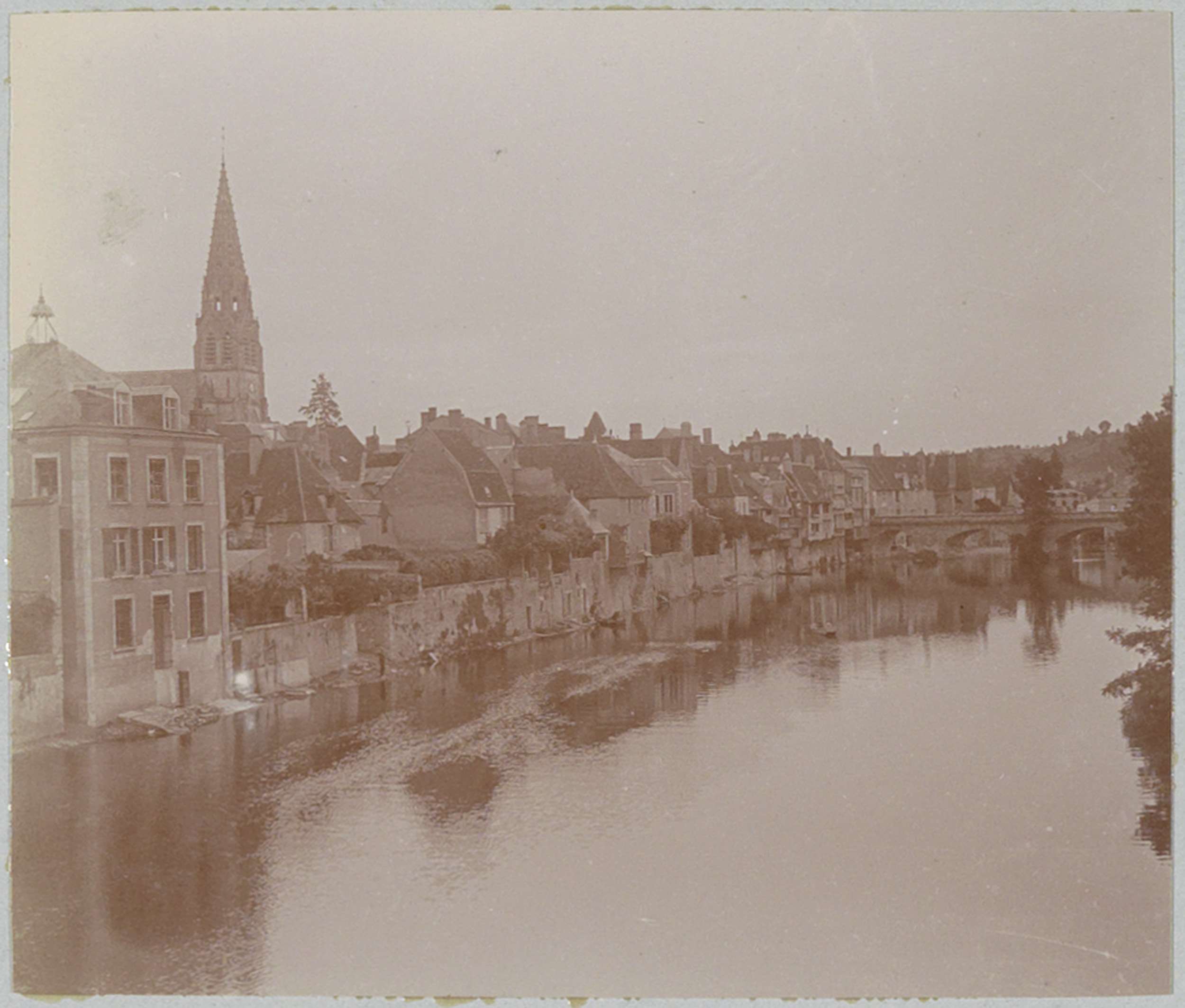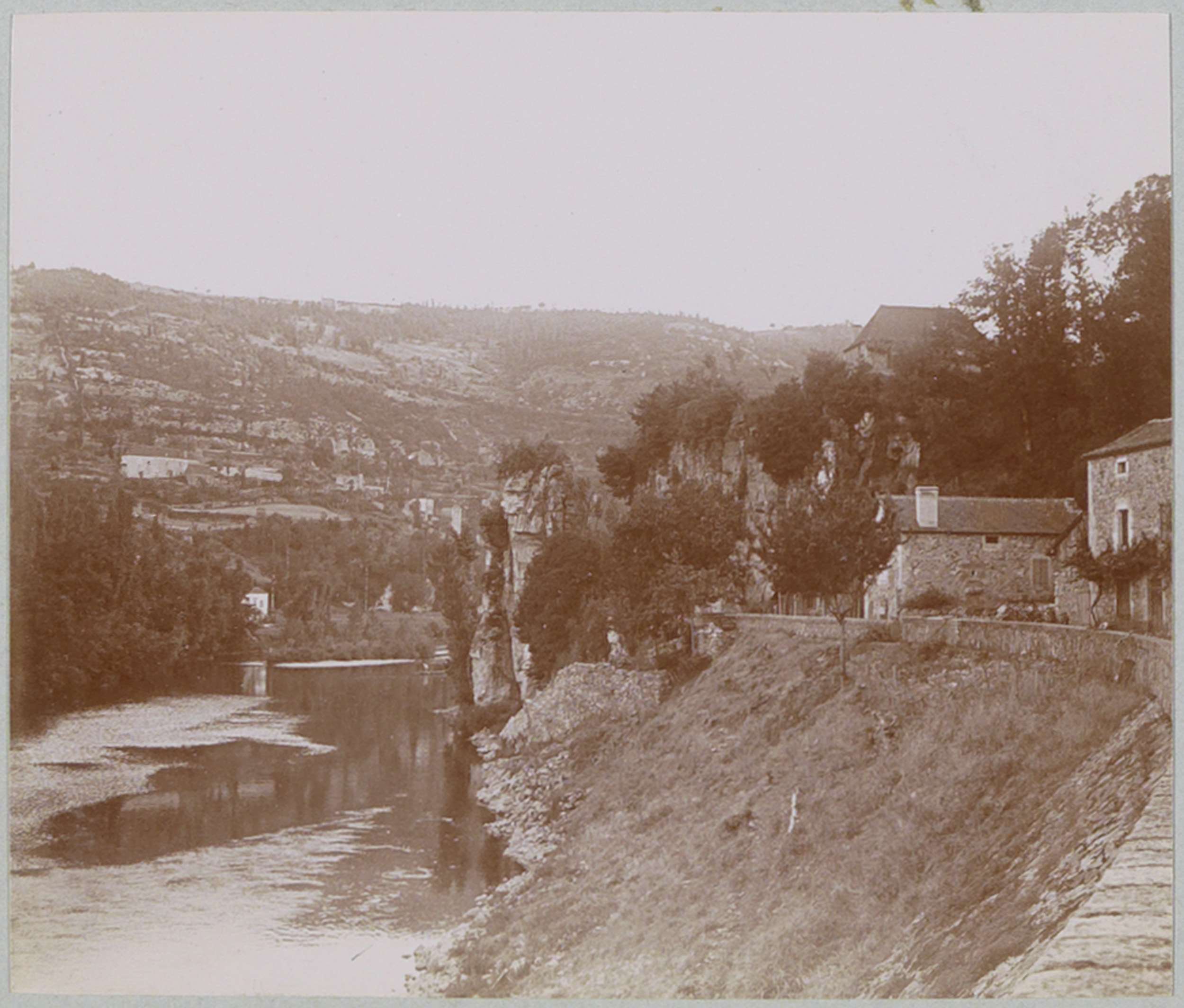 Huizen op een rivieroever, vermoedelijk in Frankrijk