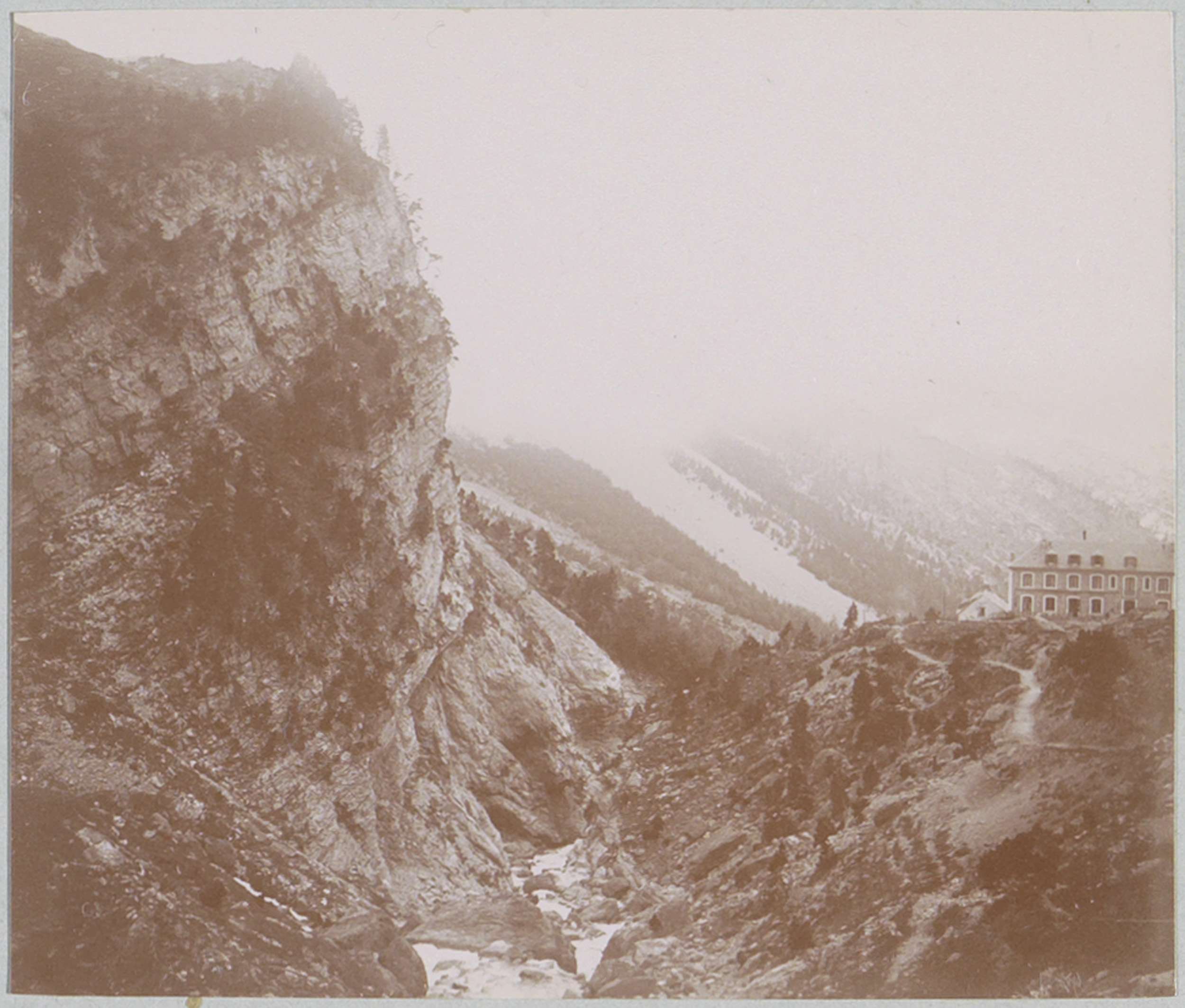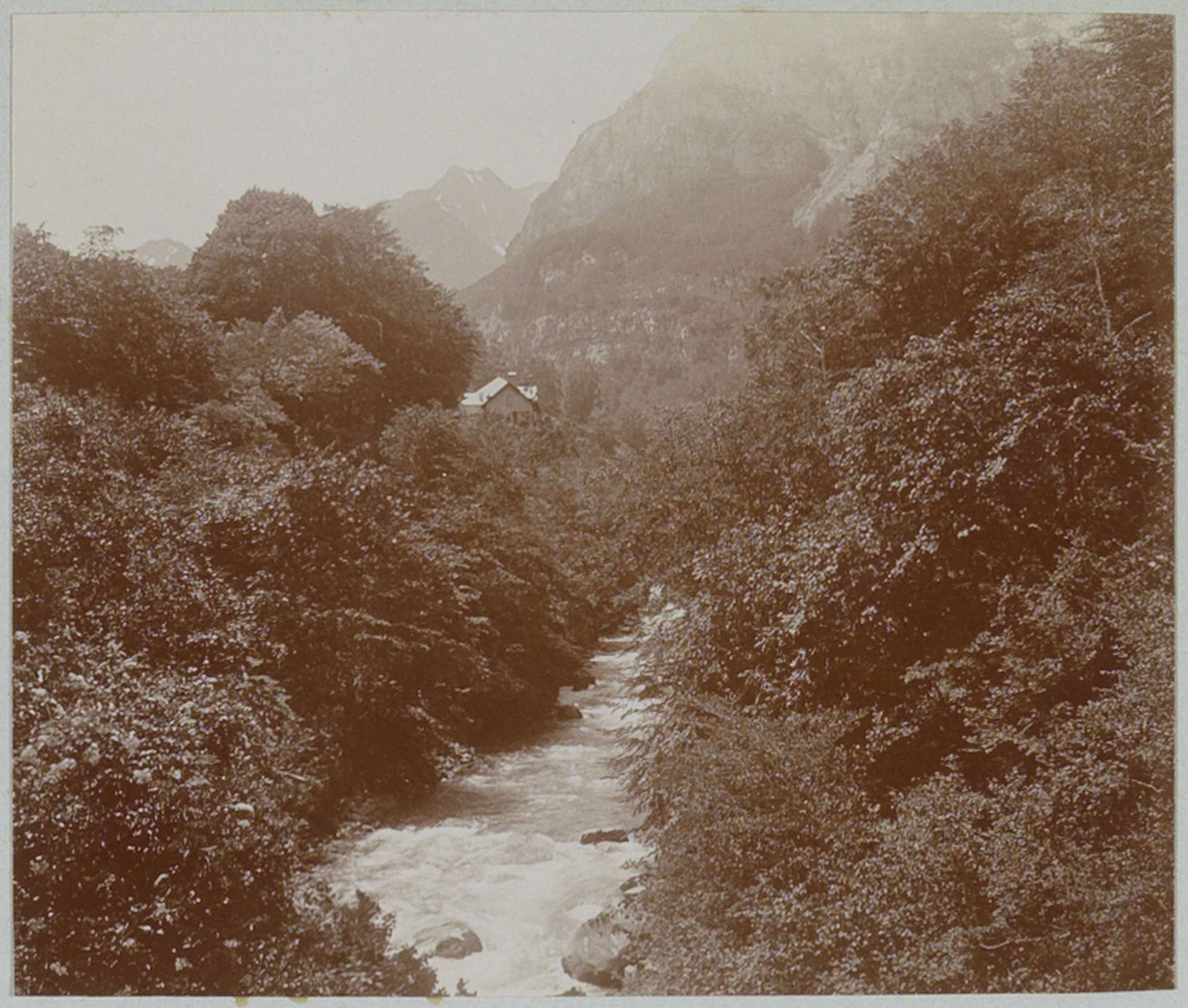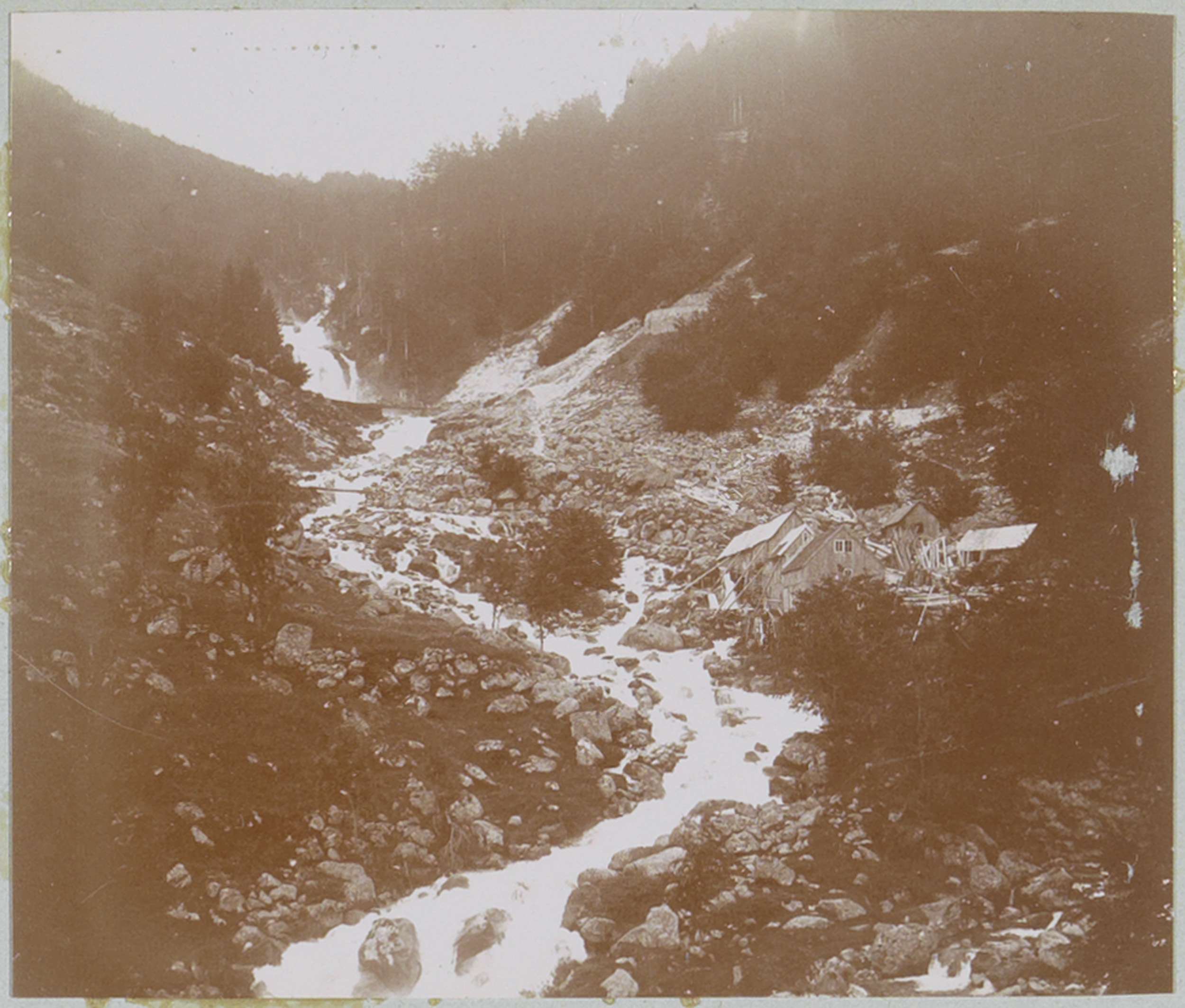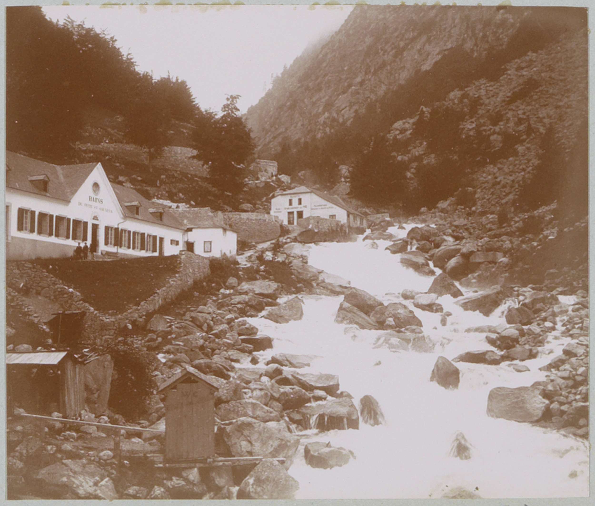 Bergbeek met schuren erlangs, vermoedelijk in de Pyr...