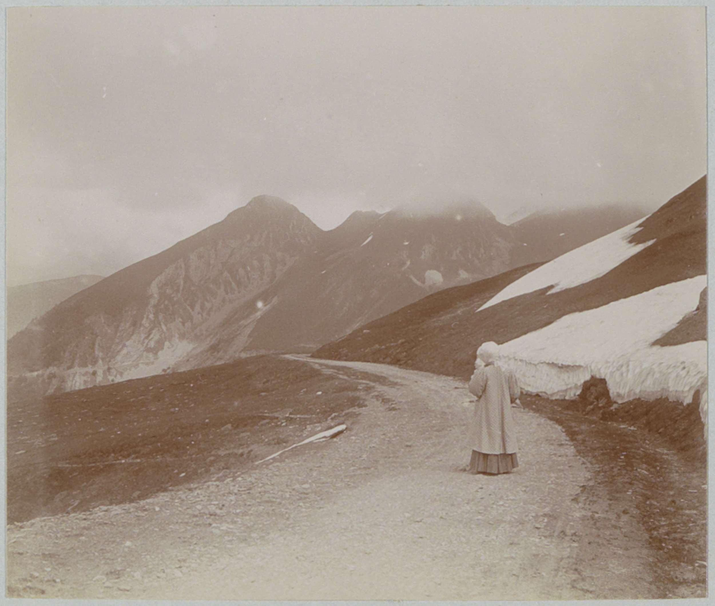 Vrouw in een lange mantel op een besneeuwde bergpas,...