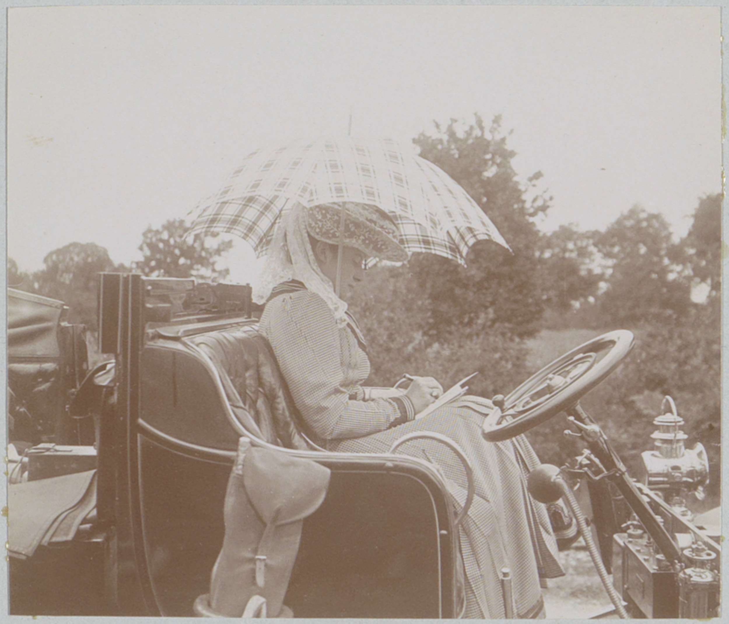 Vrouw schrijvend achter het stuur van een auto in Fr...