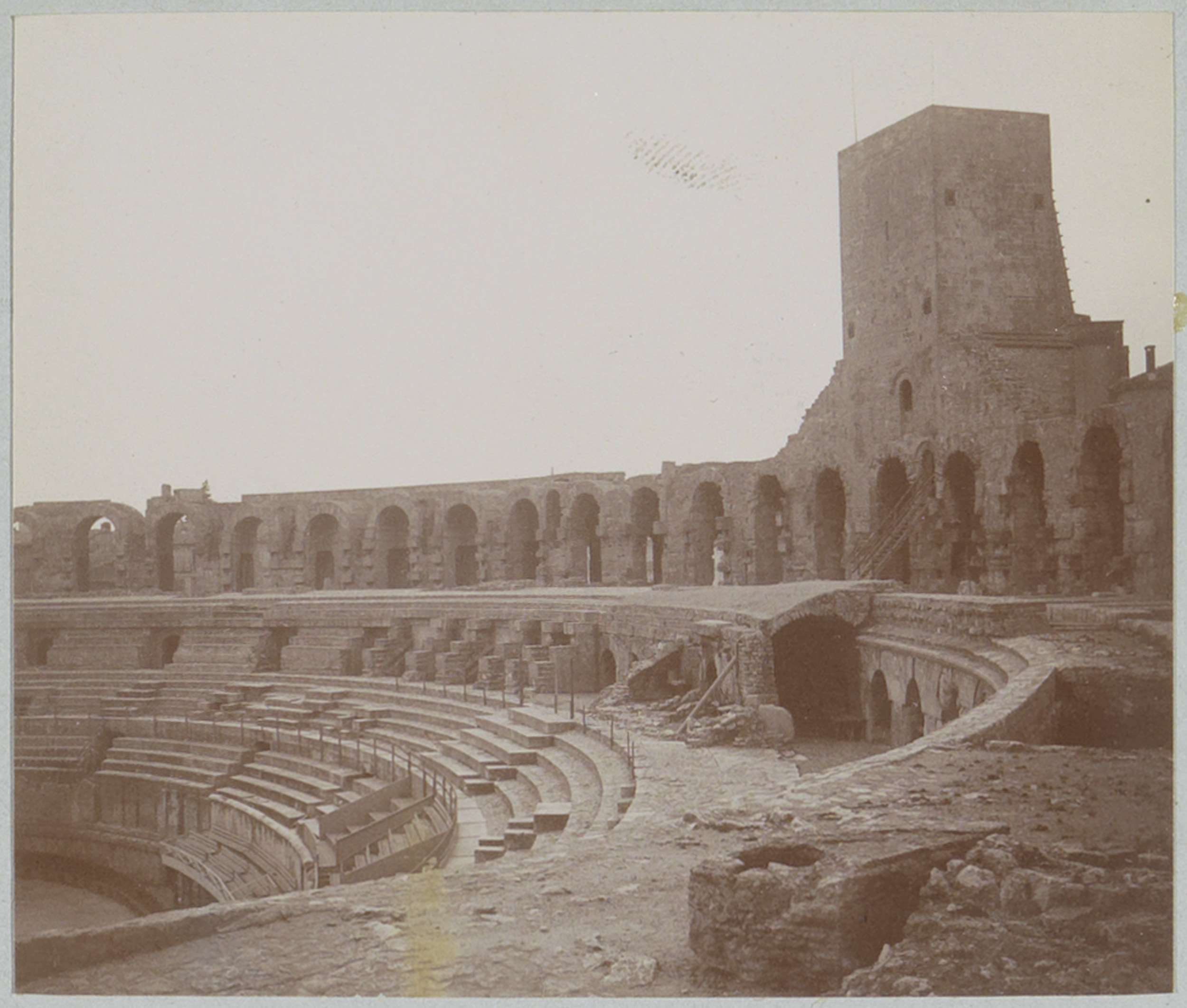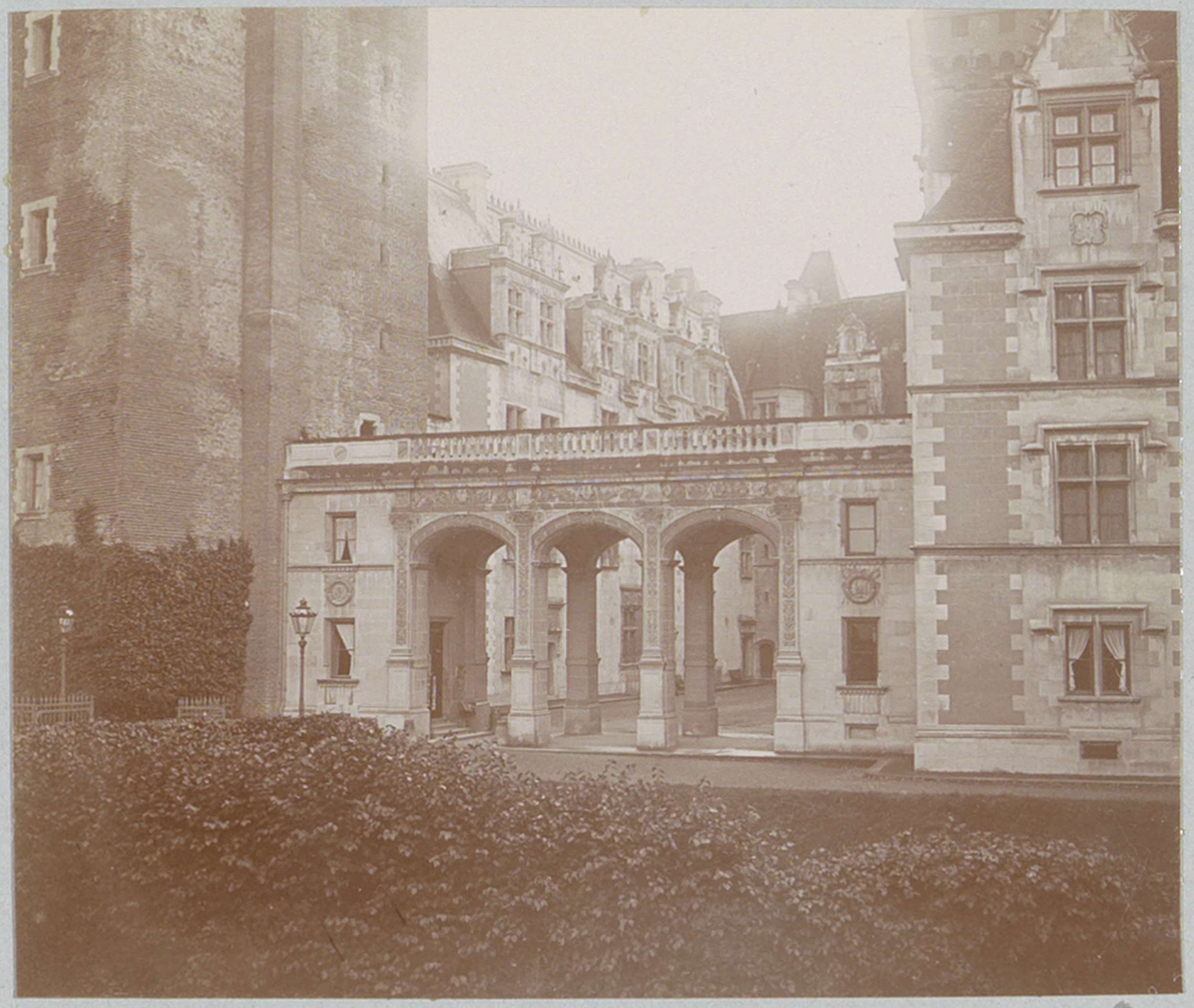 Gezicht op een gebouw met een binnenplaats, vermoede...