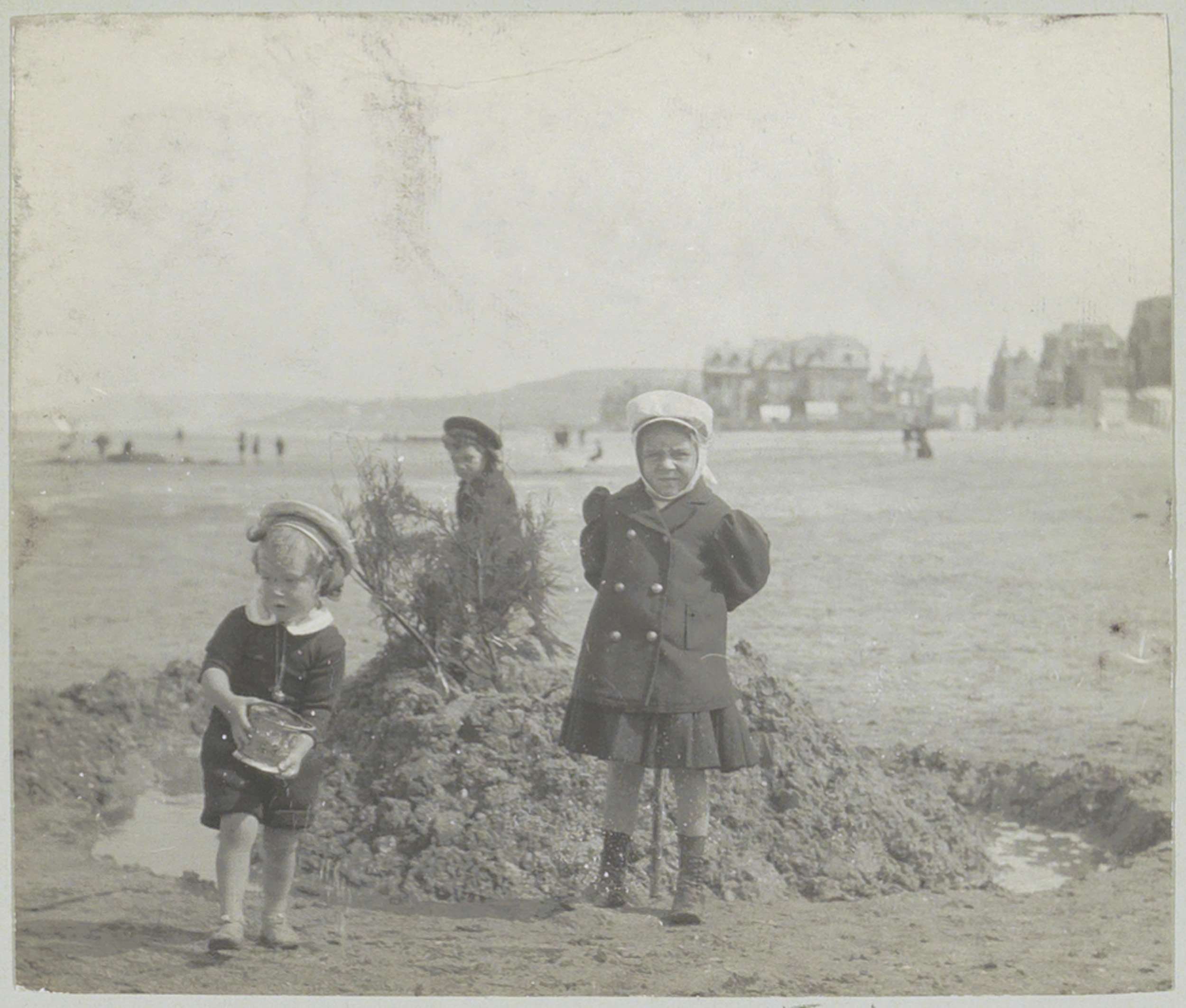 Drie kinderen spelend bij een zandhoop aan het stran...