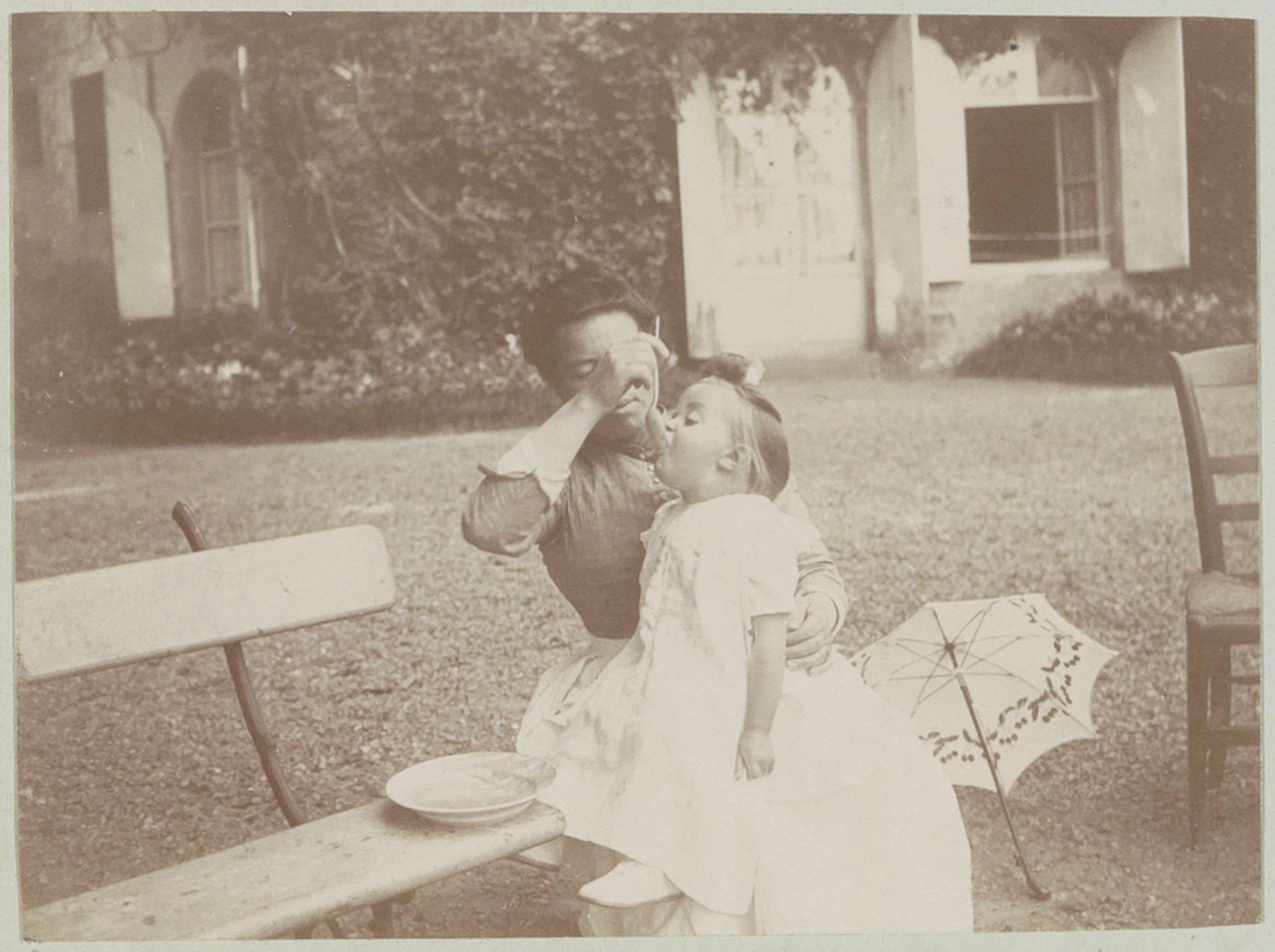 Vrouw geeft klein meisje te eten op een bank in de o...