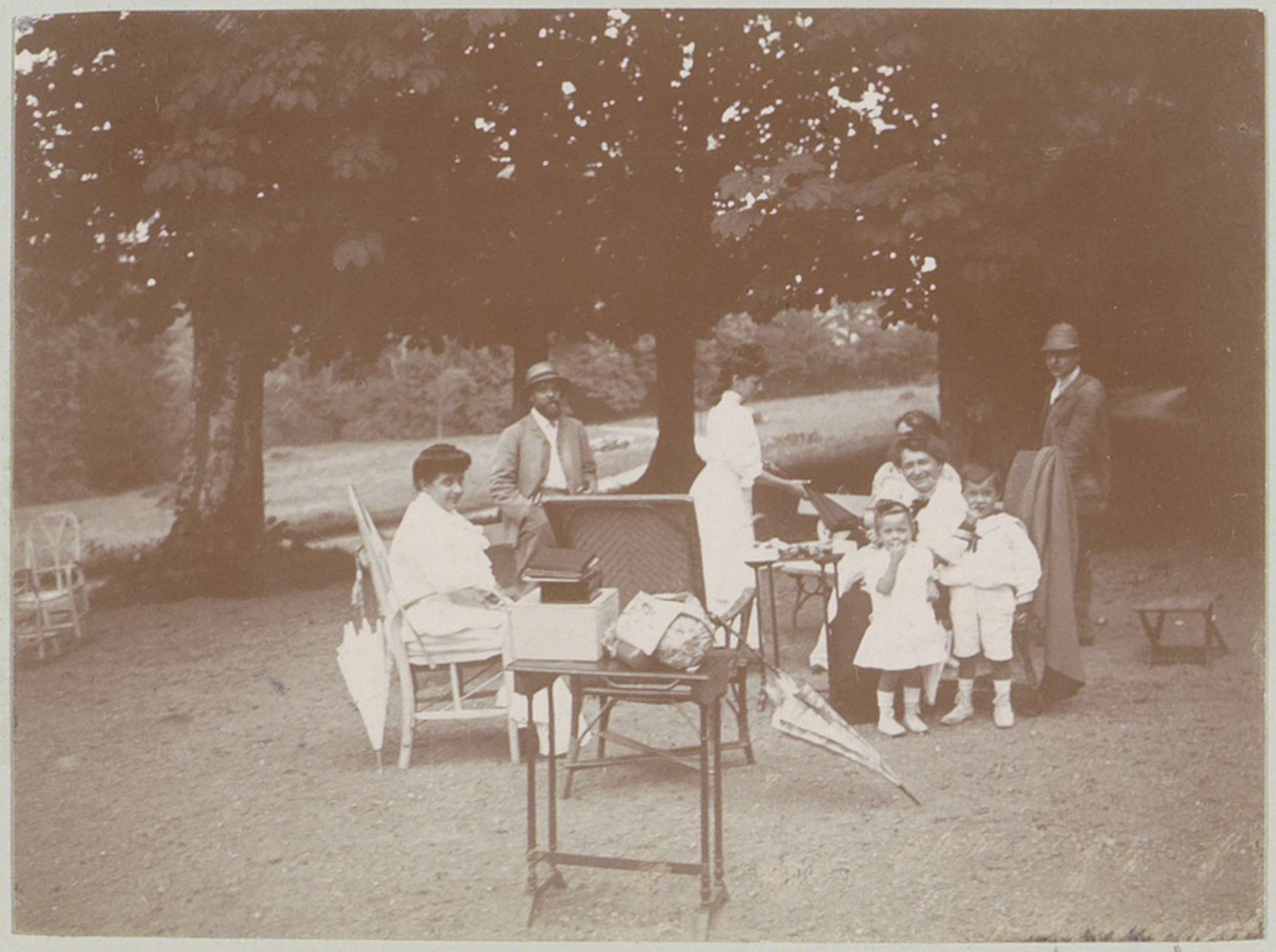 Groep mannen, vrouwen en kinderen zittend onder bome...