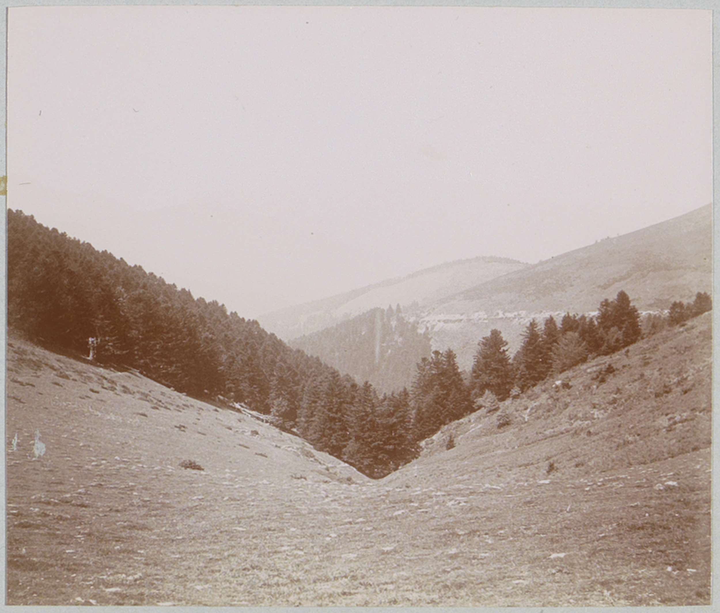 Berglandschap met een bos, vermoedelijk in de Pyreneeën