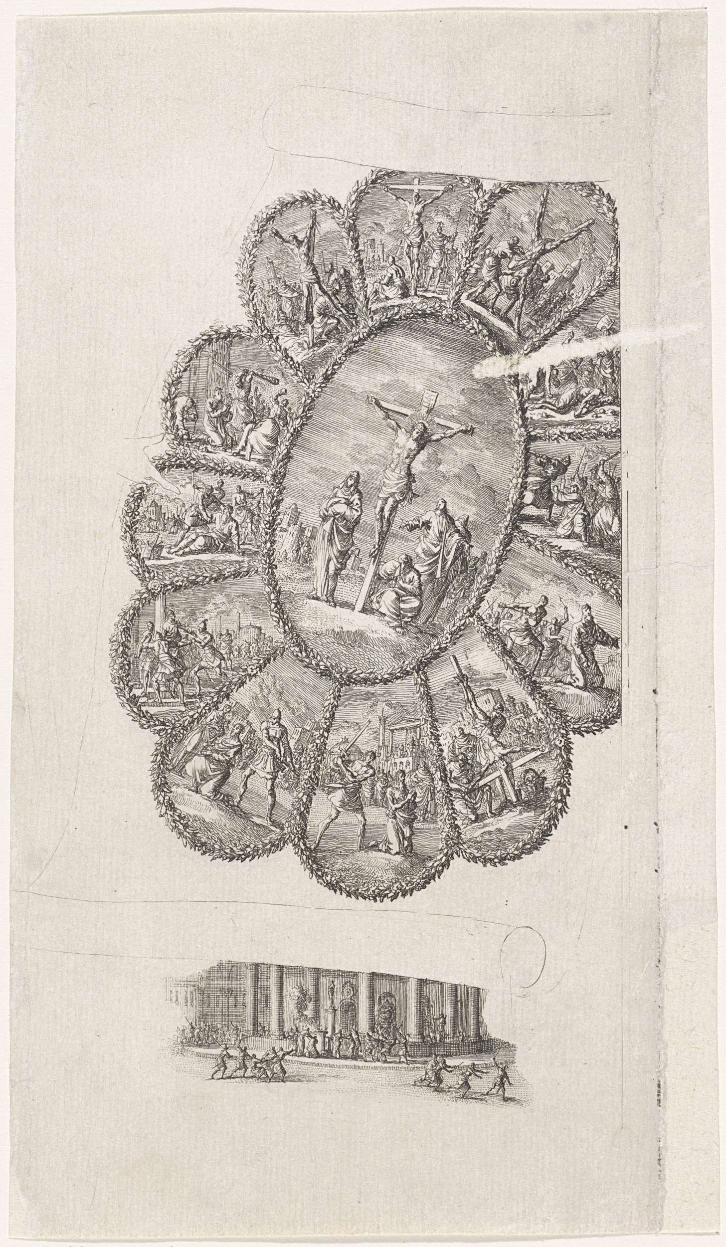 Monstrans op achtlobbige voet waarop kruisiging en z...