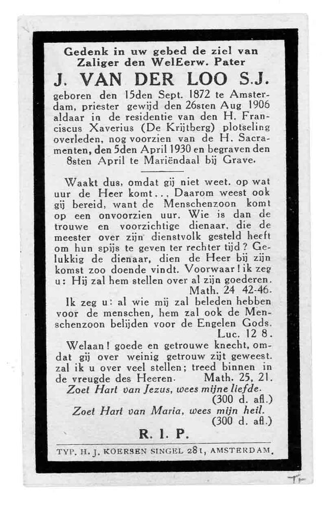 bidprent voor J. van der Loo S.J.. Geboren 15-09-187...