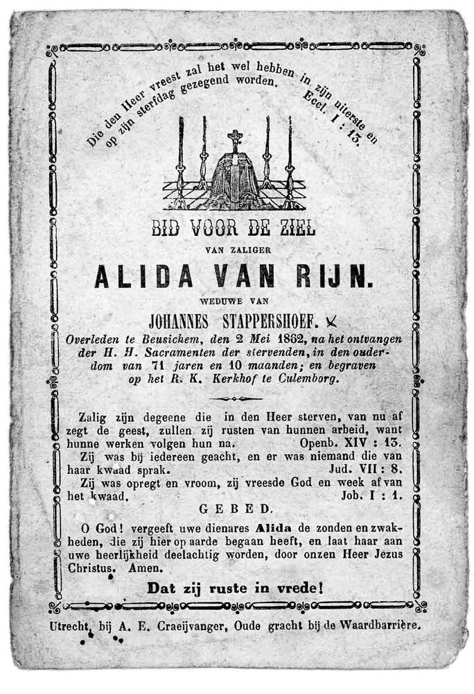 bidprent voor Alida van Rijn. Geboren 1791, overlede...