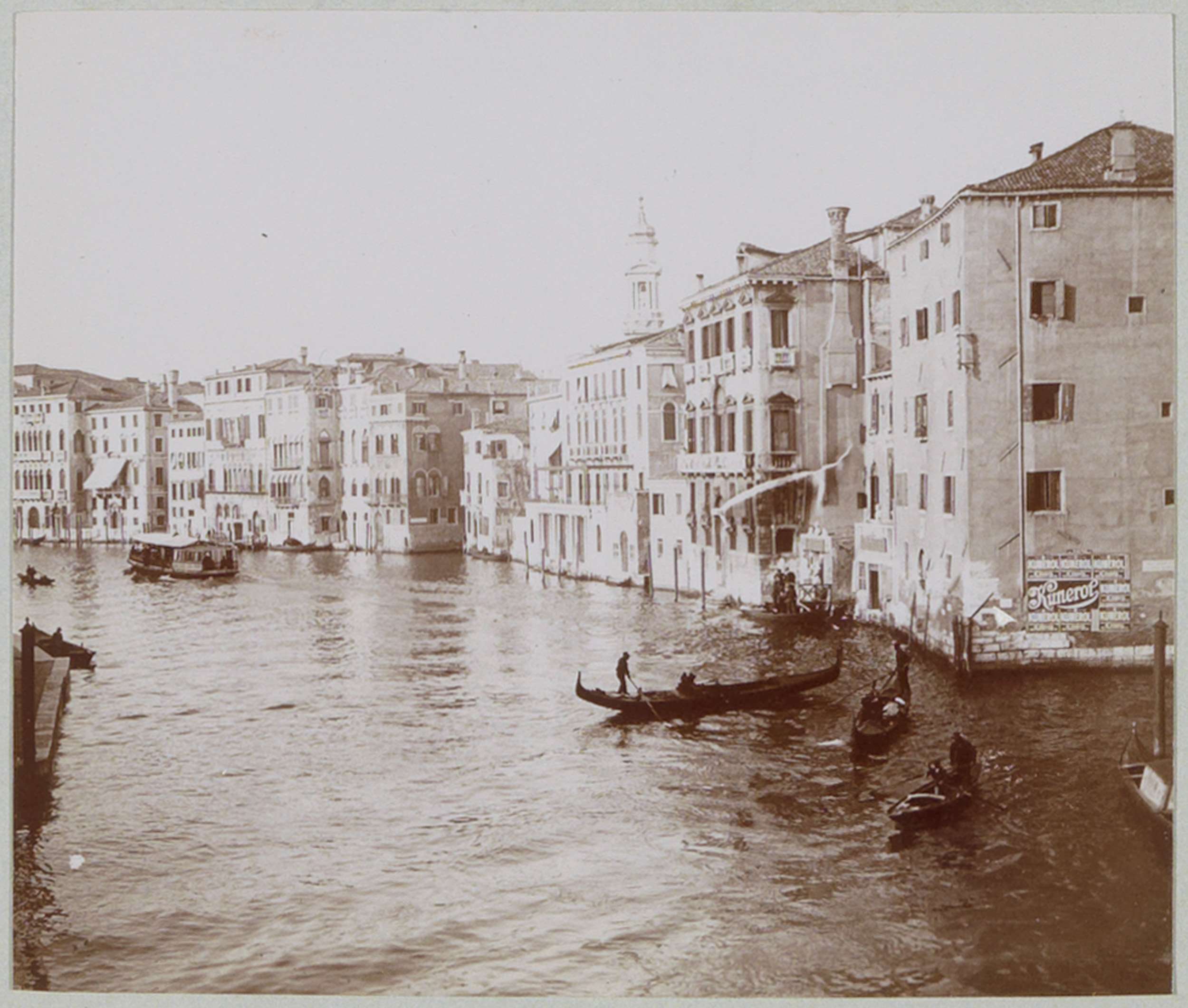 Gezicht op een kade met palazzo's en gondels in Venetië