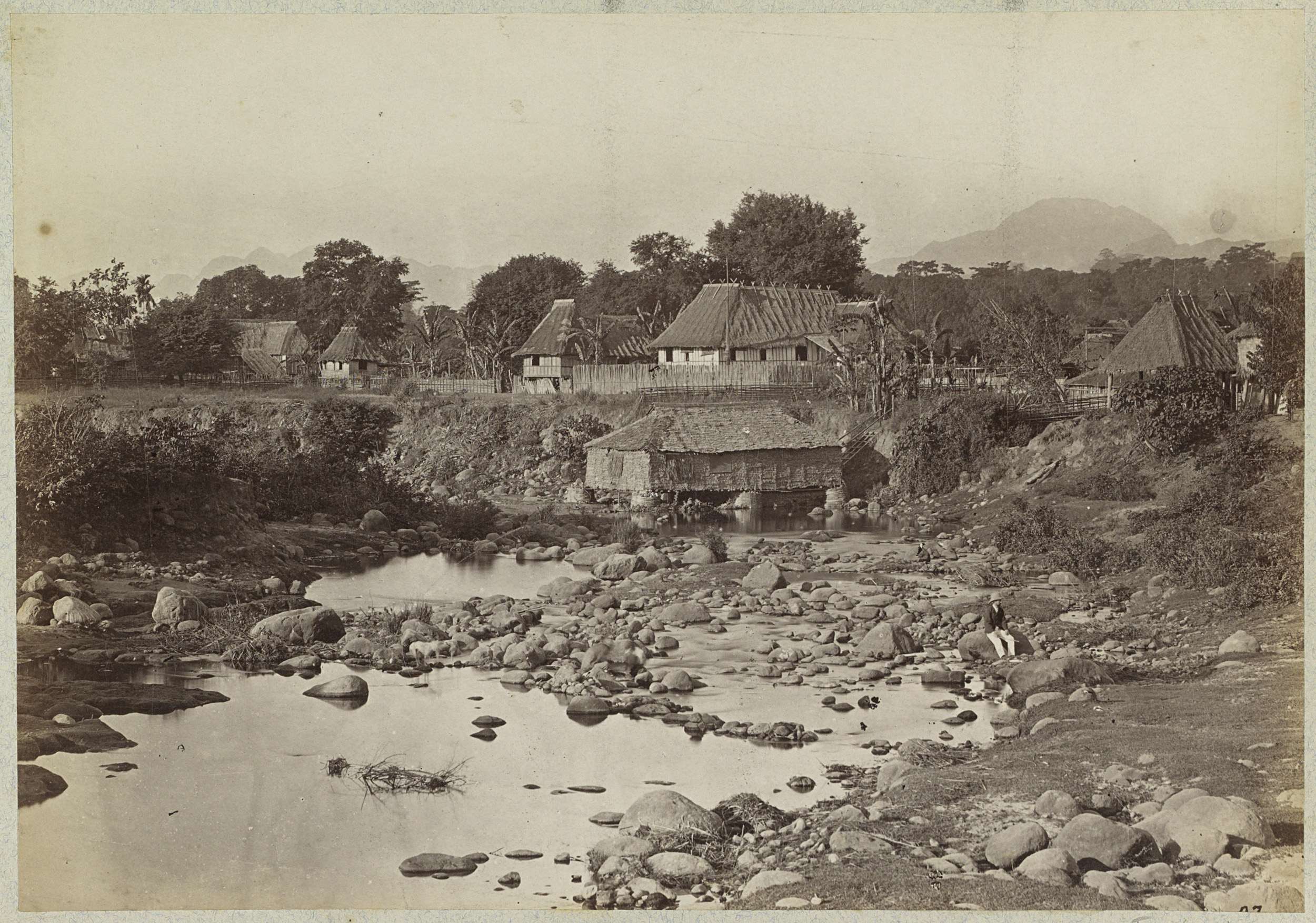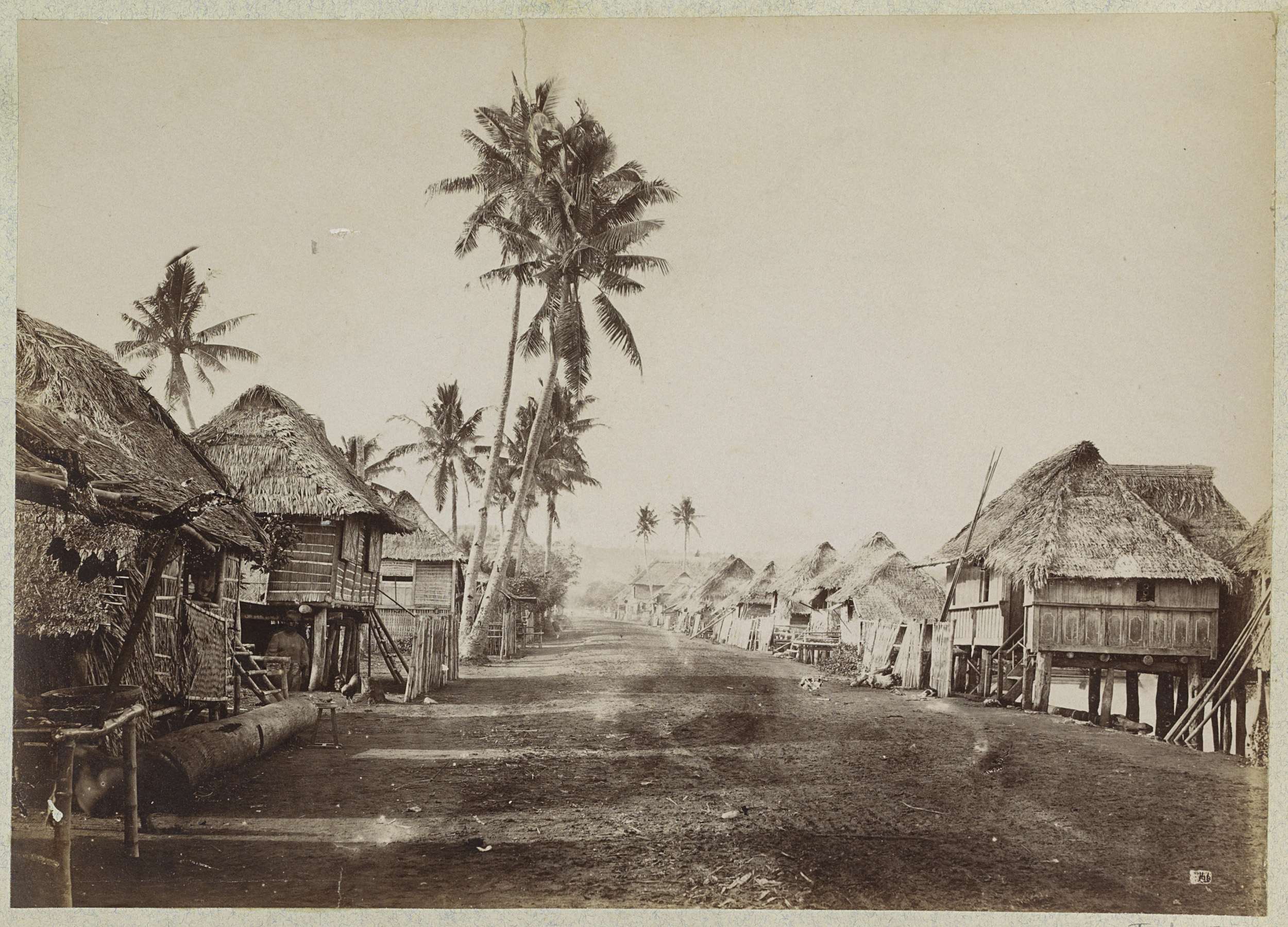 Dorpsstraat met huizen met rieten daken, vermoedelij...