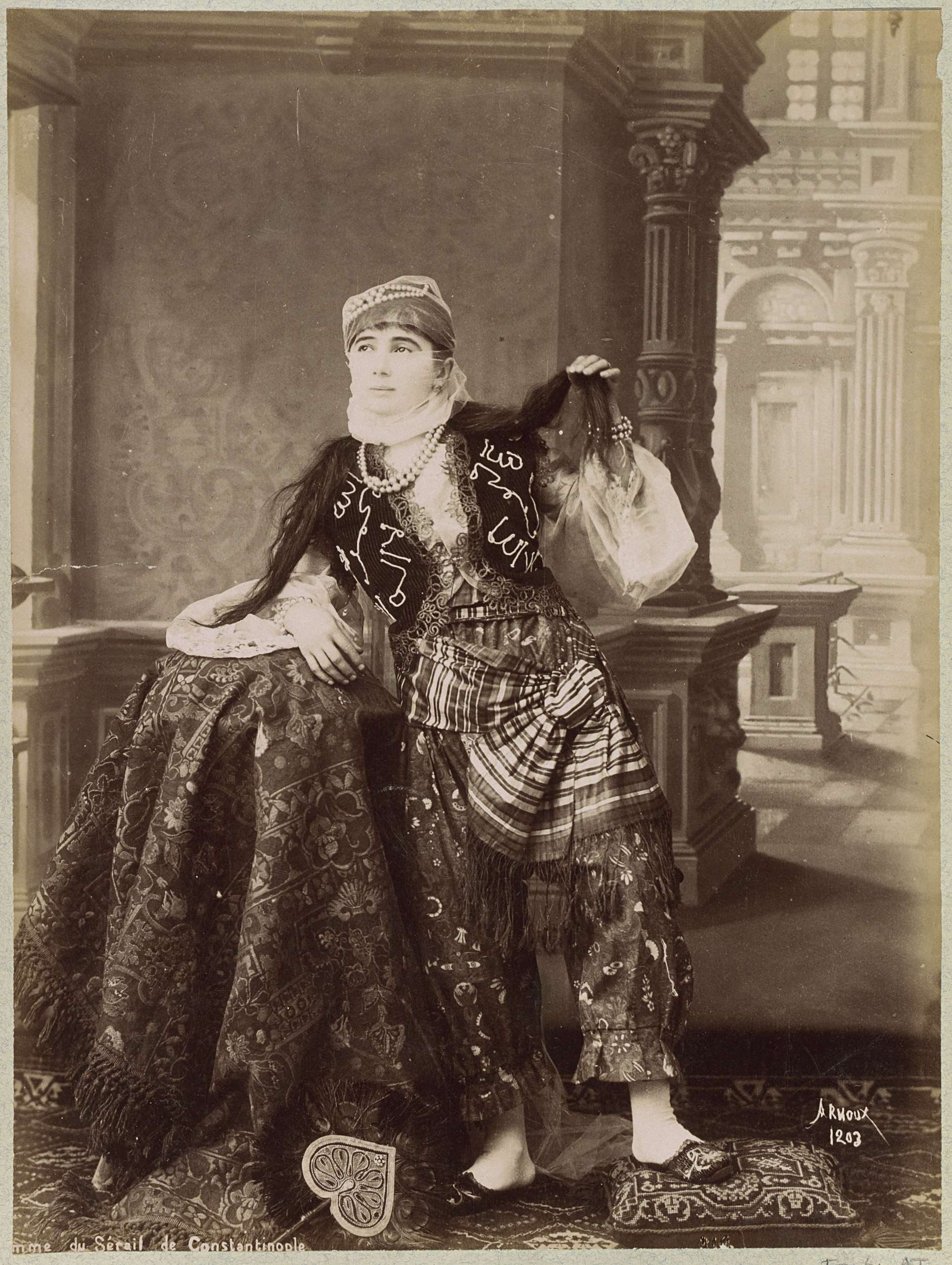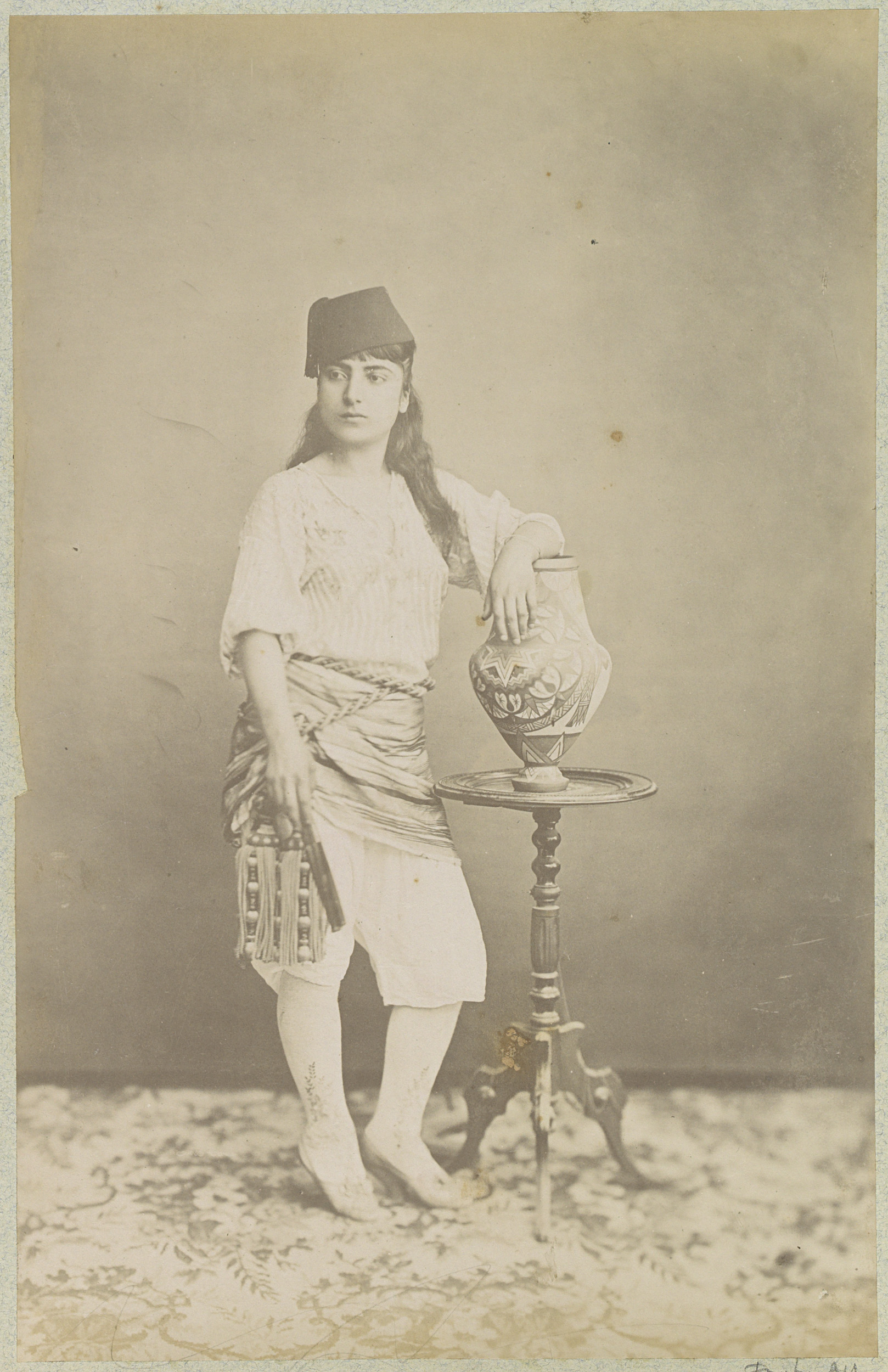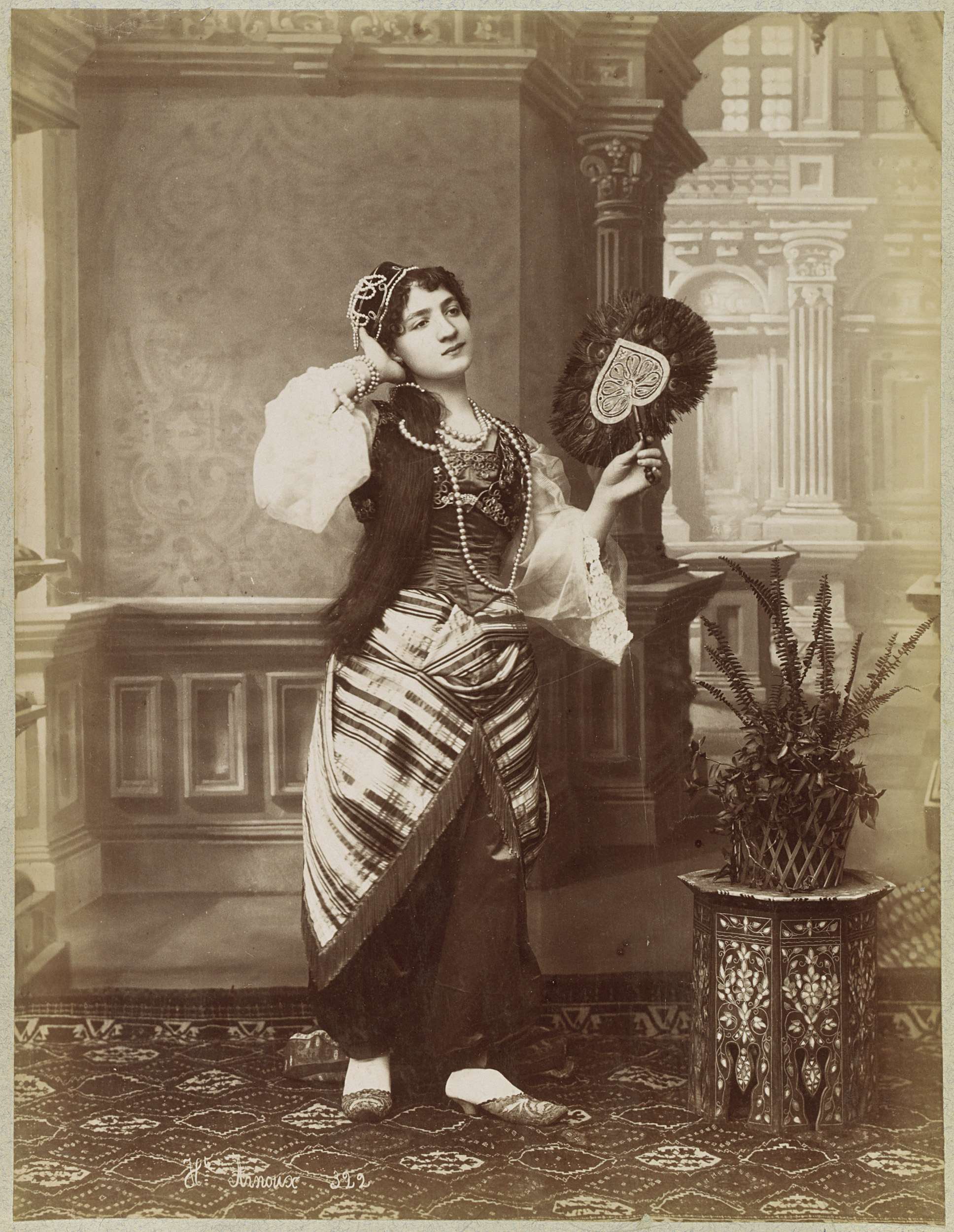 Portret van een Turkse vrouw met tamboerijn in de ha...
