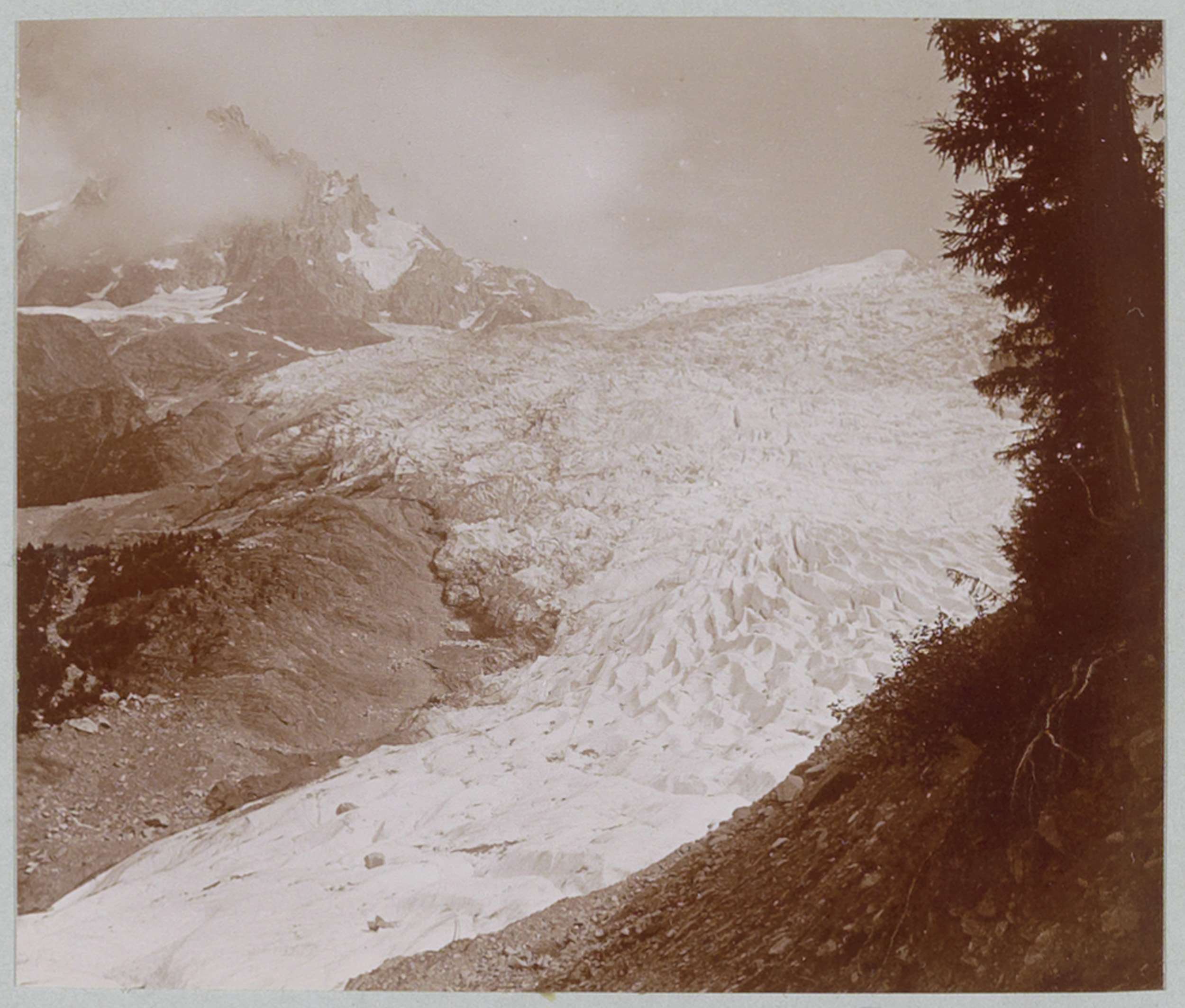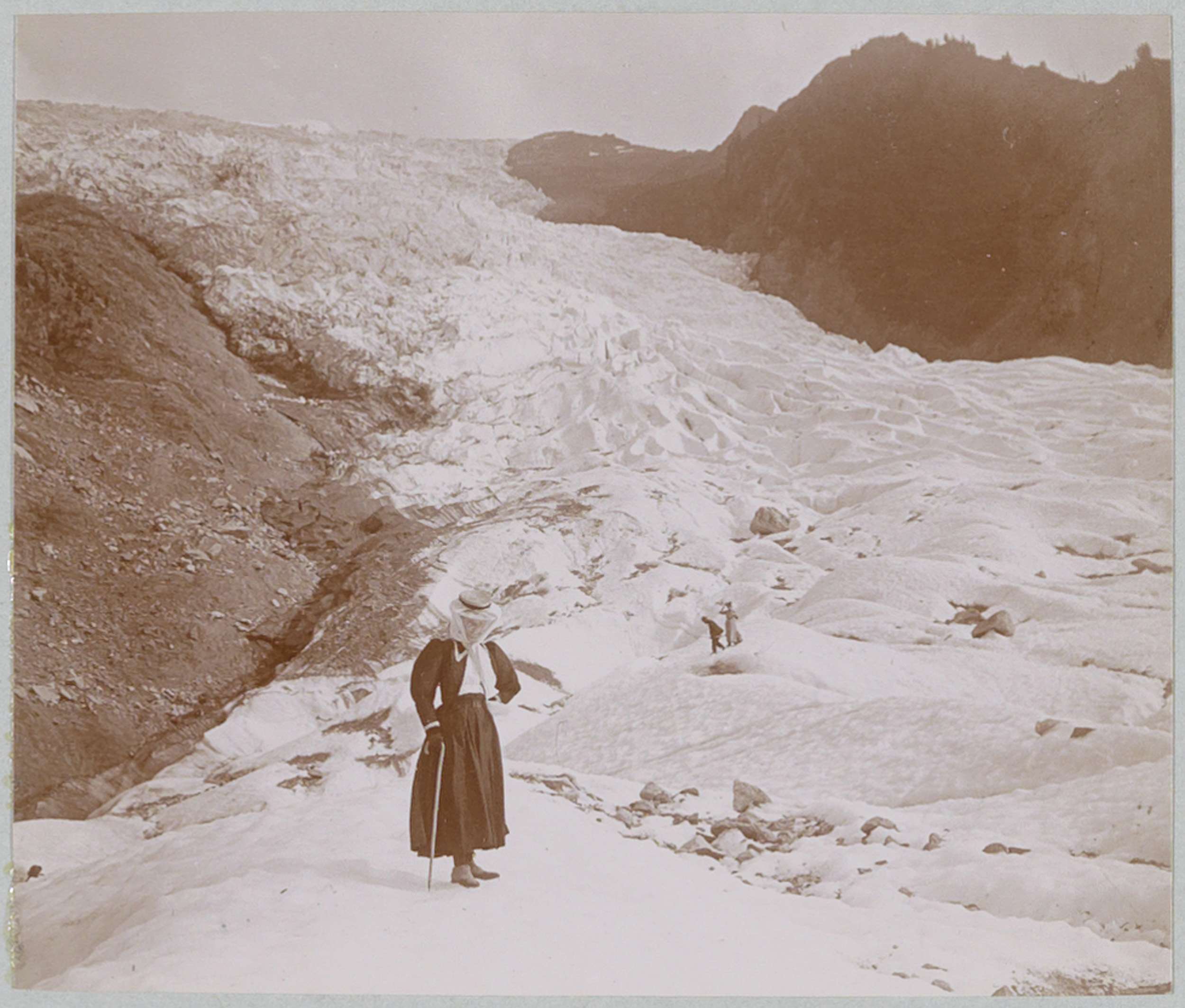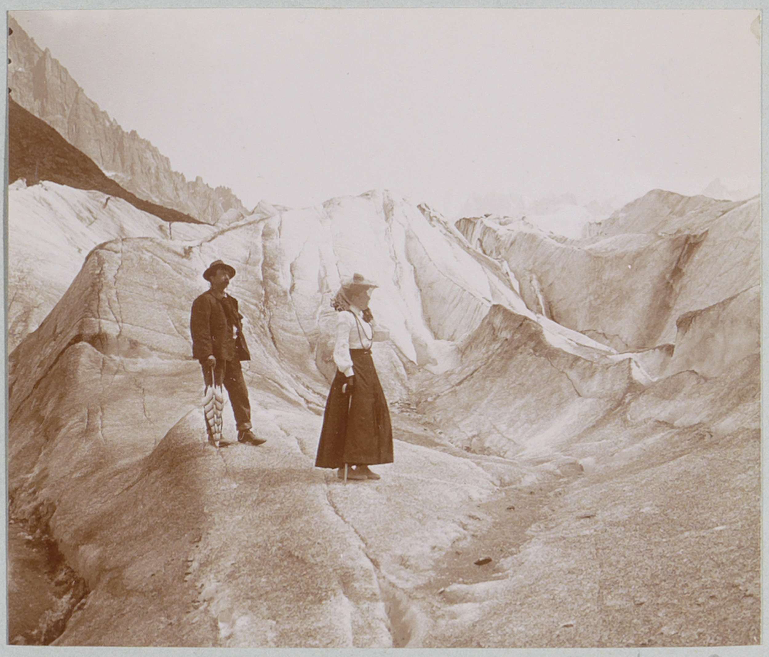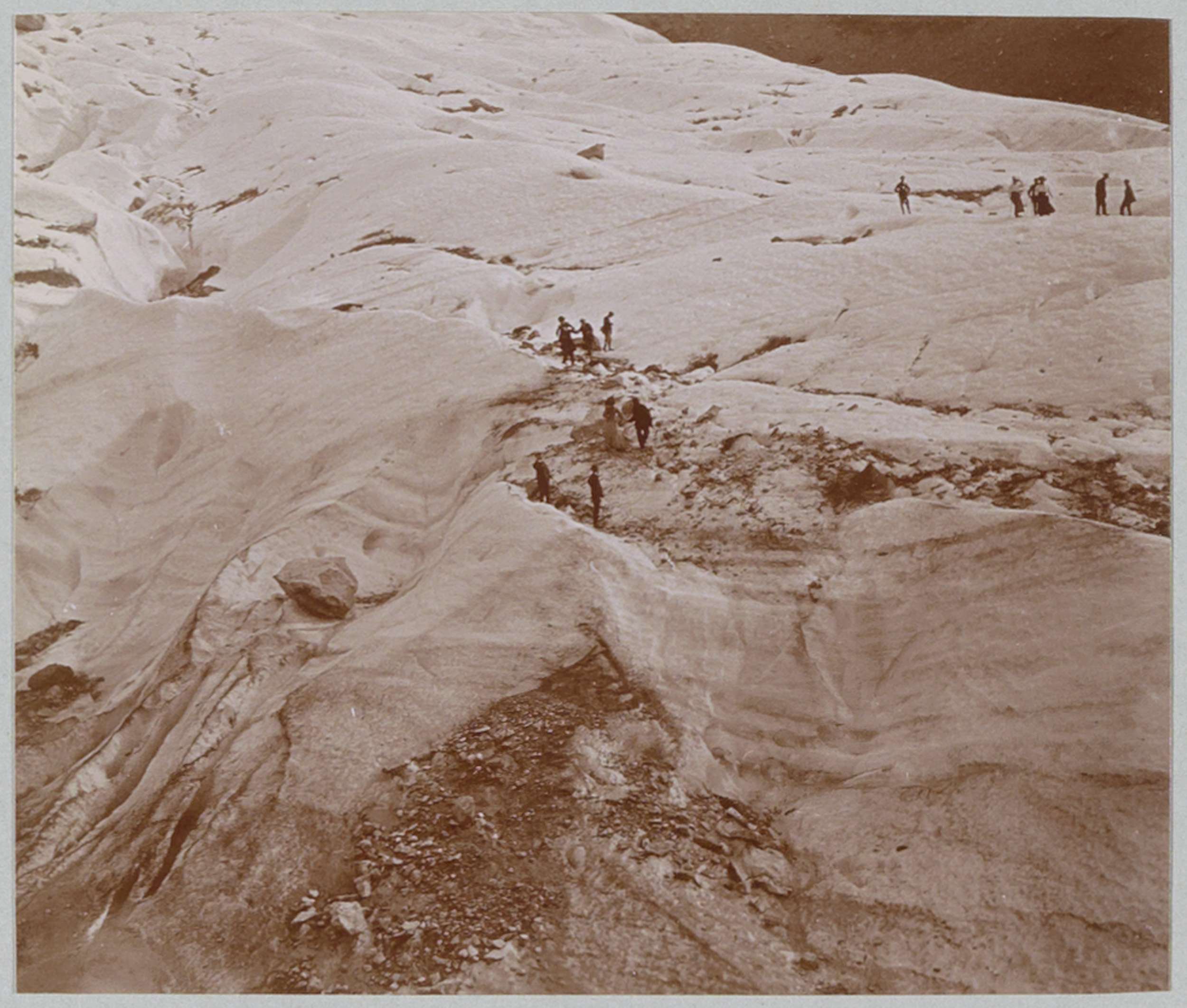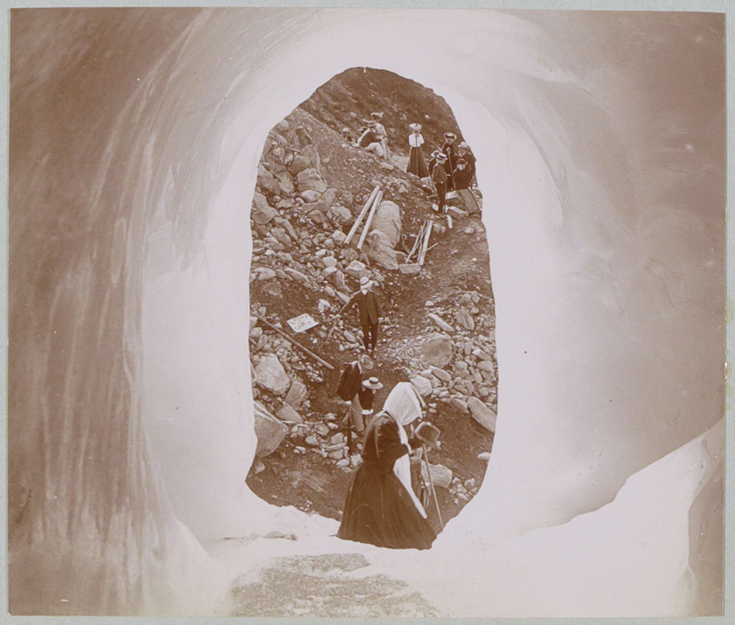 Wandelaars in de Alpen, gezien door een gat in het ijs