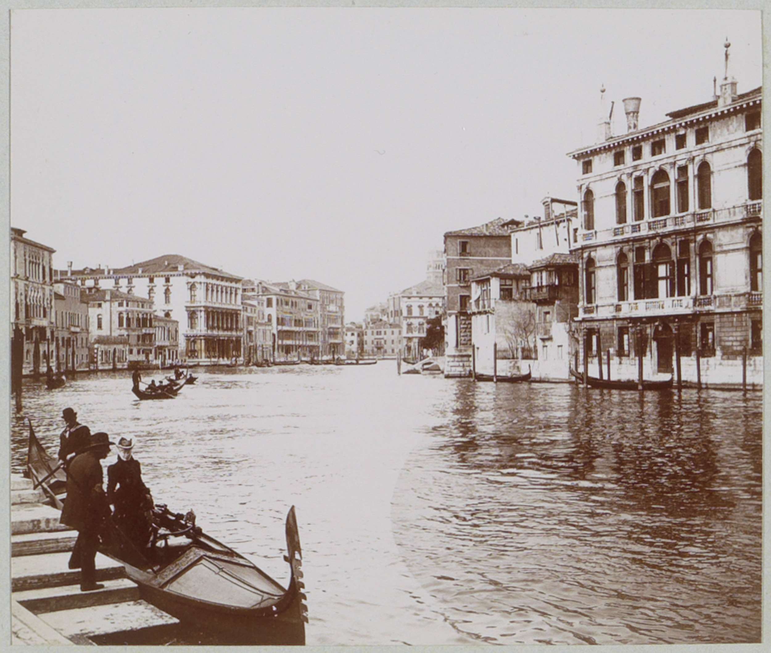 Vrouw en voorbijgangers bij palazzo's in Venetië