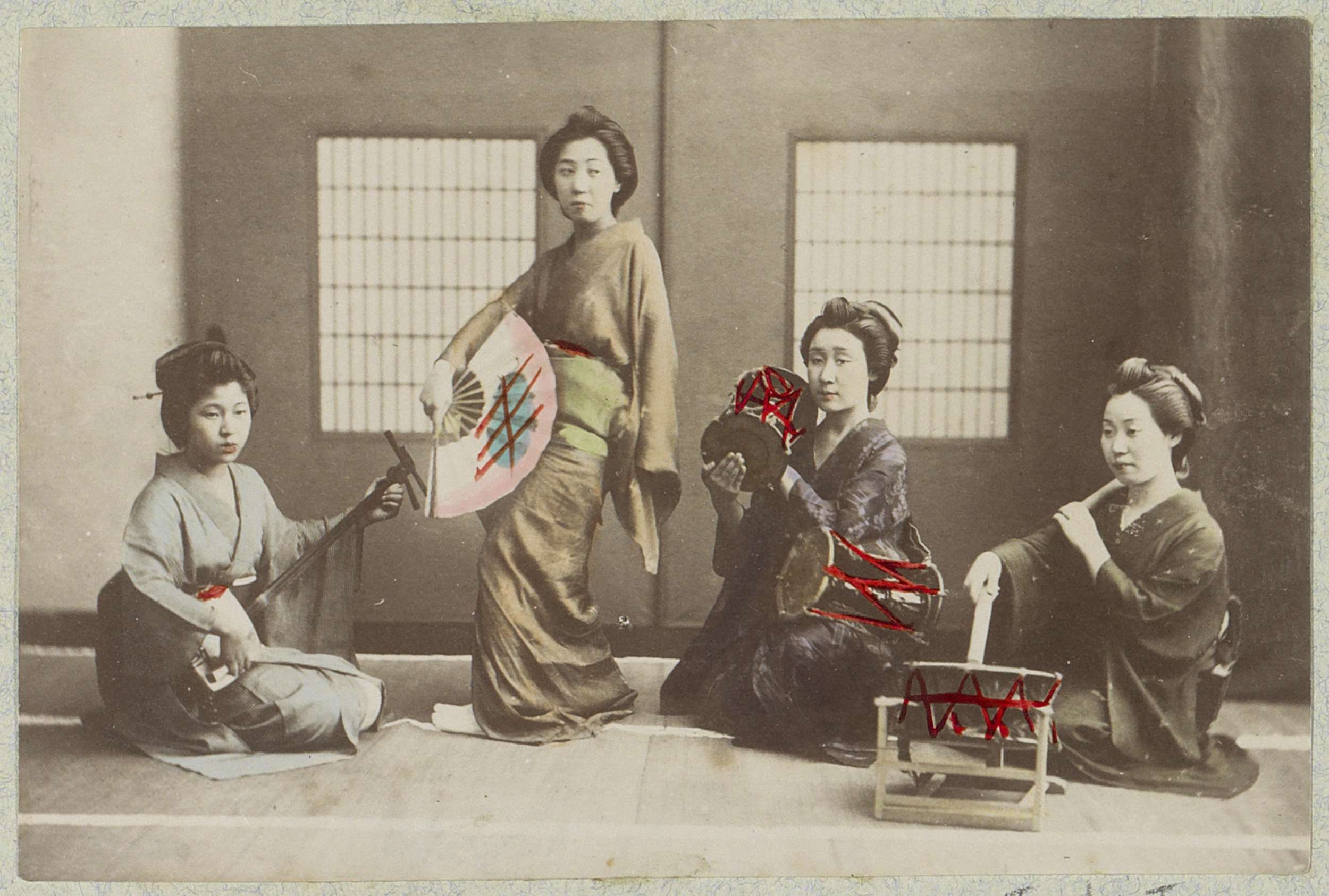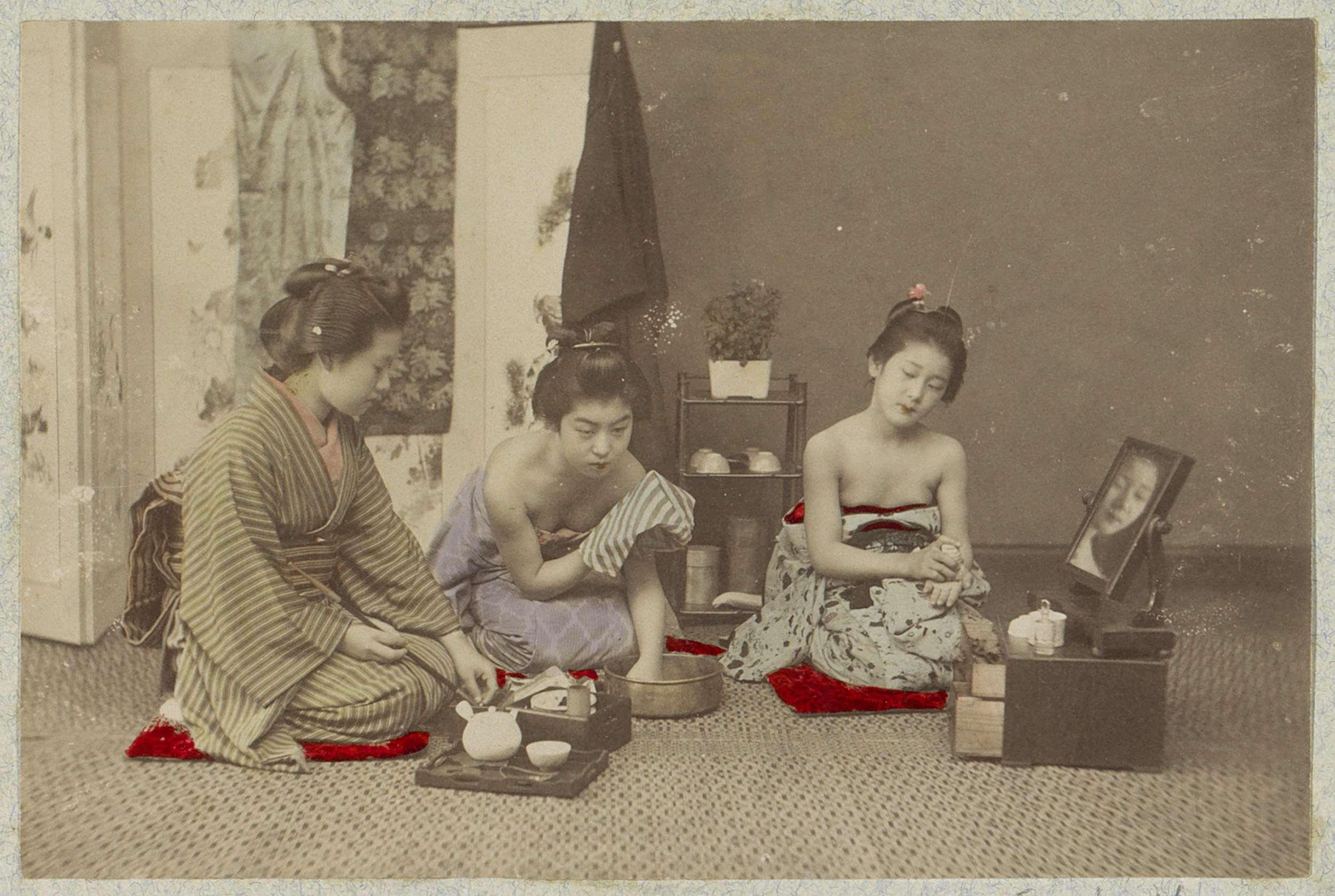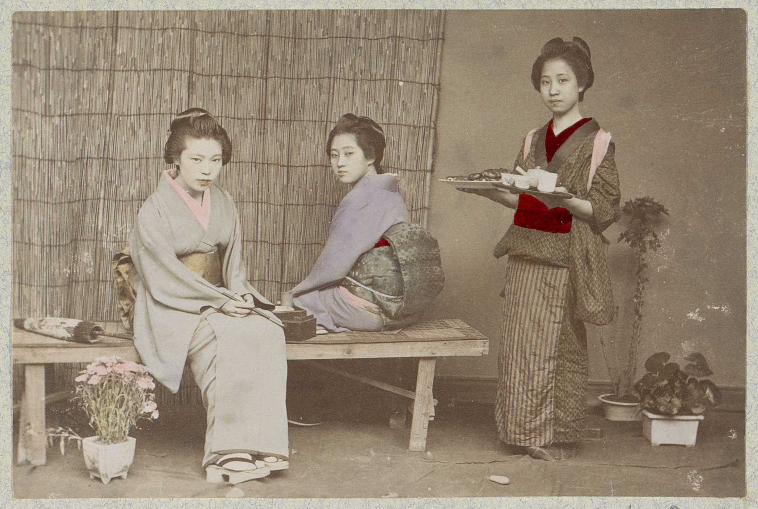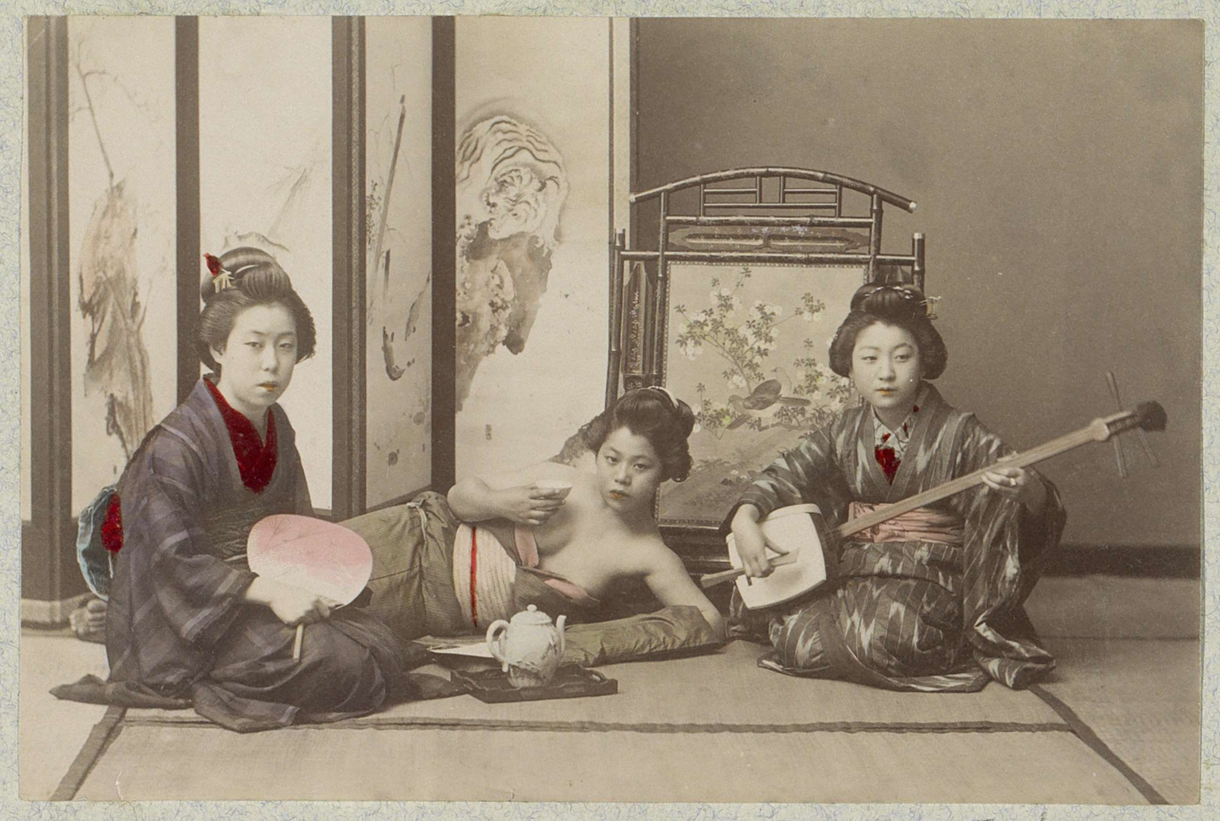Portret van drie Japanse vrouwen bij kamerschermen, ...