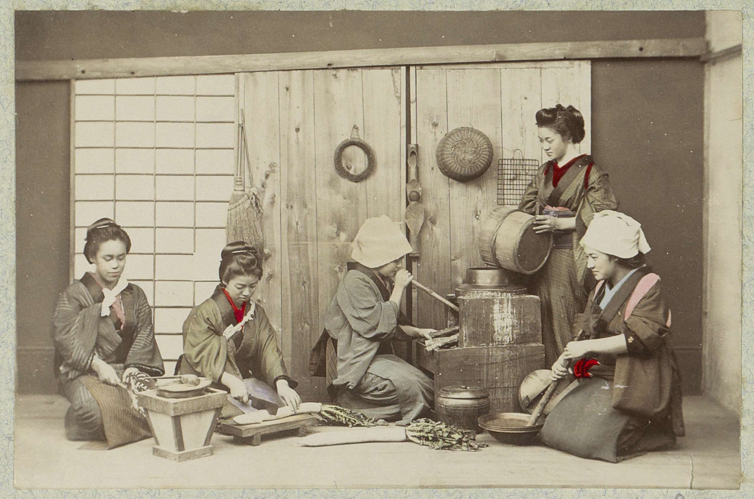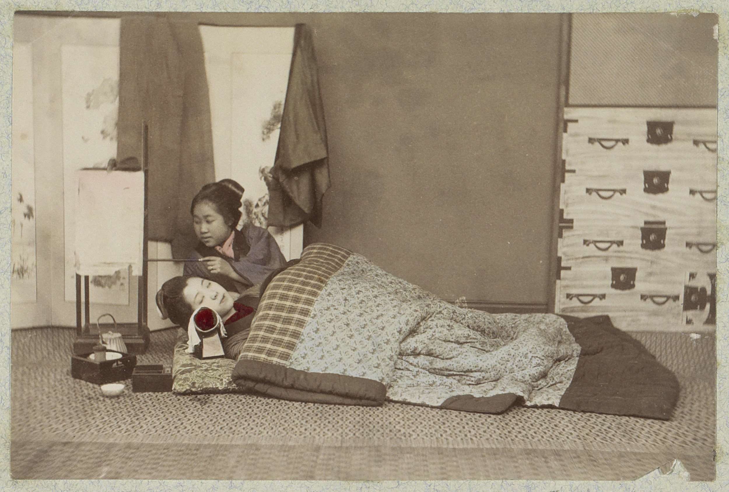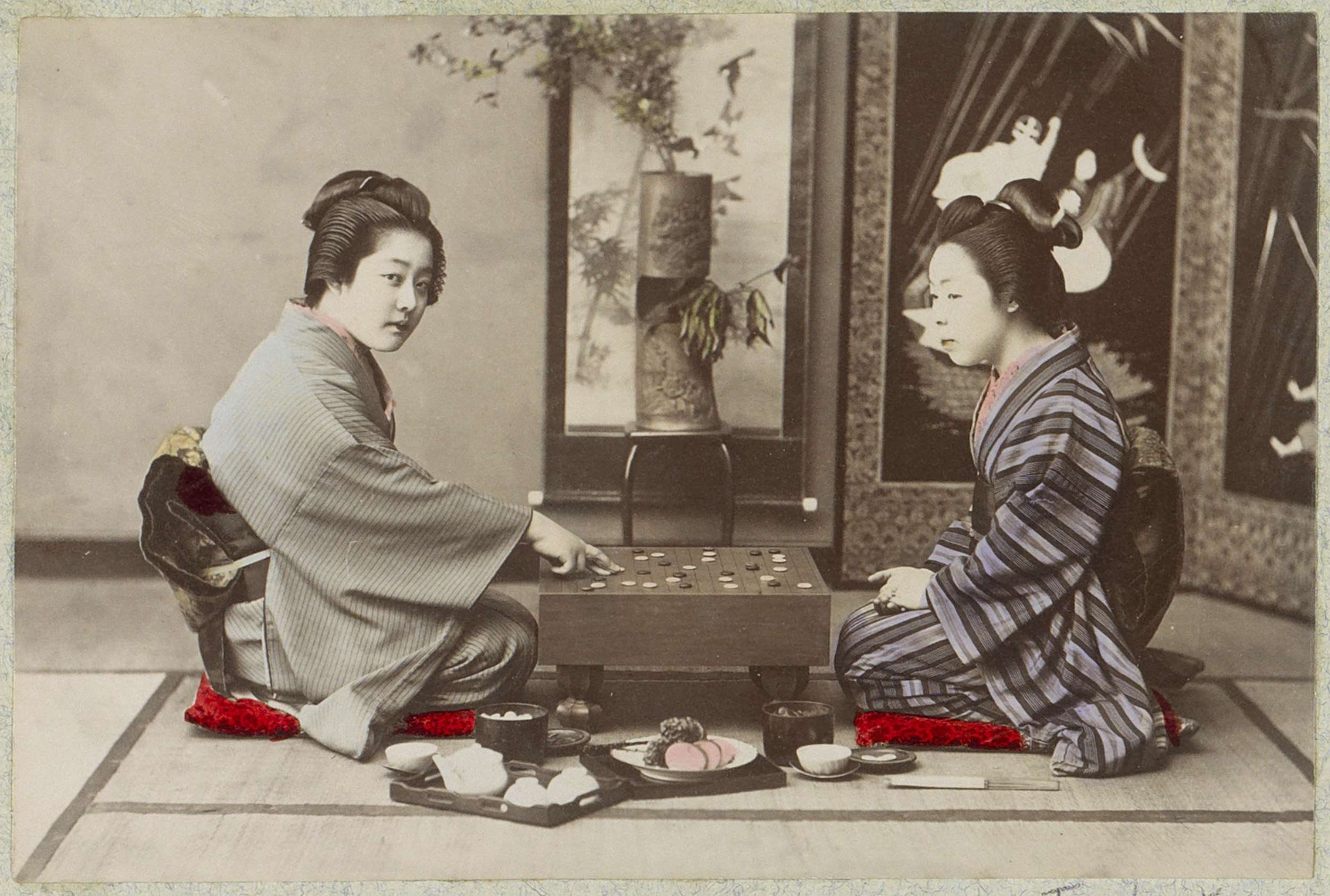 Portret van twee Japanse vrouwen tijdens een bordspel