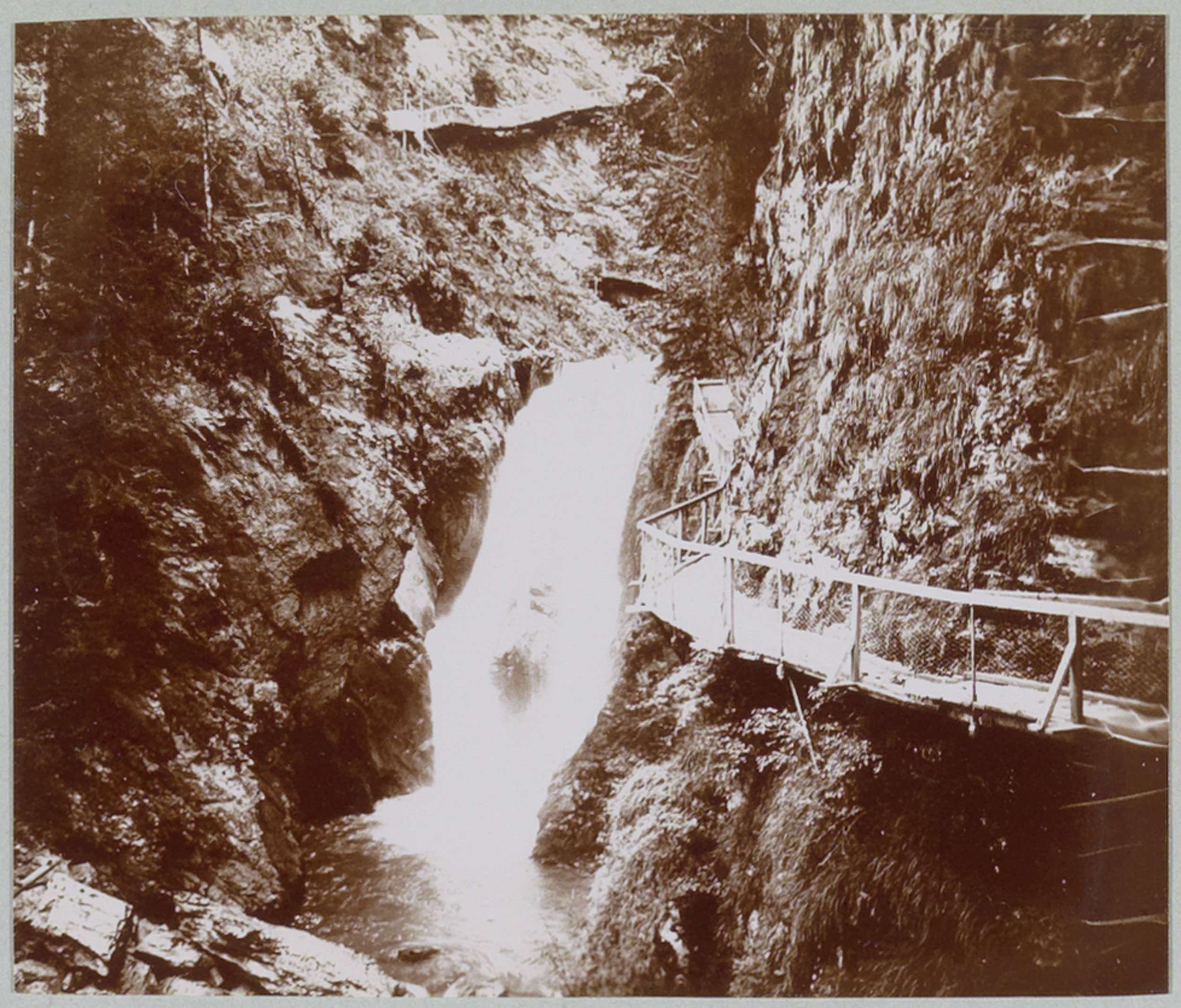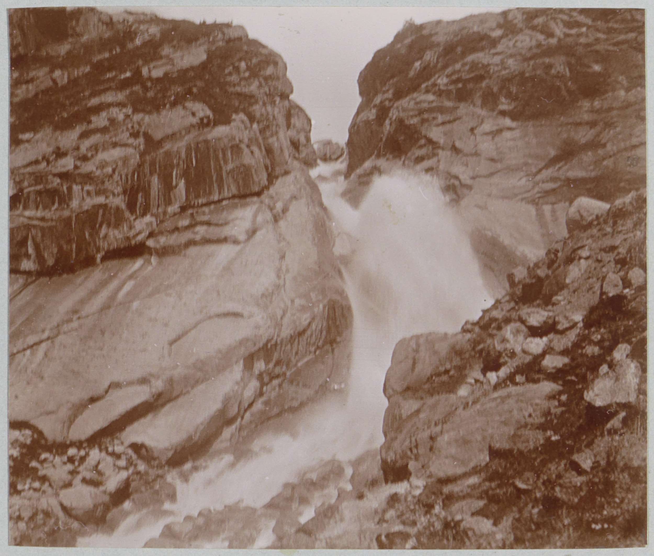 Huizen bij een rotsachtige rivierbedding met rechts ...