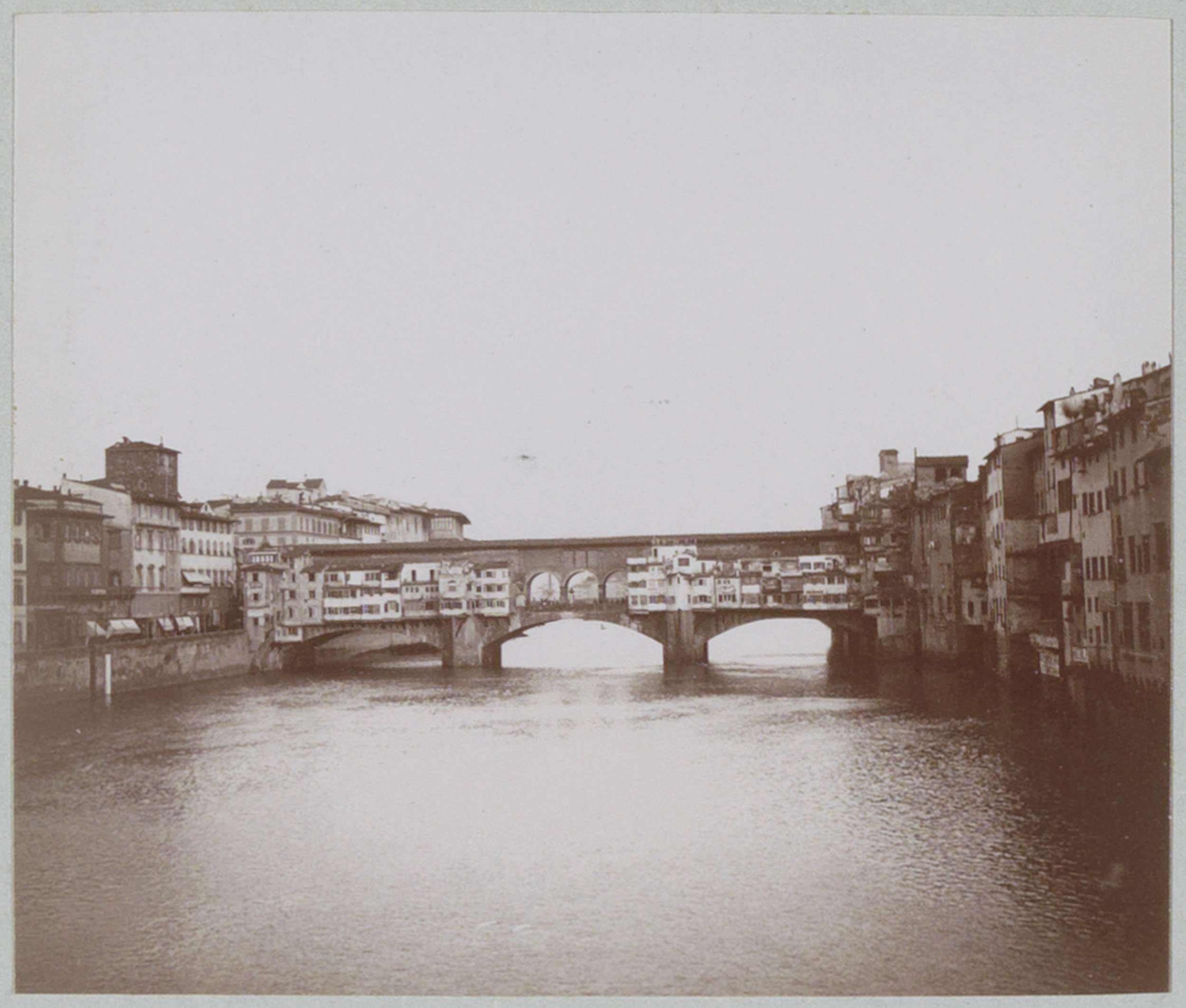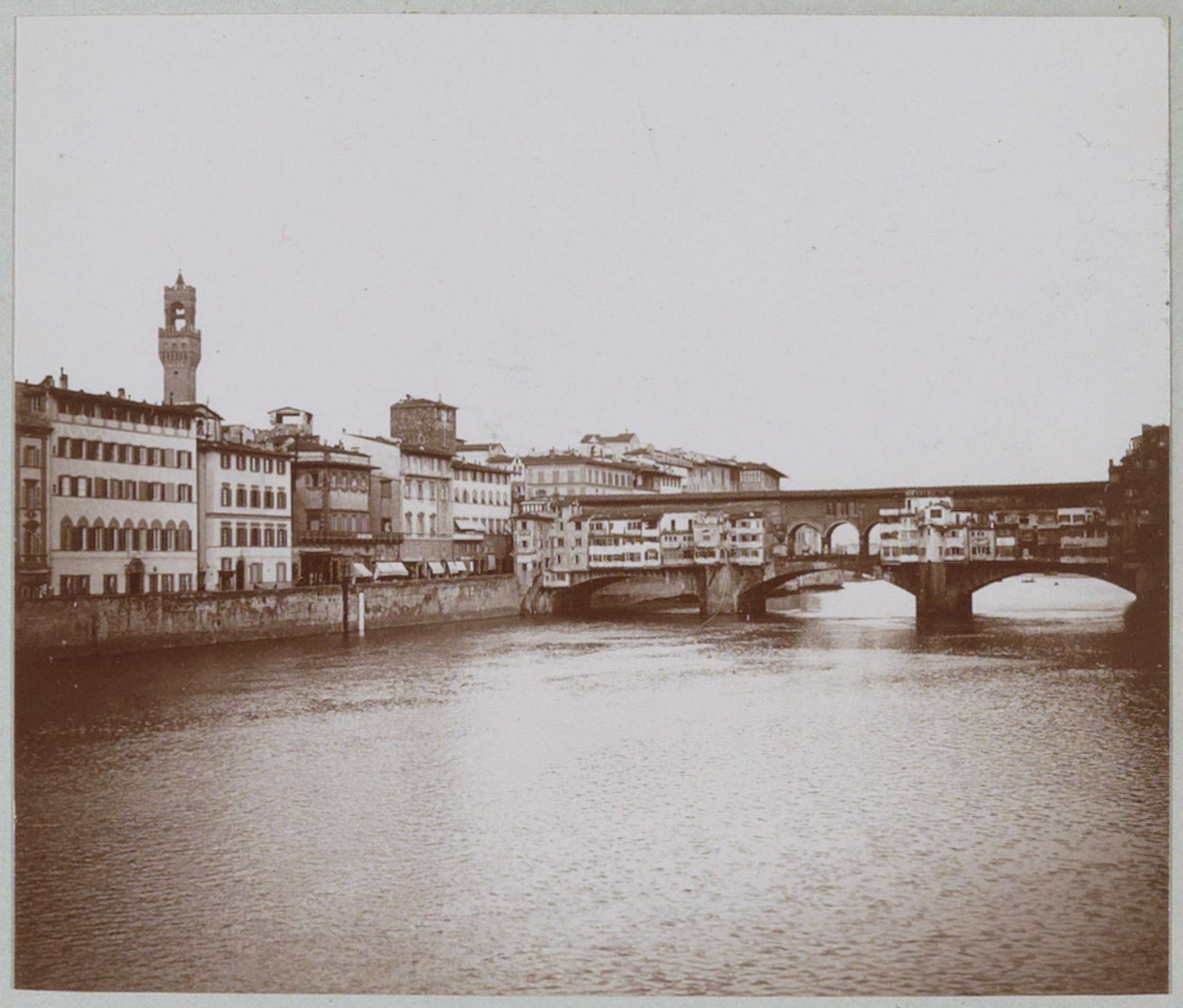 Gezicht op de Ponte Vecchio en een oever van de Arno...
