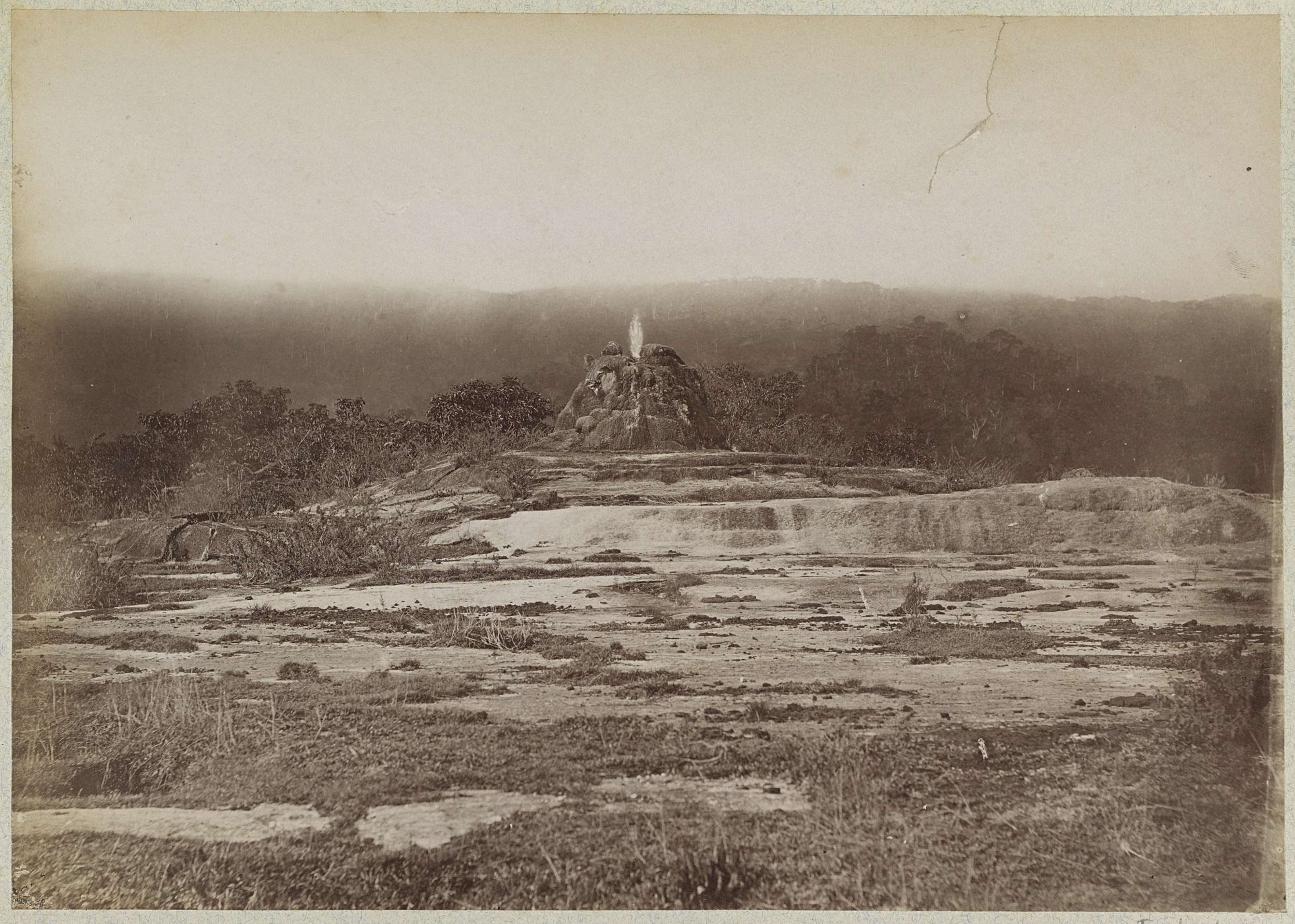 Vulkanisch landschap met rookpluim, vermoedelijk op ...