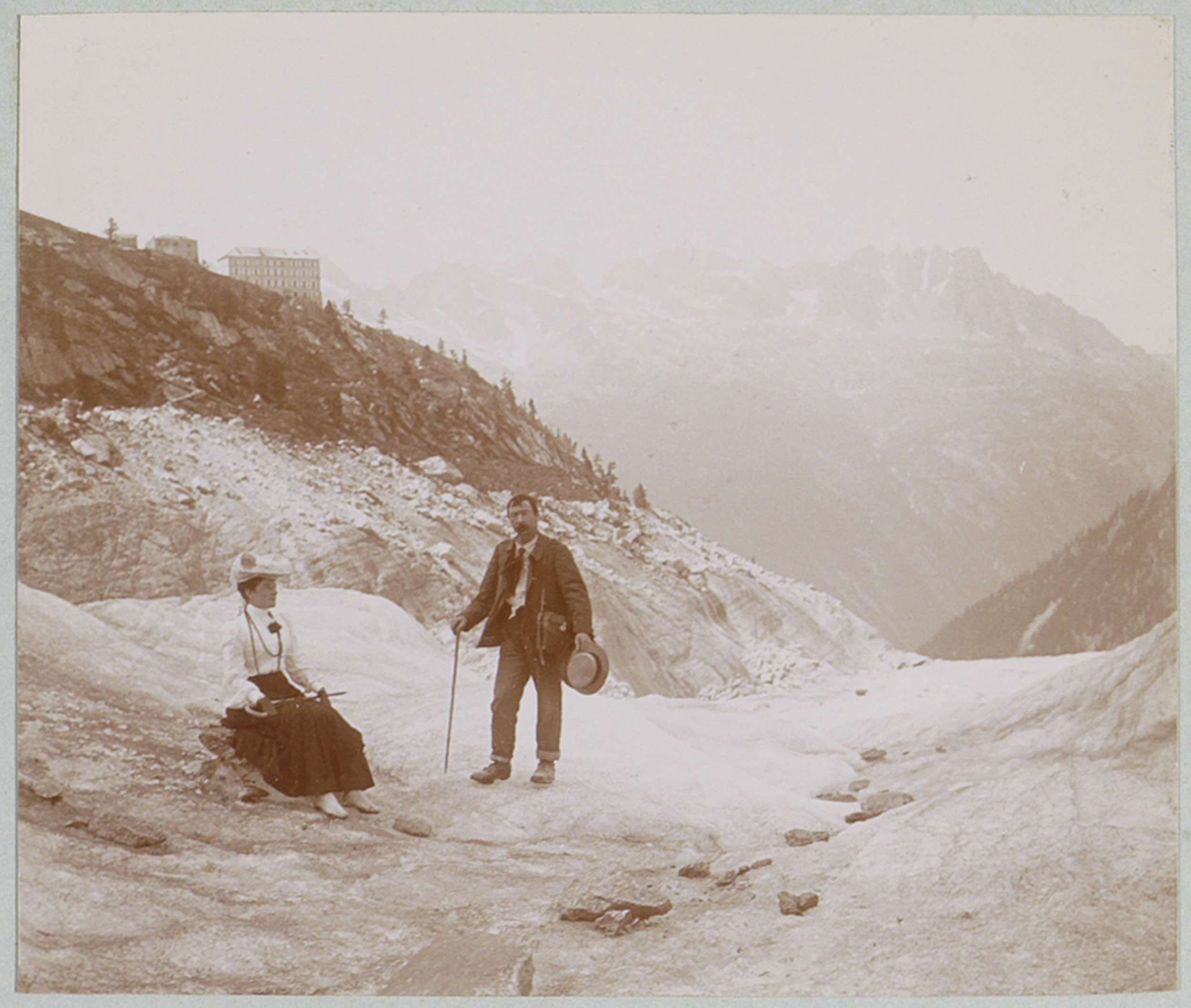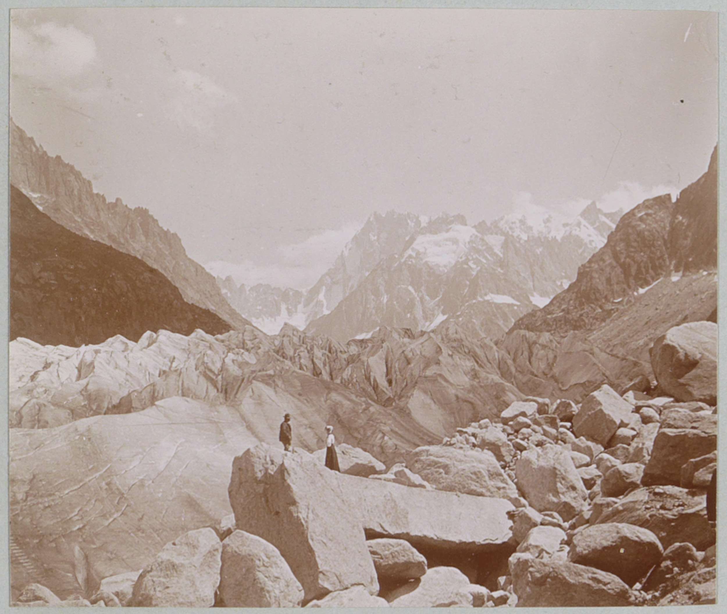 Man en een vrouw temidden van rotsblokken en bergen ...