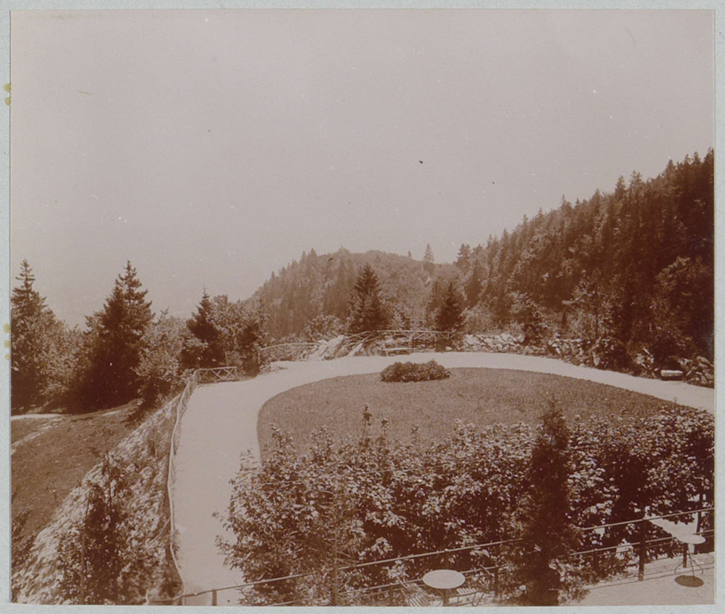 Toegangshek met lantaarns in bosrijke omgeving, verm...
