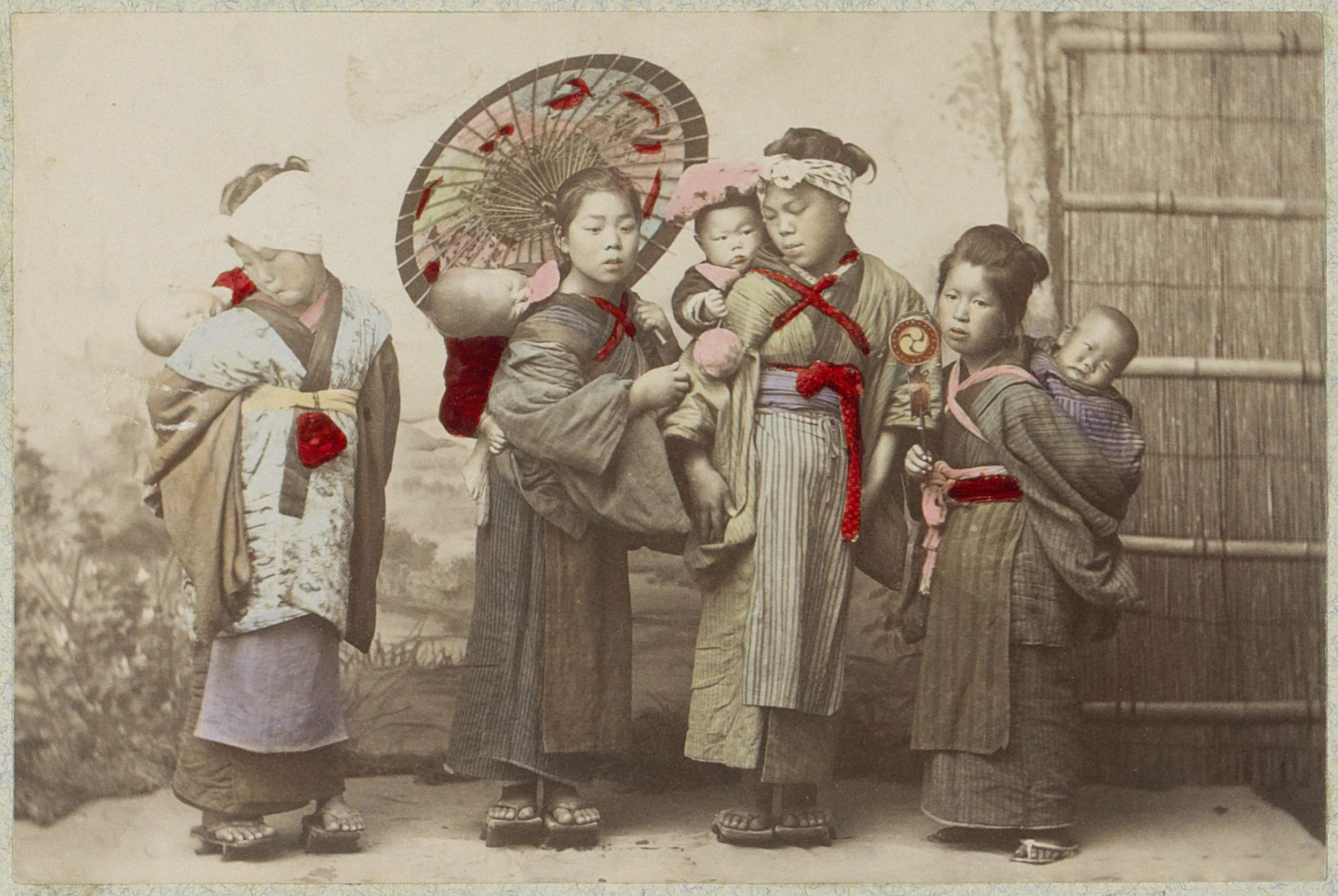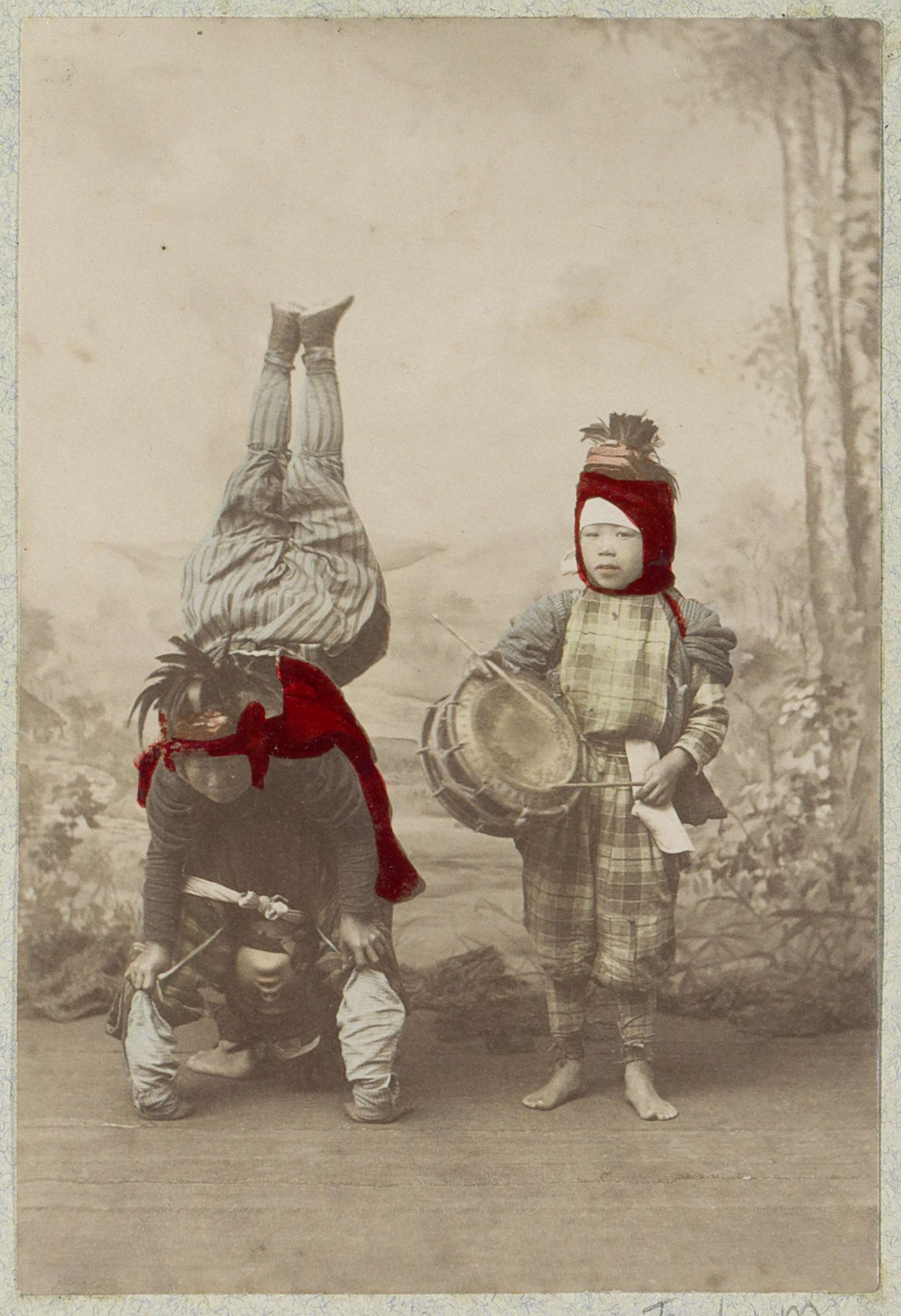 Portret van drie Japanse kinderen: één trommelaar, t...