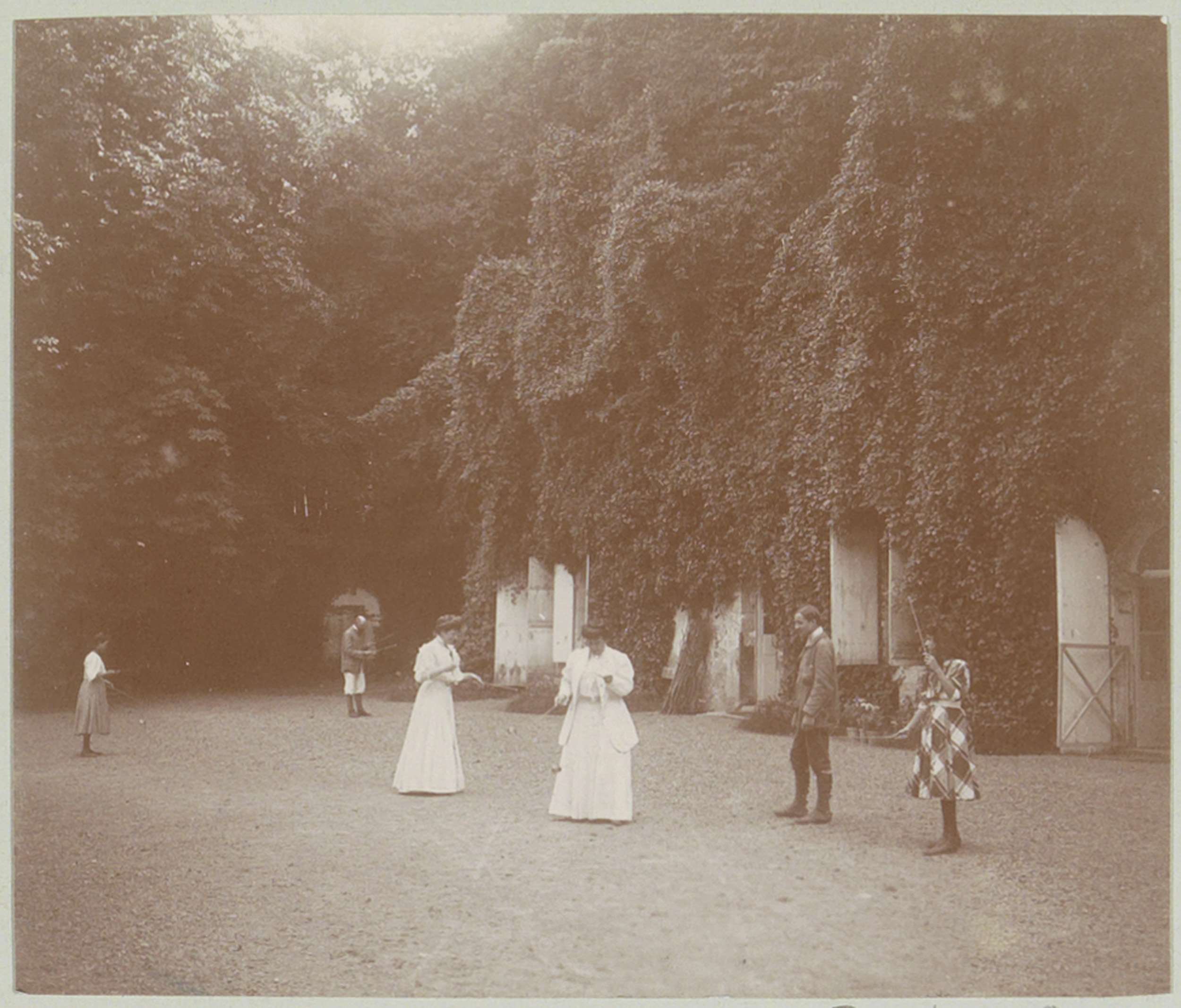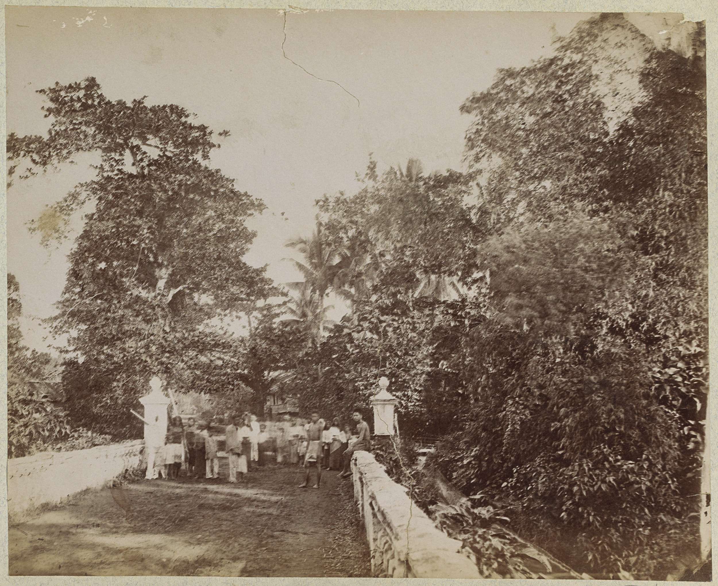 Mensen voor een gebouw met pilaren, vermoedelijk in ...