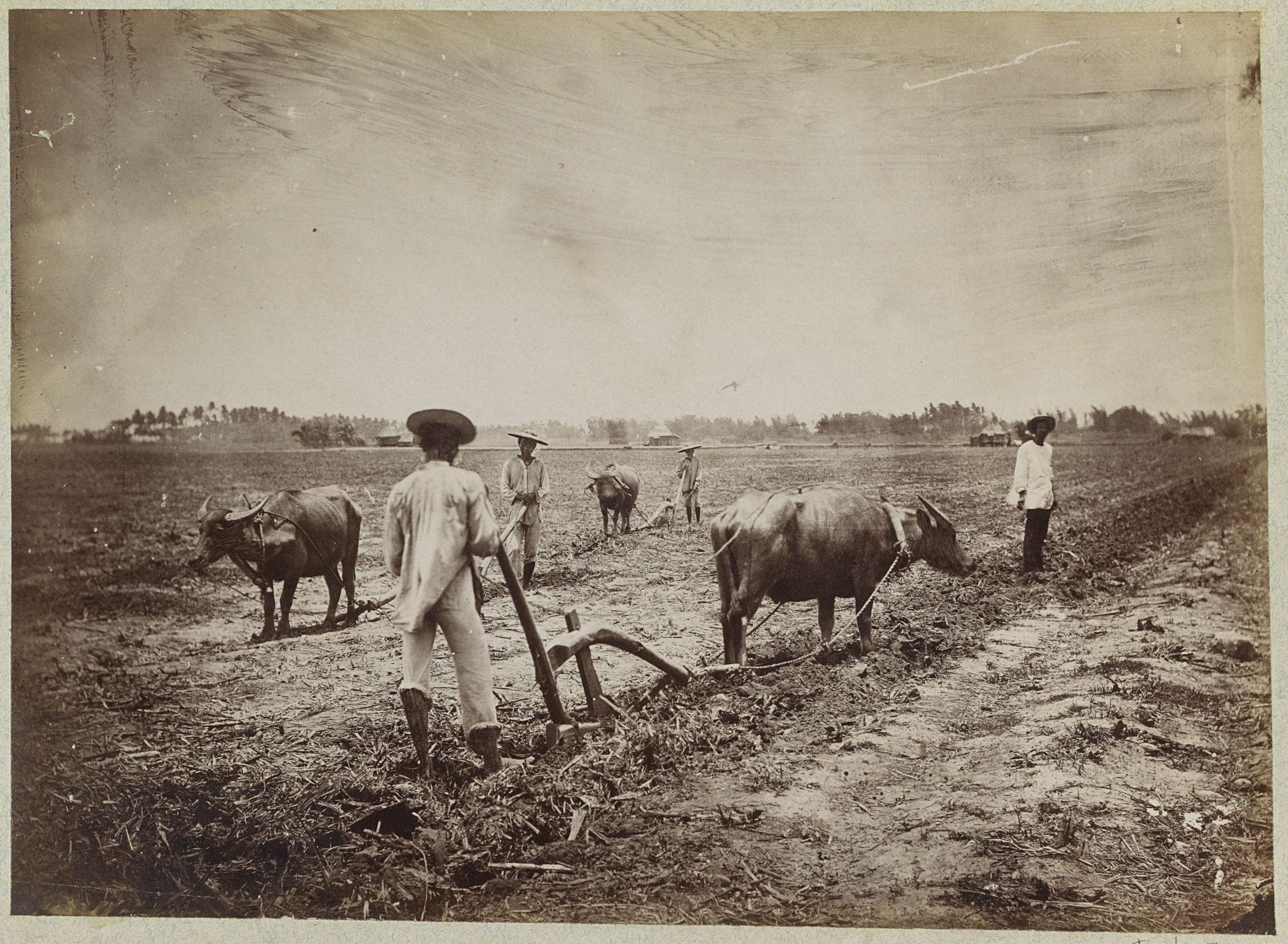 Vier ploegende landbouwers met ossen, vermoedelijk o...